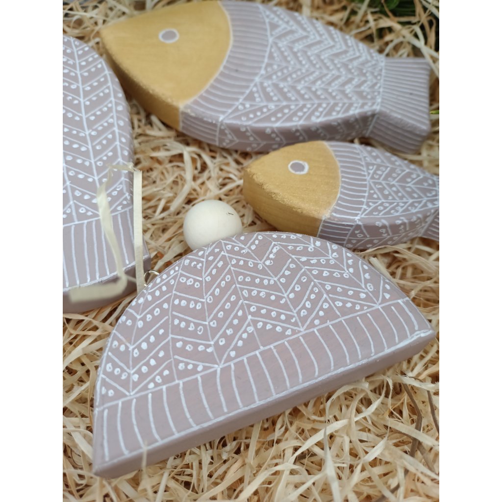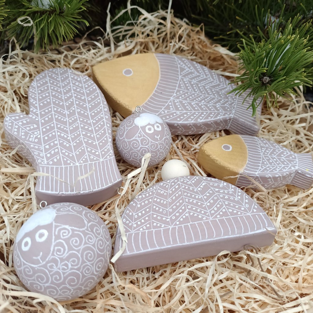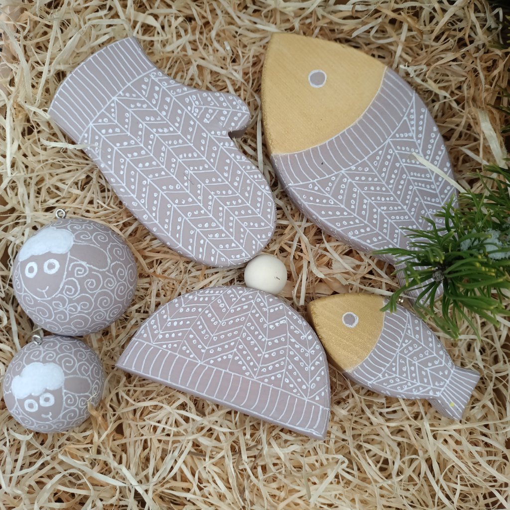 Sada dřevěných ozdob s originálním ručně kresleným vzorem pleteného kakaového svetru. Dodáváme zabaleno v papírové krabičce. Na výběr je velká nebo malá sada. Malá sada obsahuje 4 kusy - malá ryba, velká ryba, čepice a rukavice. Ve velké sadě je 6 kusů - malá ryba, velká ryba, čepice, rukavice, malá a velká ovečka. Všechny tvary mají očko pro zavěšení na stromeček nebo věnec.