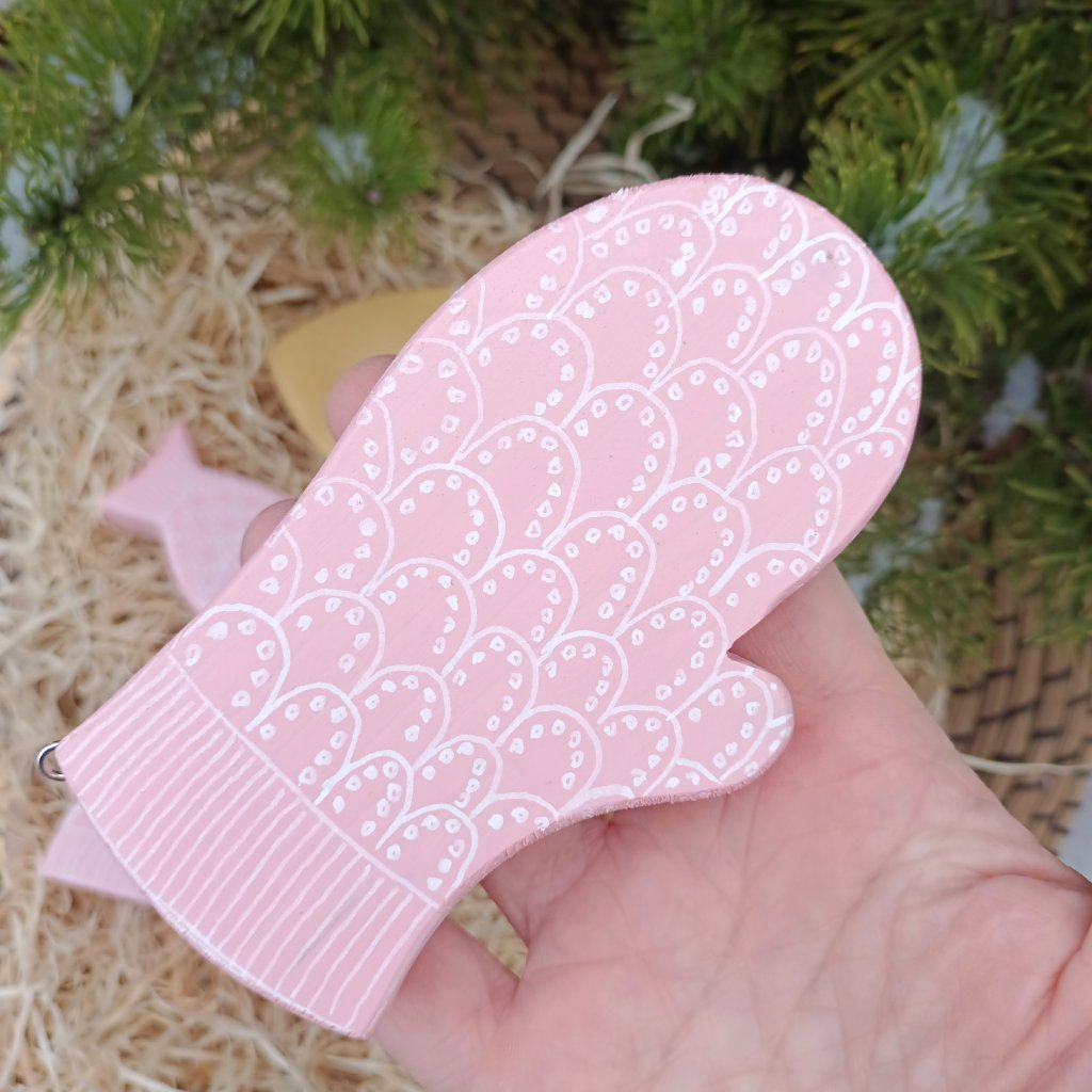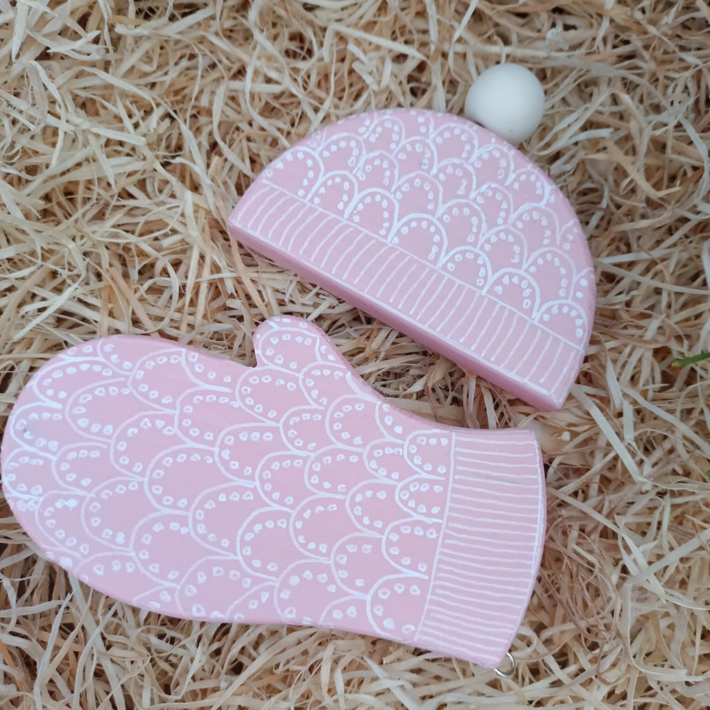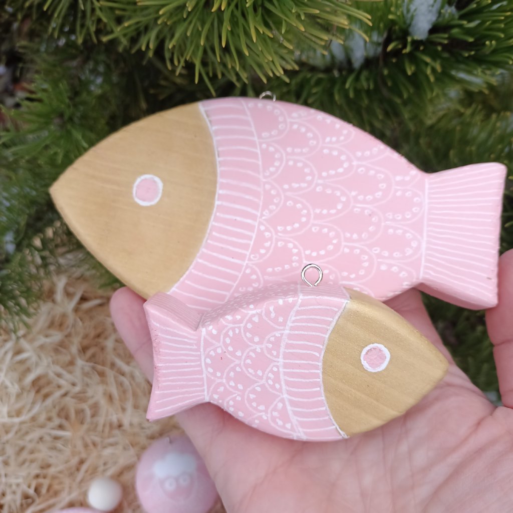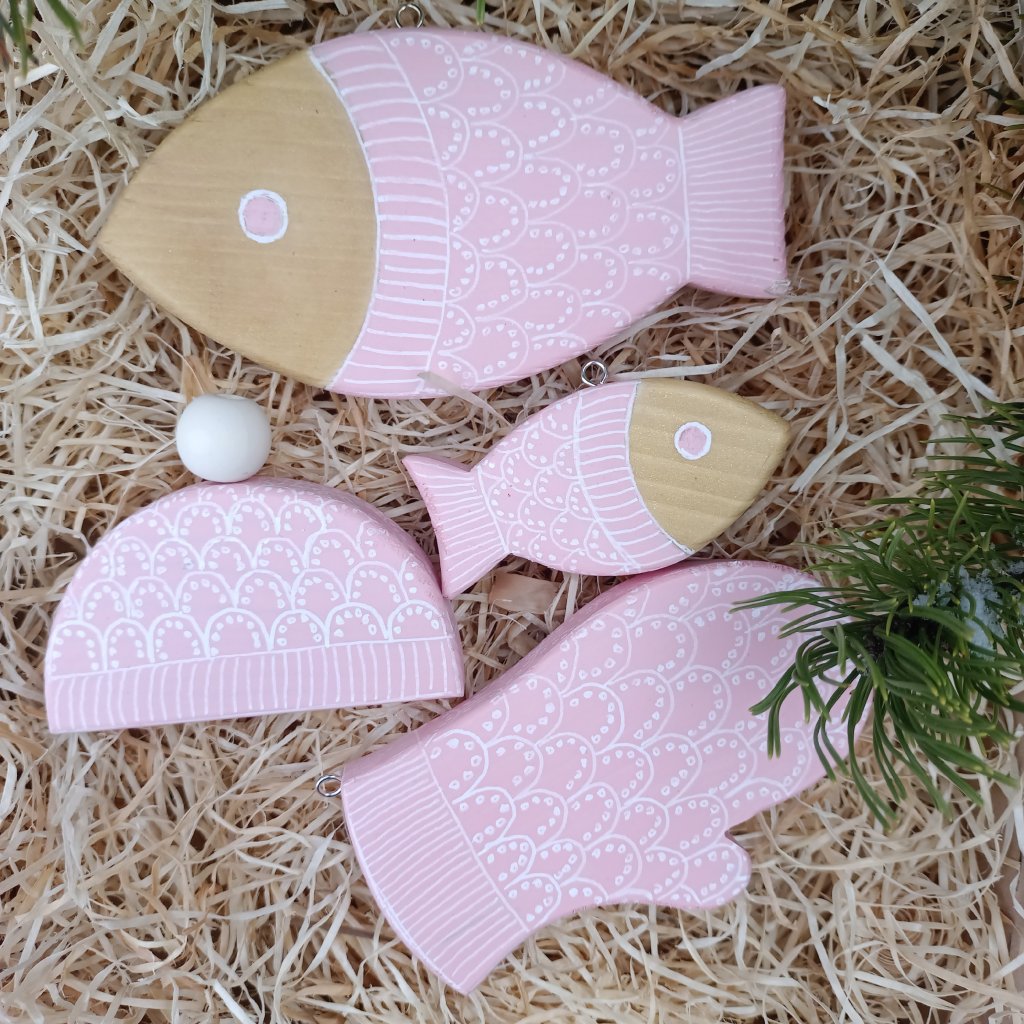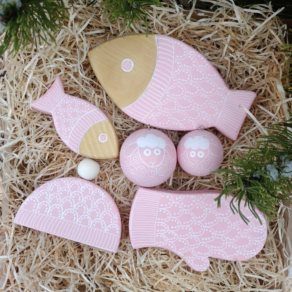 Sada dřevěných ozdob s originálním ručně kresleným vzorem pleteného růžového svetru. Dodáváme zabaleno v papírové krabičce. Na výběr je velká nebo malá sada. Malá sada obsahuje 4 kusy - malá ryba, velká ryba, čepice a rukavice. Ve velké sadě je 6 kusů - malá ryba, velká ryba, čepice, rukavice, malá a velká ovečka. Všechny tvary mají očko pro zavěšení na stromeček nebo věnec.