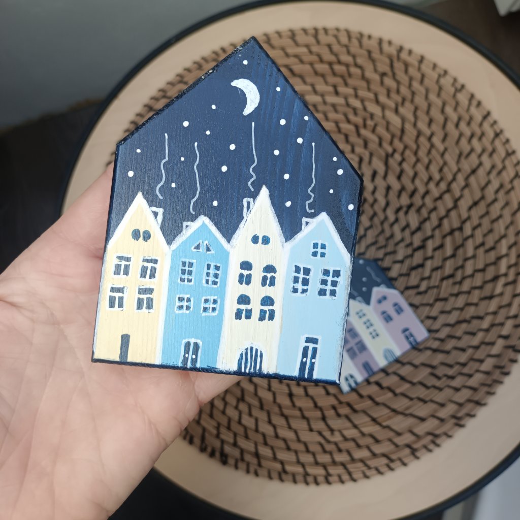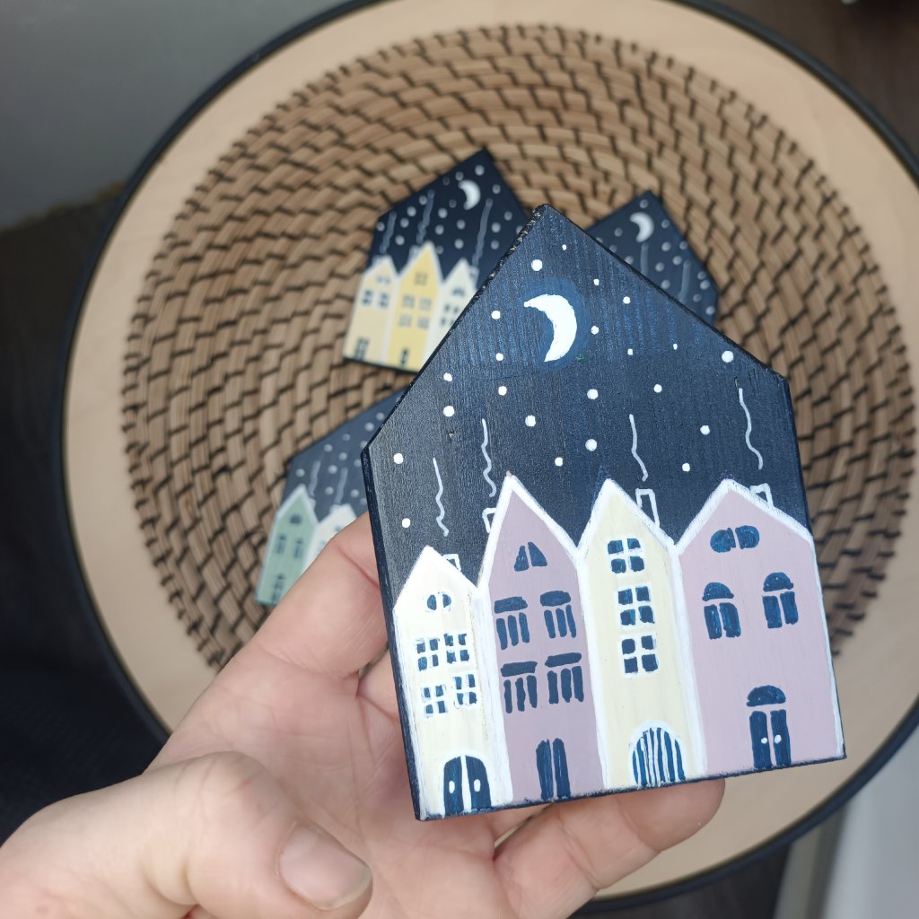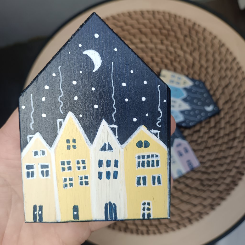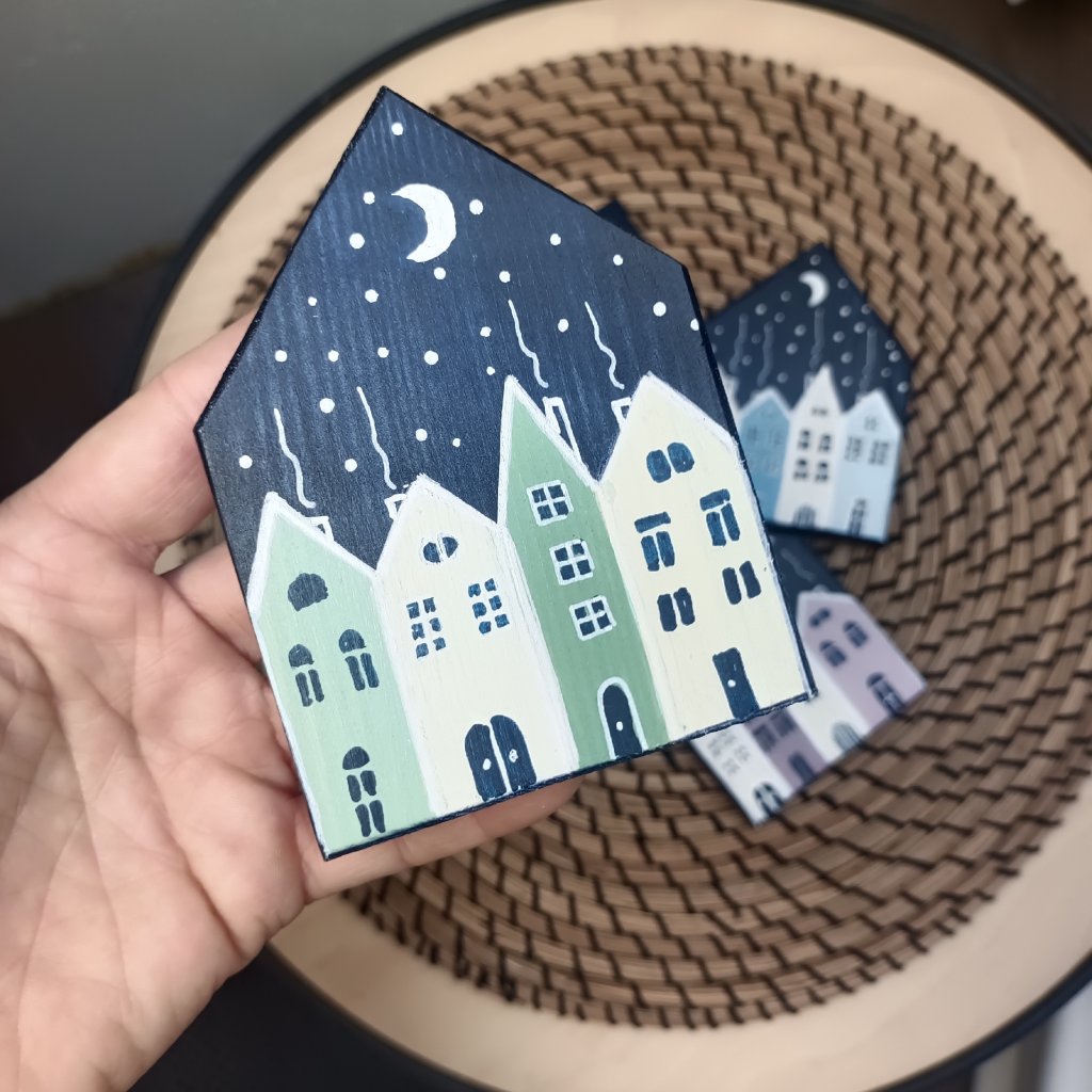Podtácky tvaru domečku jsou oboustranně vymalované barevnými domečky. Každý domeček v jiných barvách, takže pokud si na některý postavíte skleničku, hned víte která je ta Vaše. K domečkům zasíláme malá očka, pokud budete chtít můžete díky nim využít podtácky i jako zavěšené ozdoby na stromeček.