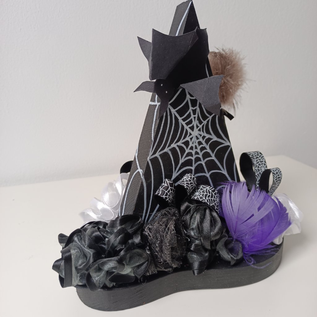 Ručně malovaný a dekorovaný čarodějnický klobouk s fialovými doplňky. vhodný pro podzimní nebo halloweenské dekorace.