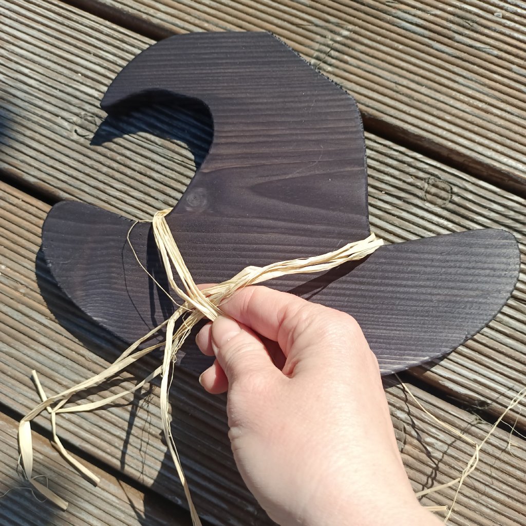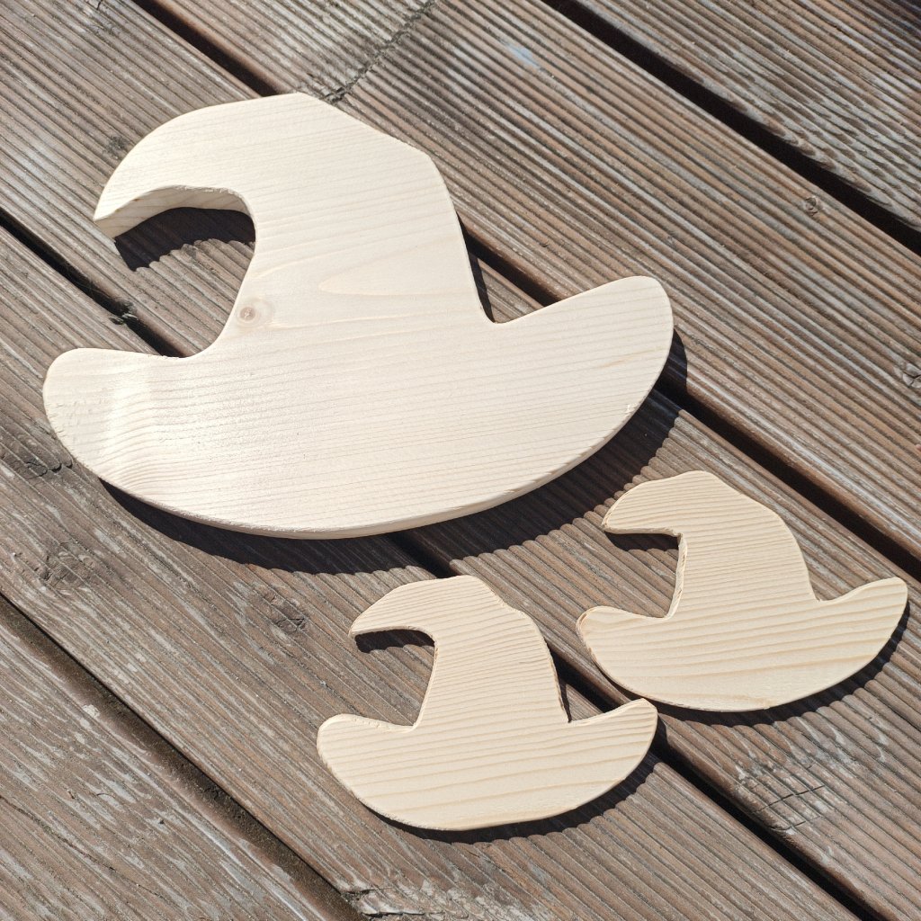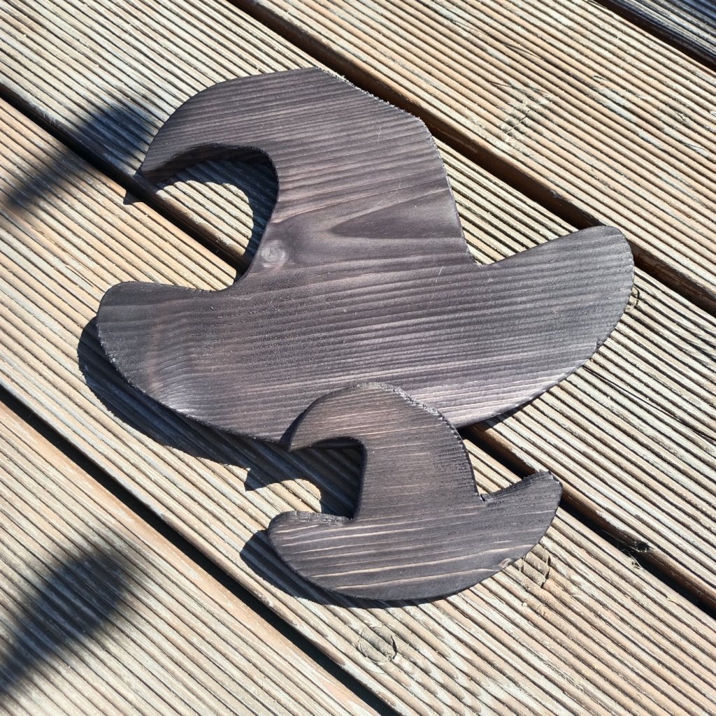 Dřevěný čarodějnický klobouk ze smrkového dřeva o síle 2cm. Vhodný jako dekorace pro halloween, čarodějnické večery. Tématická dekorace k upevnění na dveře nebo do zádveří, vytvoření atmosféry akce.