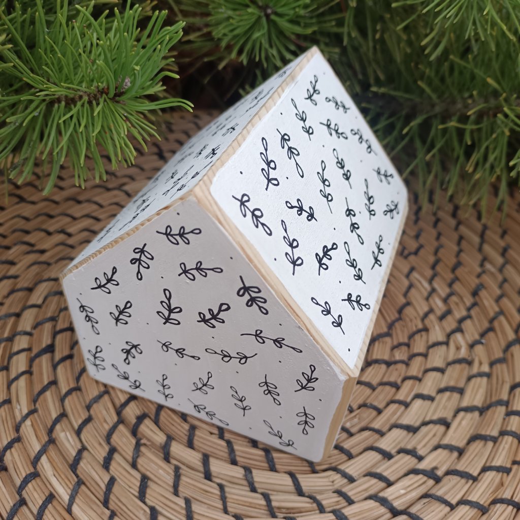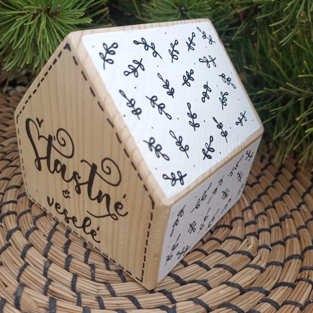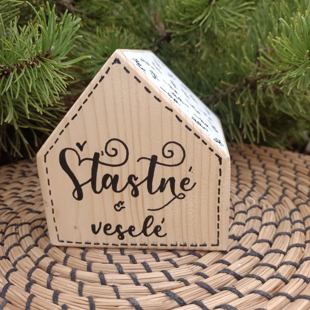 Dřevěný domeček s ručně psaným nápisem Šťastné a veselé na přední straně. Text je vytvořen ve stylu moderní kaligrafie. Ostatní strany a střecha jsou bílé s přírodním okrajem a malovanými lístečky, což vytváří jemný a harmonický vzhled. Každý kus z této autorské dílny je originál.