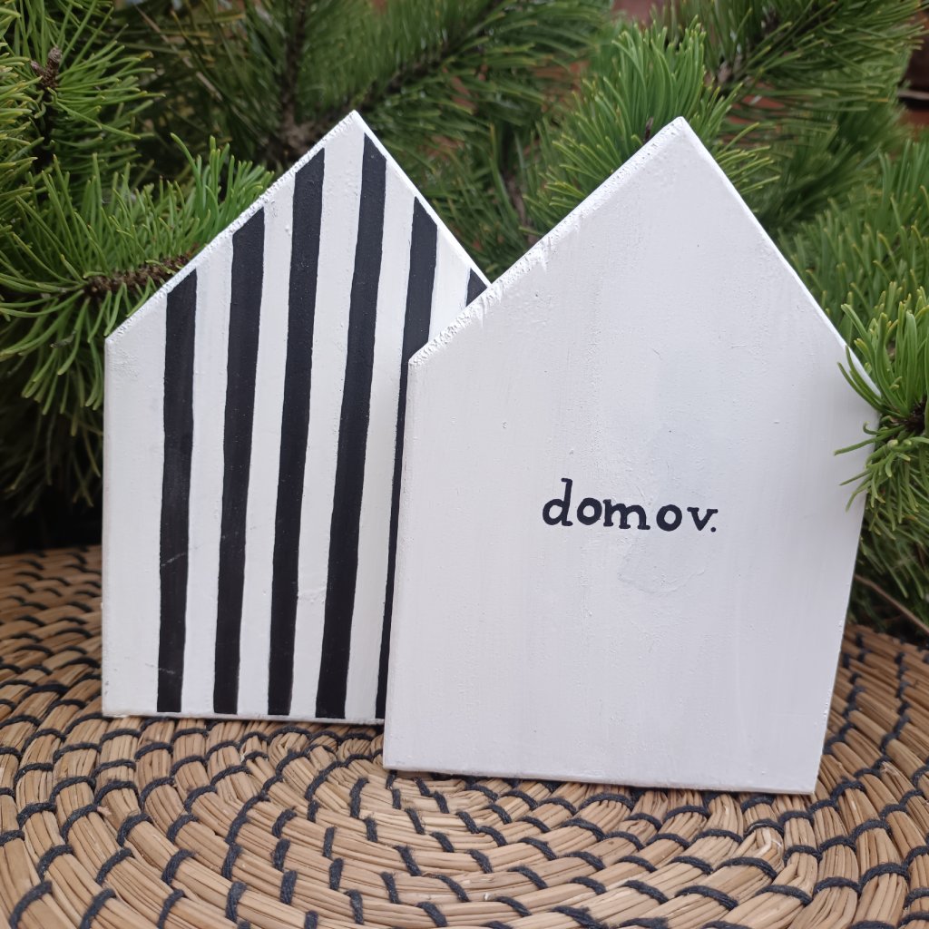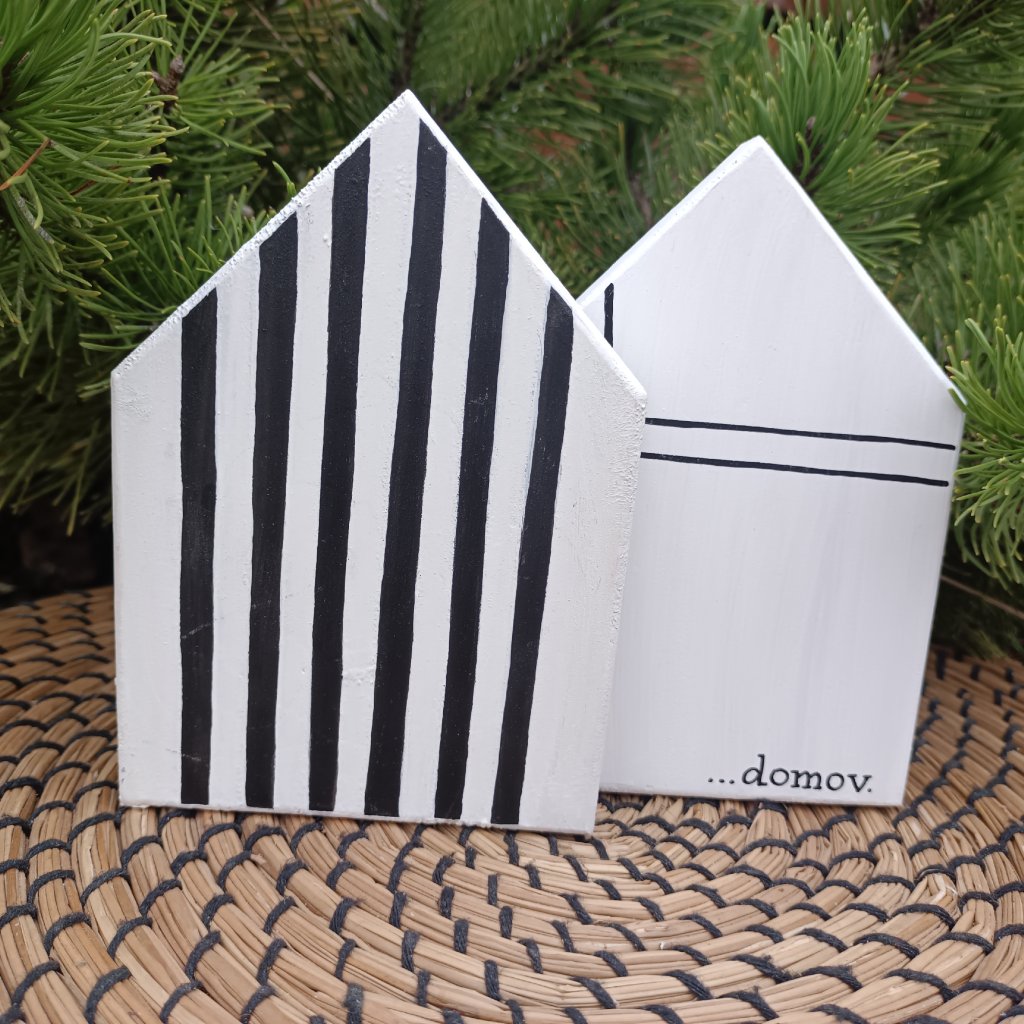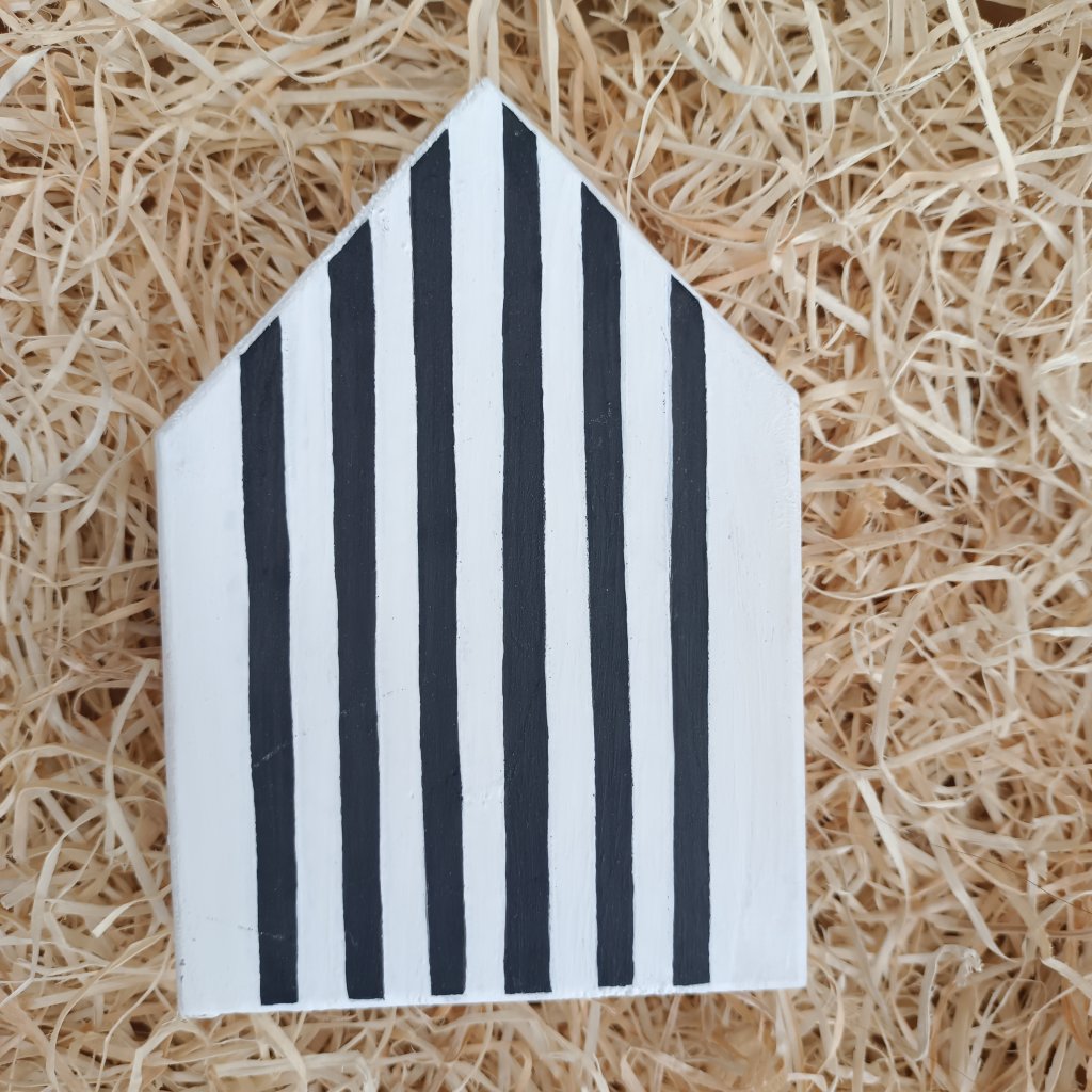 Dřevěný domeček z originální autorské dílny v provedení bílá s ručně malovanými černými pruhy. Kresba je jednostranná. Hodí se k domečkům s kaligrafickým textem "domov" stejné autorky. Zasíláme v celofánovém sáčku.