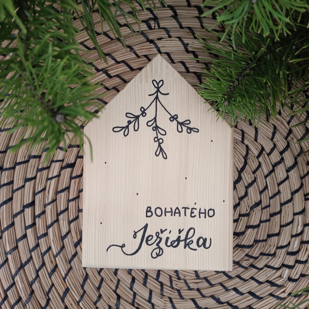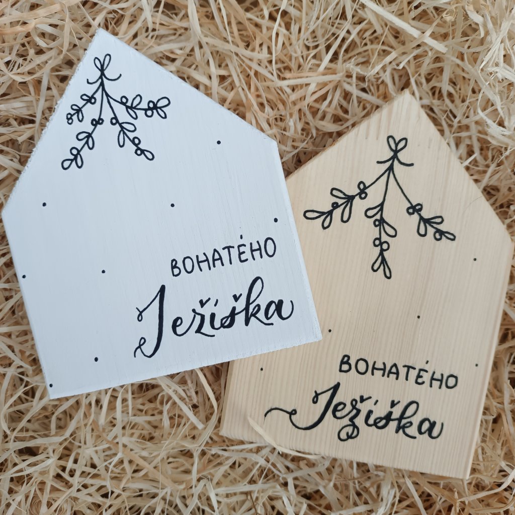 Dřevěný domeček z originální autorské kolekce přeje BOHATÉHO Ježíška ručně psaným černým textem. Doplněno ručně malovanou kresbou jmelí a puntíky. Kresba je jednostranná, zadní strana domečku zůstává bez popisu. Na výběr ve dvou variantách - bílé nebo přírodní. Skvěle se kombinují s vybranými přírodními domečky z naší nabídky. Zasíláme v celofánovém sáčku.