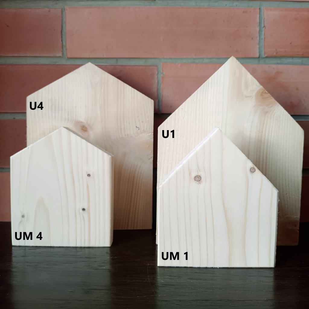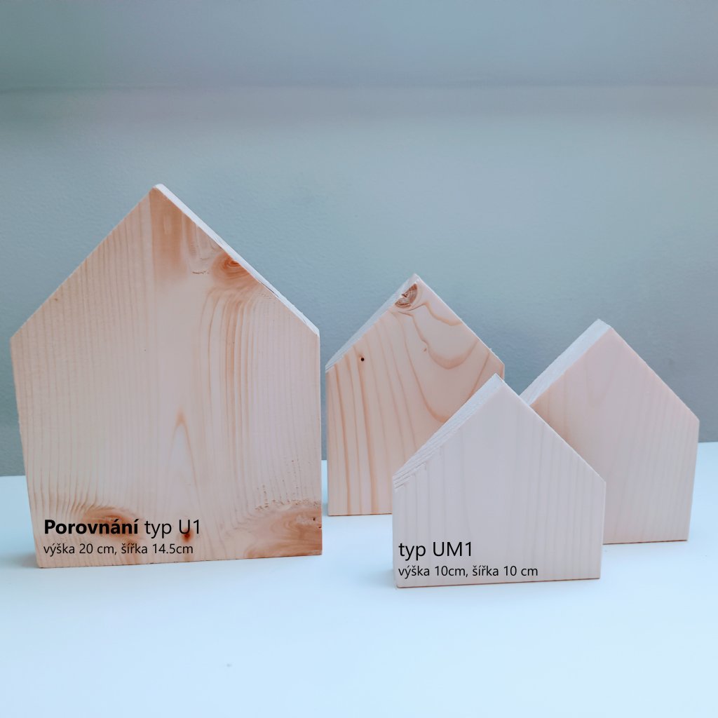 POZN: Na ilustračních fotografiích je záměrně zdůrazněný rozdíl mezi domečky U a UM. Tyto domečky mají stejnou tloušťku materiálu a rozdíl spočívá především v šířce a celkové velikosti. Domečky UM jsou široké 10cm (typ U 14,5cm) a k tomu jsou přizpůsobené i výšky. Tyto řady je možné kombinovat podle potřeby, domečky mají stejnou hloubku 2cm.