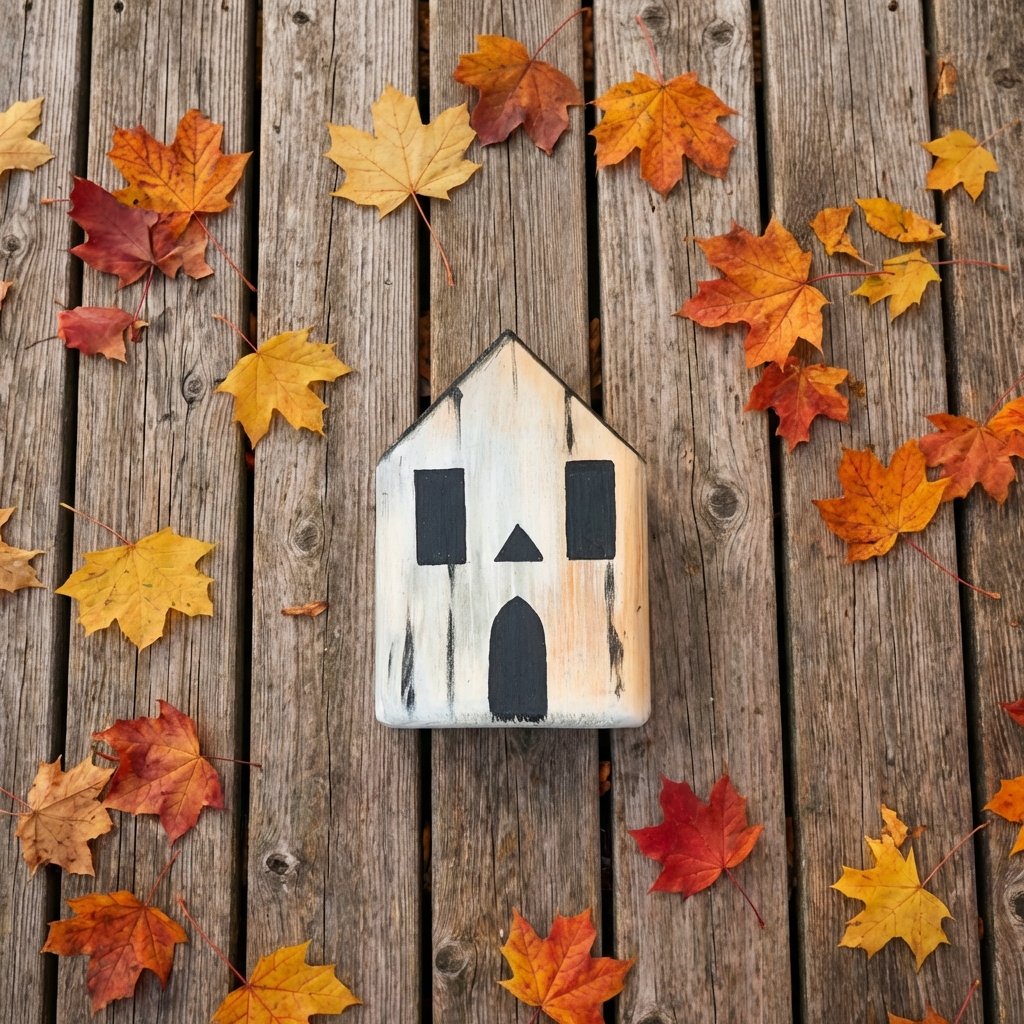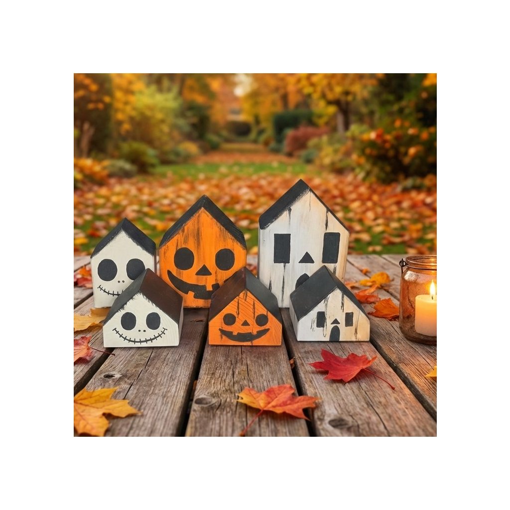 Dřevěné smrkové domečky různých velikostí malované autorkou BohuOwlEye do podzimních barev v halloweenském stylu. Barveno akrylovými barvami, zalakováno pro větší odolnost. Hodí se do interiérových i exteriérových dekorací. Na výběr dvě velikosti (větší a menší domeček) a trojí design. Využijte jako drobnou solitérní dekoraci v kostýmu dýně, ducha, lebky kostlivce, nebo si postavte celé halloweenské město z více domečků různých barev a velikostí.