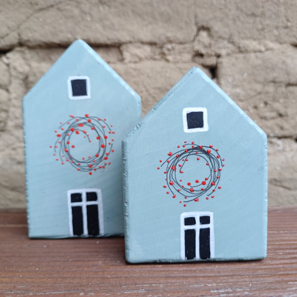 Malé dřevěné domečky z autorské dílny v pastelové barvě a s ruční kresbou oken a věnečku s červenými bobulemi nade dveřmi. Hodí se jako drobný solitér, do větších svátečních dekorací, nebo dárek. Dodáváme v celofánovém sáčku s možností přiobjednat dárkové balení.