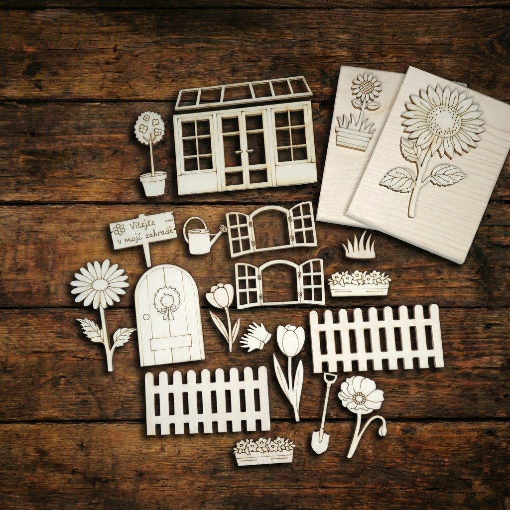 Detailně propracované výřezy z překližky s tématem zahrada. Jednotlivé výřezy byly navrženy u nás a jsou tedy jedinečné - žádná veřejná koupená šablona, ale originál od nákresu až laserový výřez.
