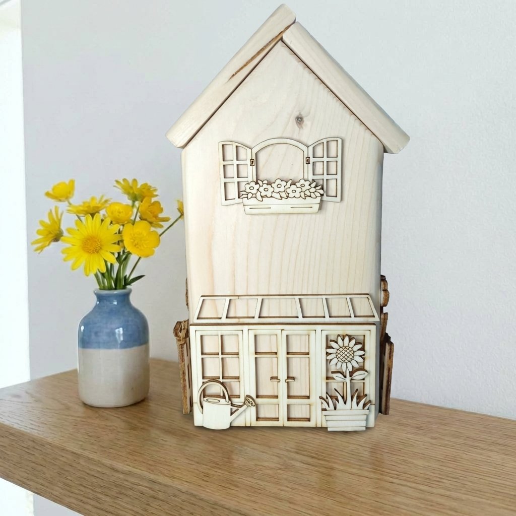 Detailně propracované výřezy z překližky jsme navrhli v naší dílně. Od nákresu až po laserový výřez jsou originálním výrobkem ozivdomov.cz, který jinde nenajdete. Sada obsahuje domeček s okny a dveřmi, rukavice, konvičku, rýč, plot, množství květin a také celý skleník.
