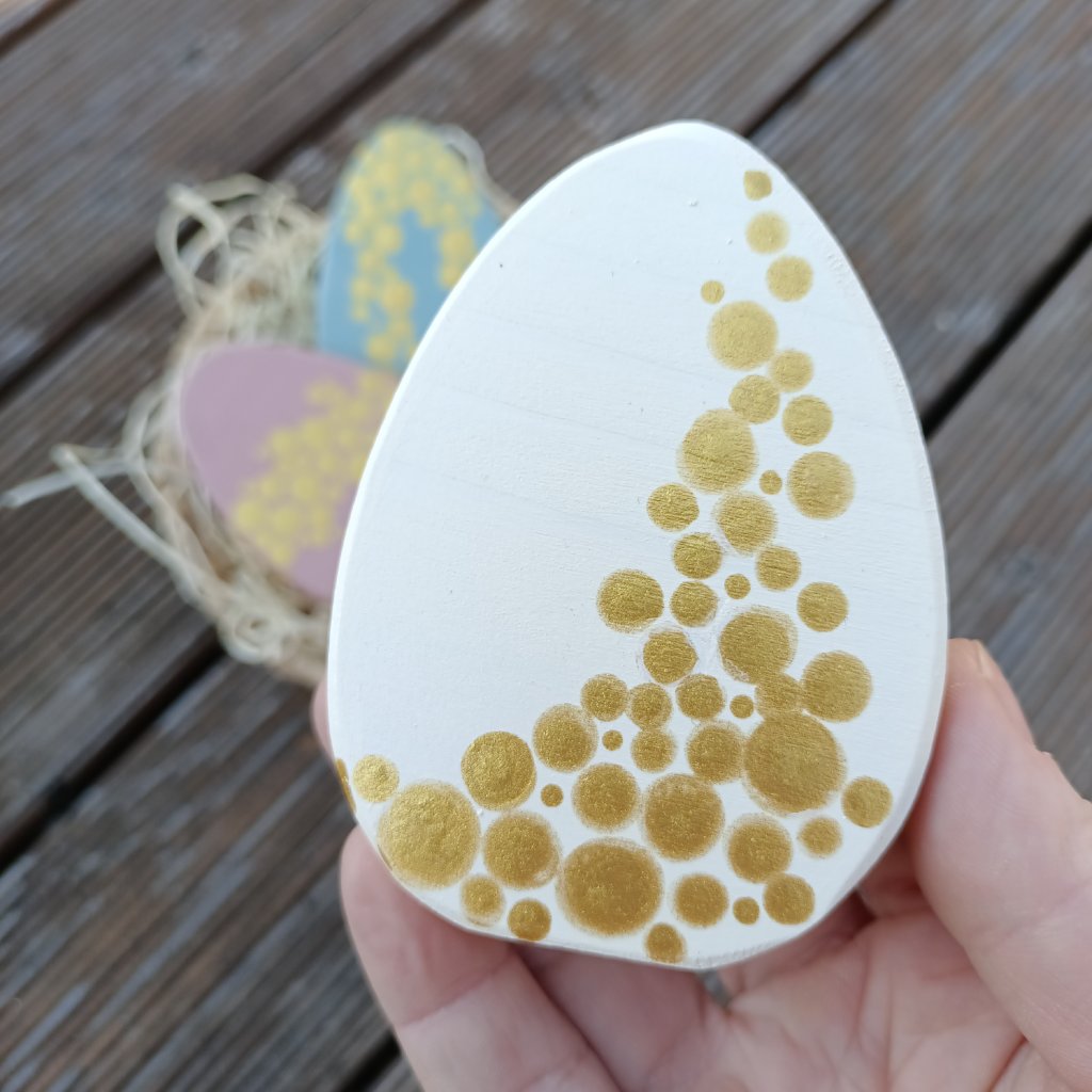 Vejce ze smrkového dřeva v krásných pastelových barvách - modrá, růžová a bílá jsou malovány technikou tečkování. Na každé "kraslici" je uspořádání zlatých bublinek jiné, vajíčka jsou zdobená ze všech stran. Ruční autorská práce z kolekce BohuOwlEye pouze pro eshop ozivdomov.cz.