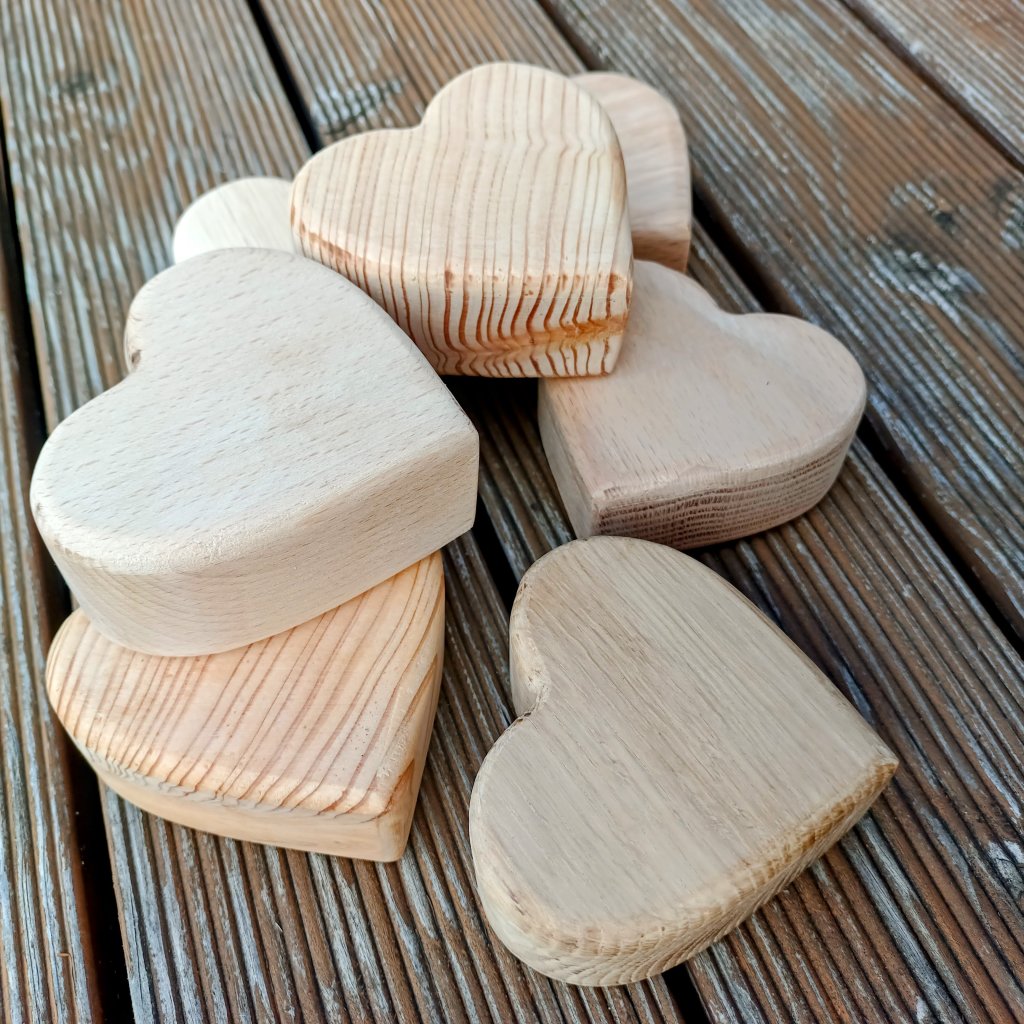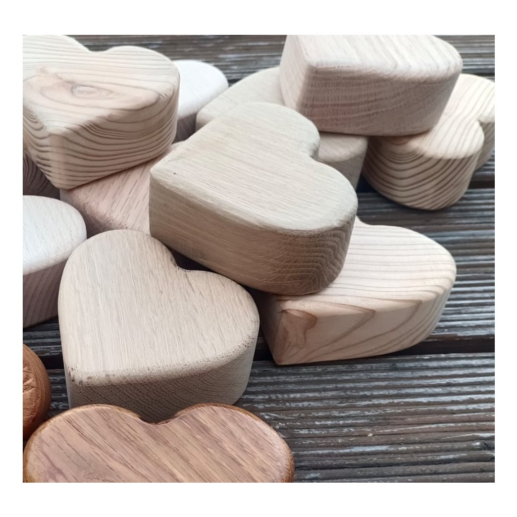 skupina masivních dřevěných srdcí z různých dřevin - přírodní
