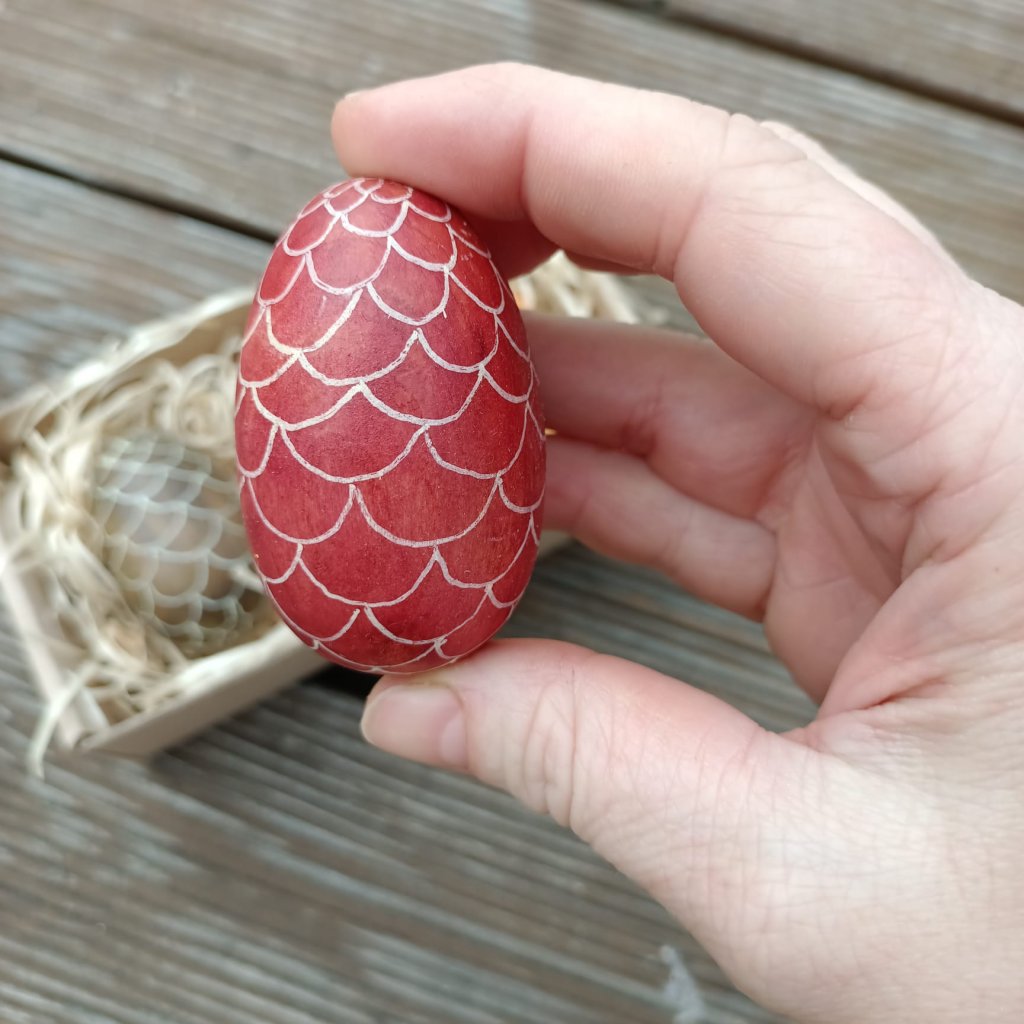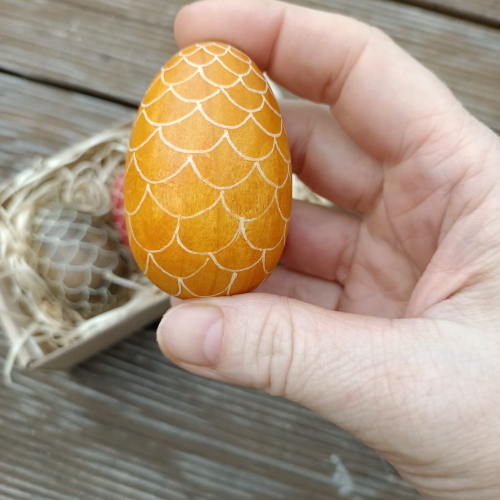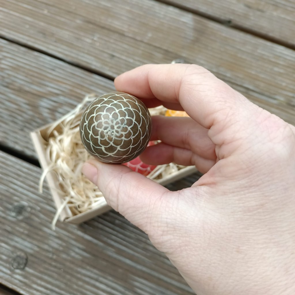 Soustružené vejce s dekorem barevných šišek najde uplatnění nejen v jarní, ale i ve vánoční dekoraci. Každé vajíčko má barevný základ v zemitých přírodních tónech a jednoduše je doplněno akrylovým fixem o šupinky šišek. Velikost je velmi podobná velikosti klasického vejce 6x4cm.