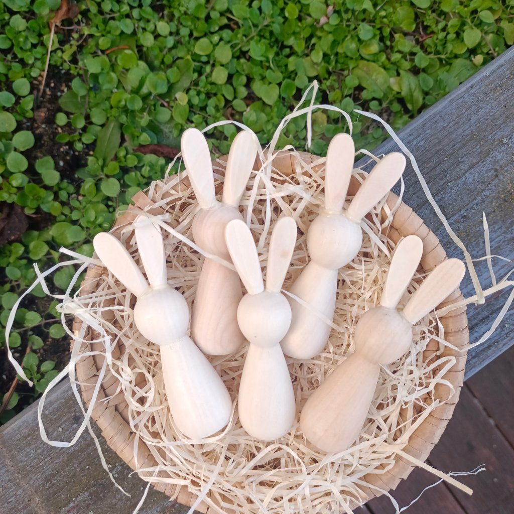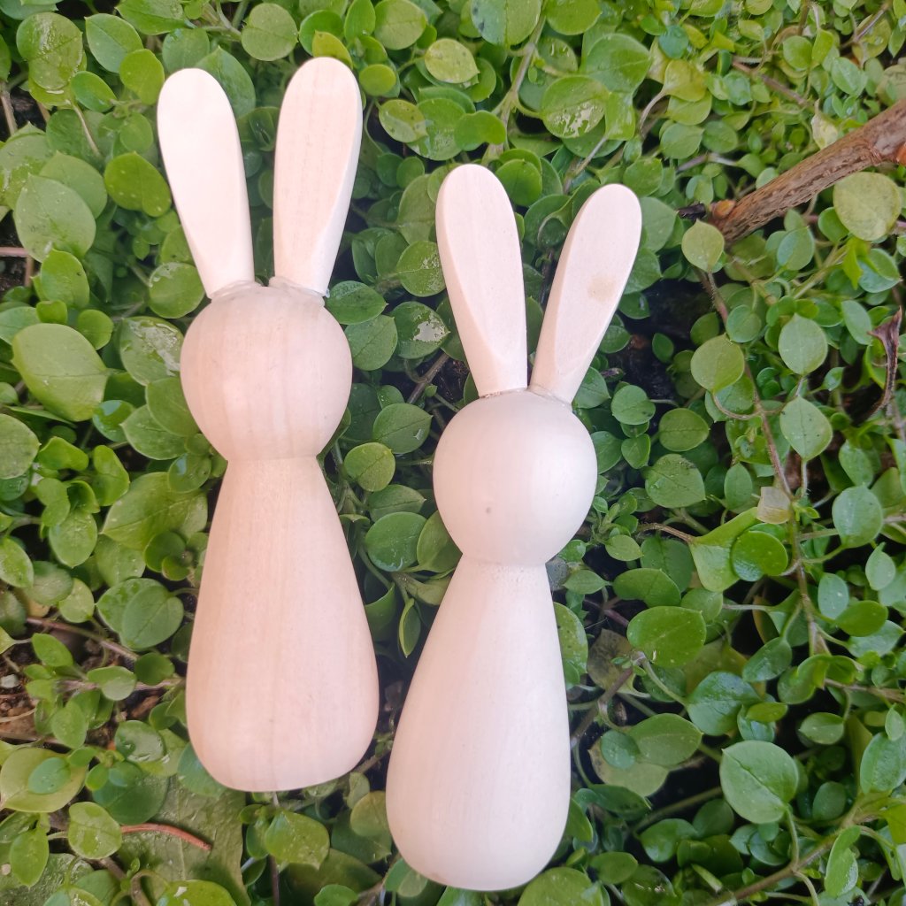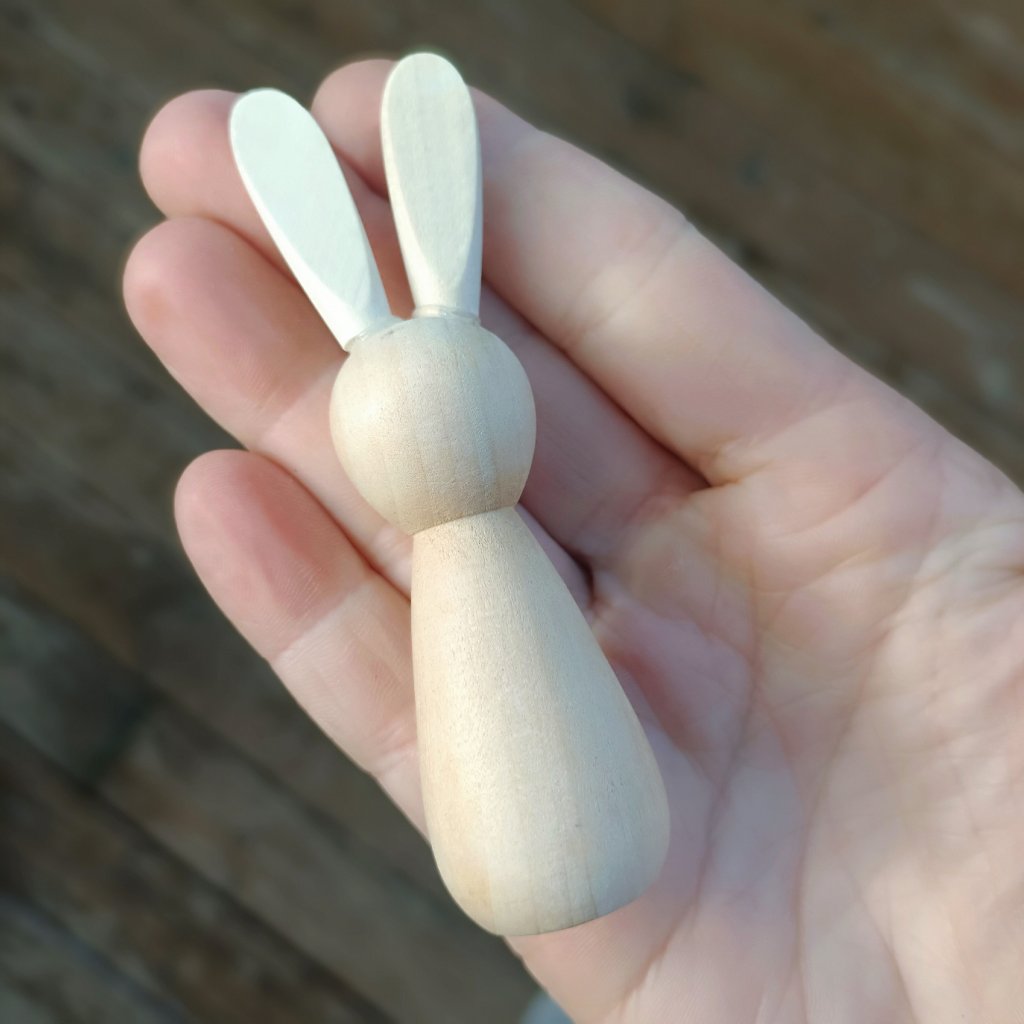 Soustružený zajíček s vlepenými oušky bez povrchové úpravy. Vhodný k natírání, malování, dekorování papírem.