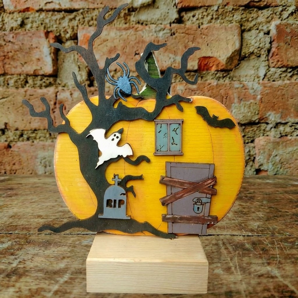 Dýně ze smrkového masivu o tloušťce 2 cm tvoří spolu s překližkovými výřezy kompletní DIY sadu "STRAŠIDELÝ LES". Pro snadné sestavení komponentů s jistým výsledkem je vhodná pro tvoření dětí i dospělých. Doplňky sestavte podle vzoru nebo vlastní fantazie, barevná volba je jen vaše. Hodí se k dobarvení akrylovými barvami nebo fixy.