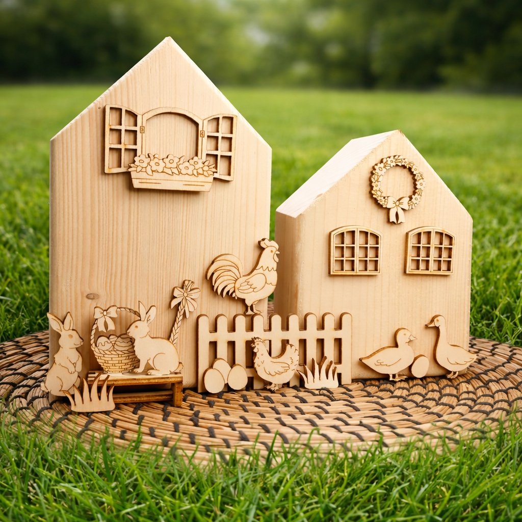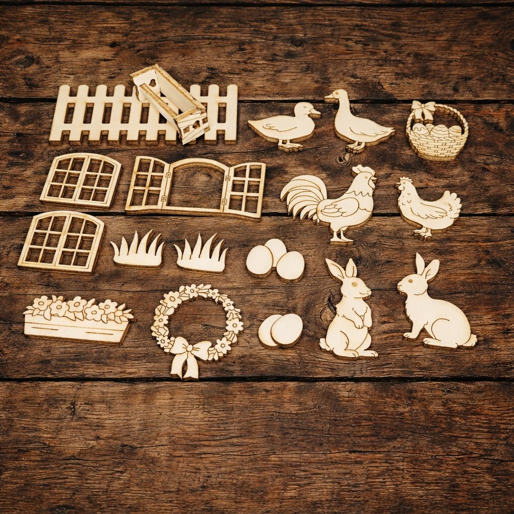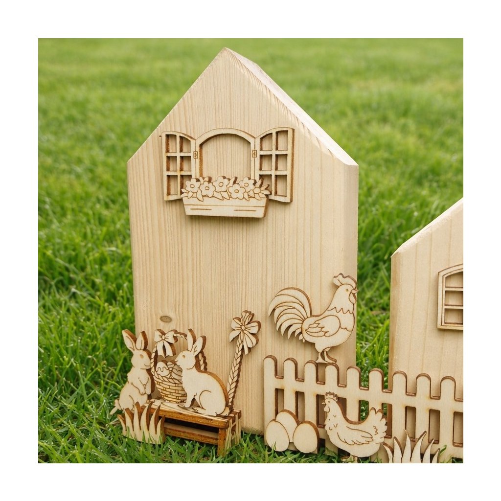 Detailně propracované výřezy z překližky jsme navrhli v naší dílně. Od nákresu až po laserový výřez jsou originálním výrobkem ozivdomov.cz, který jinde nenajdete. Sada obsahuje domeček s okny, plot, 6 zvířátek symbolizujících velikonoce, vejce, košík kraslic, trávu, velikonoční žílu (pomlázku), věnec i truhlík na okno.