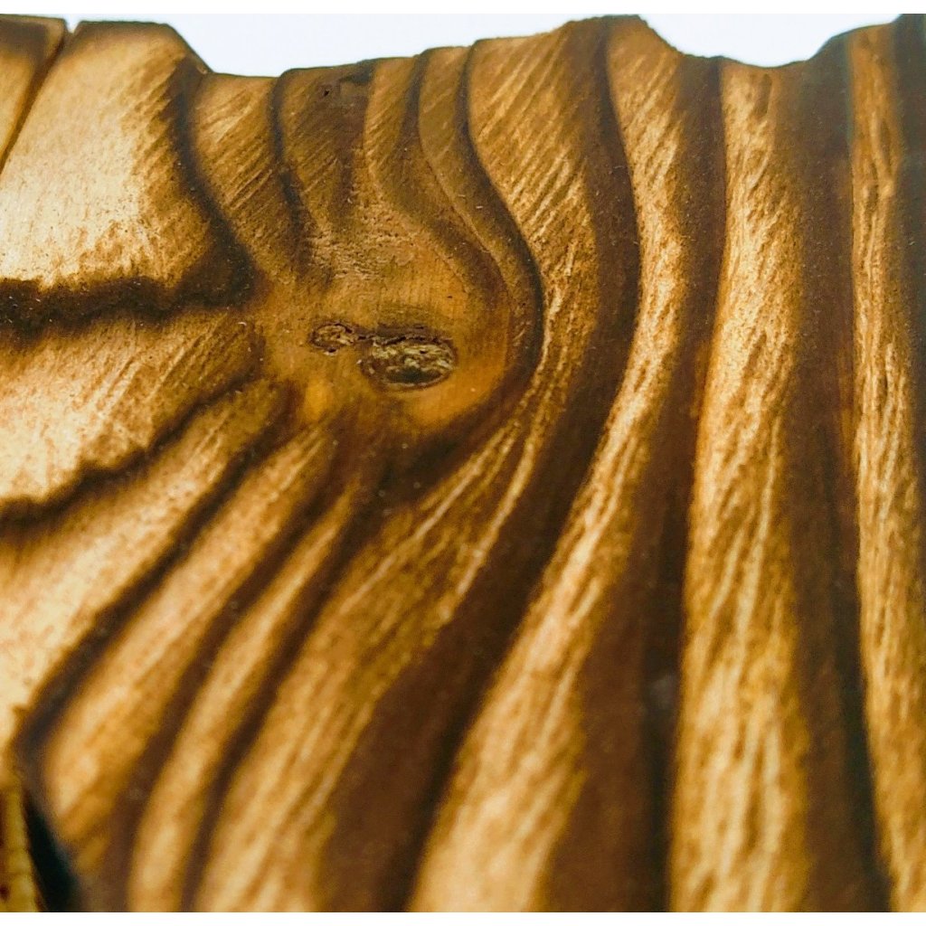 Jelen (sob) ze smrkového dřeva s povrchovou úpravou drásáním. Drásání je technika, při které se dřevo opálí a následně kartáčuje ocelovým kartáčem. Oproti klasickému opalovaní dává vyniknout tvrdým částem letorostů a dřevo získává plastičtější strukturu a barvu.