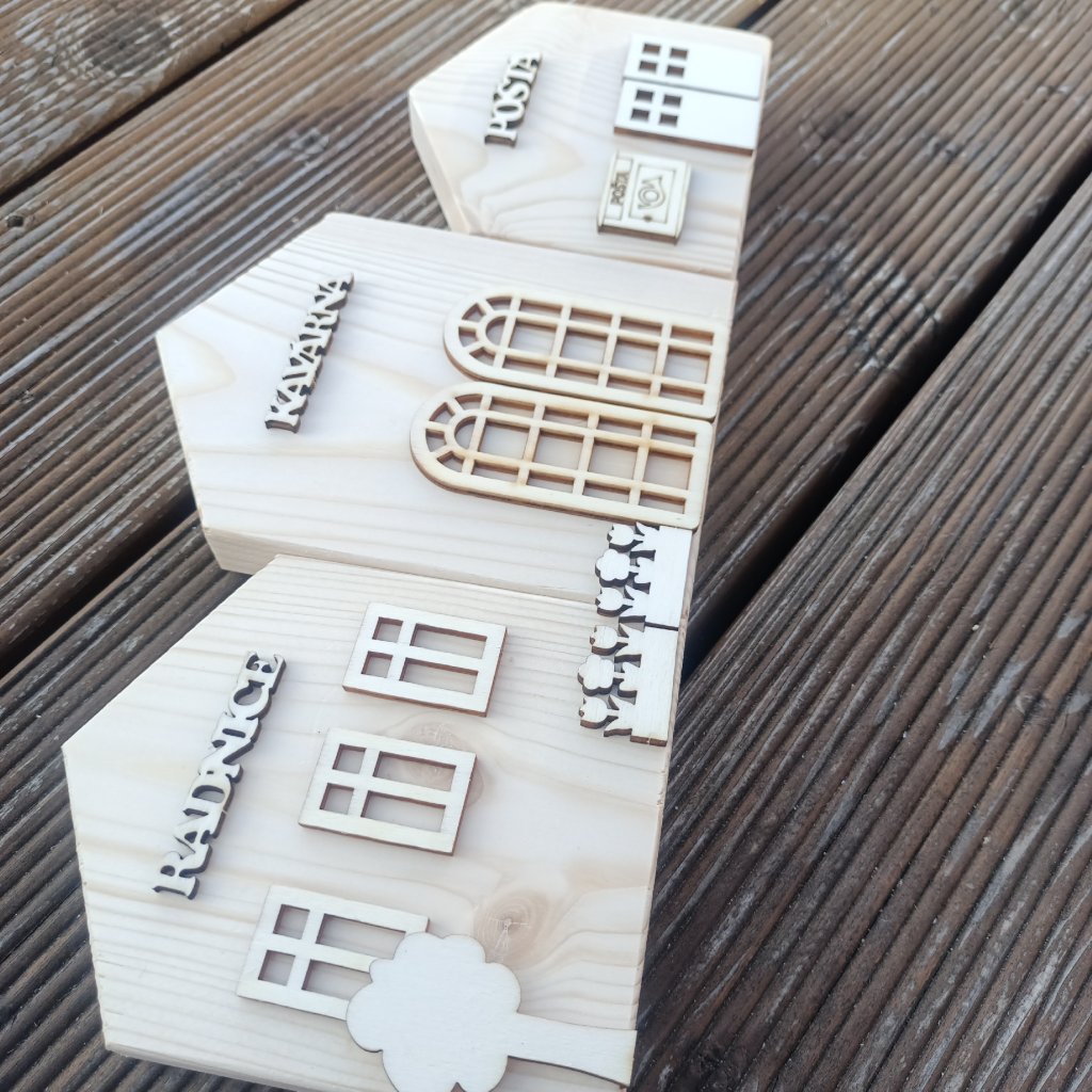 Využijte možnosti označit budovy ve vaší vesničce podle jejich funkcí s vystouplým 3D efektem díky nápisům z překližky. Vyřezávané laserem ( tmavé hrany), bez povrchové úpravy.