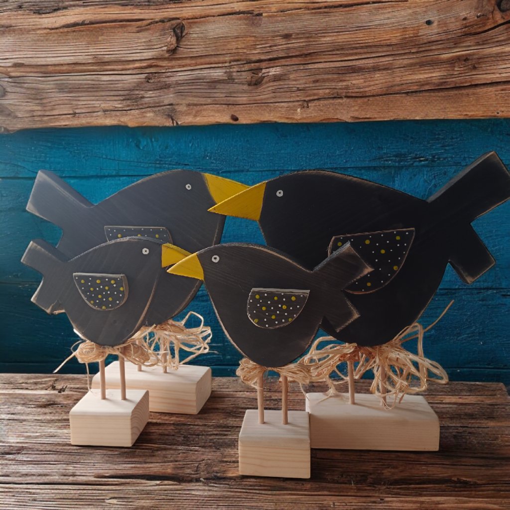 Kos je malovaný matnou černou barvou a má mírně ošoupané hrany. Křídlo je doplněno žlutými a bílými detaily. Každý kosák je na podstavci a dozdoben stuhou z lýka.