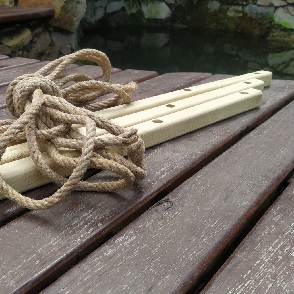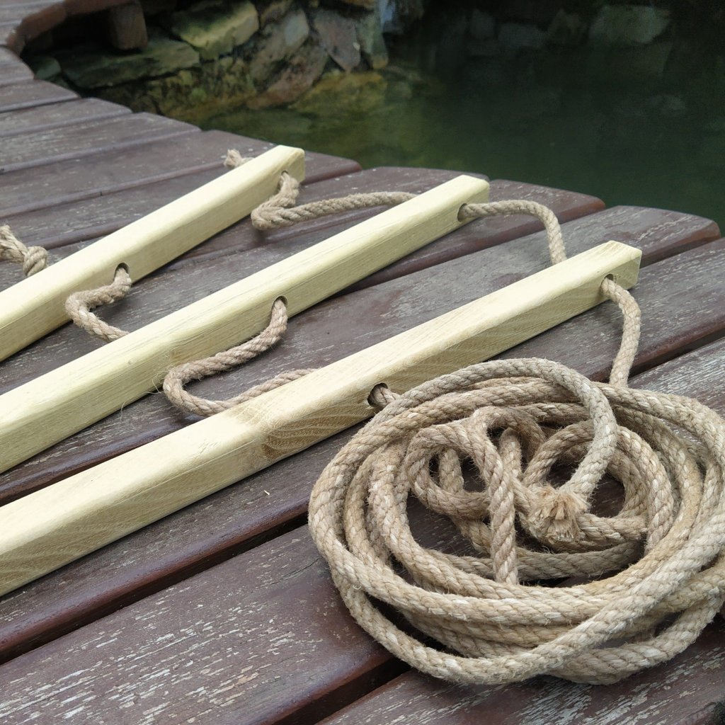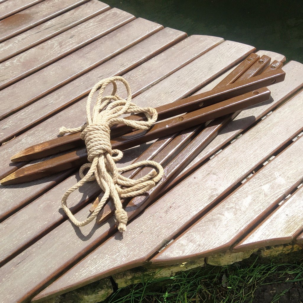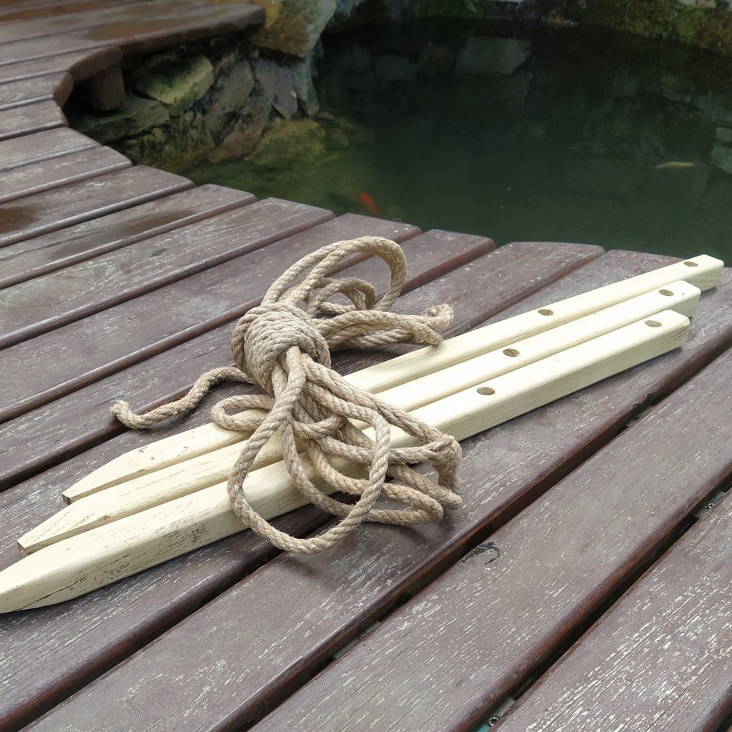 Pro prostření do vývrtů v tyčkách doporučujeme lano po odstřihnutí uzlu omotat lepící páskou a vytvořit tak pomyslnou jehlu. Lano se pak při navlékání netřepí a navléká se o poznání lépe.