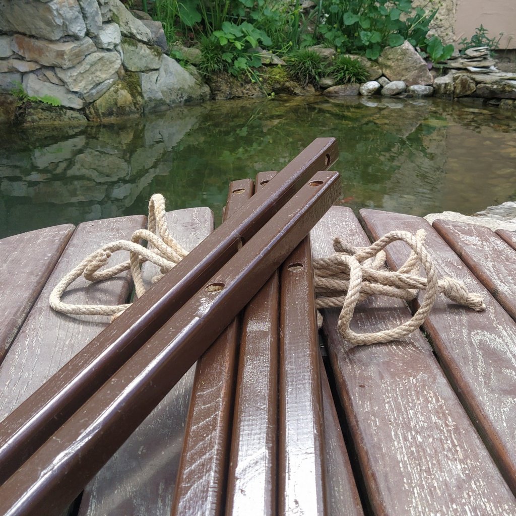 Lano je jutové. Jedná se o přírodní materiál a jeho vlastností je, že se při navlhčení smršťuje. Prověšení se tedy pod deštích napne, po uschnutí zase prověsí. Jedná se o běžné chování tohoto materiálu.