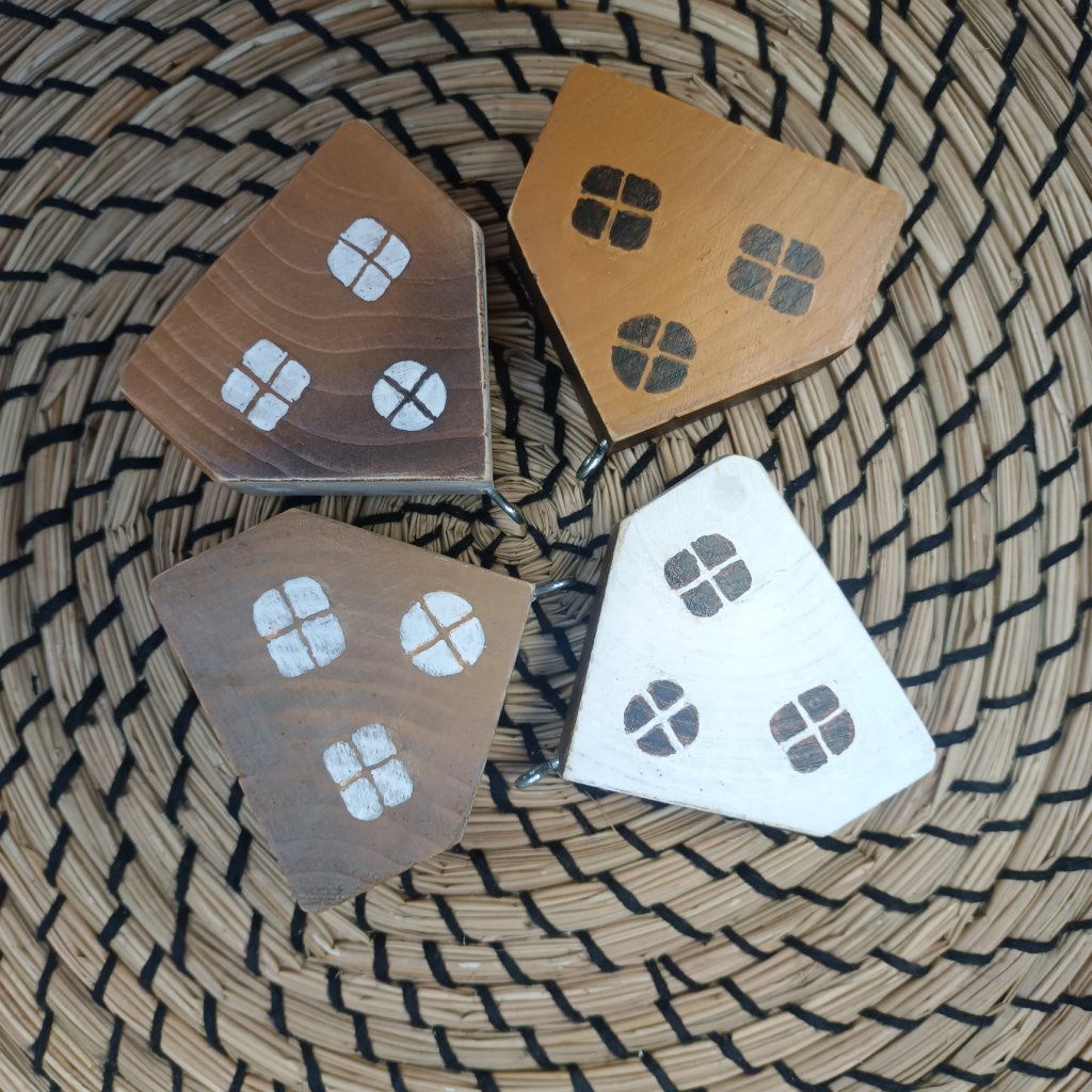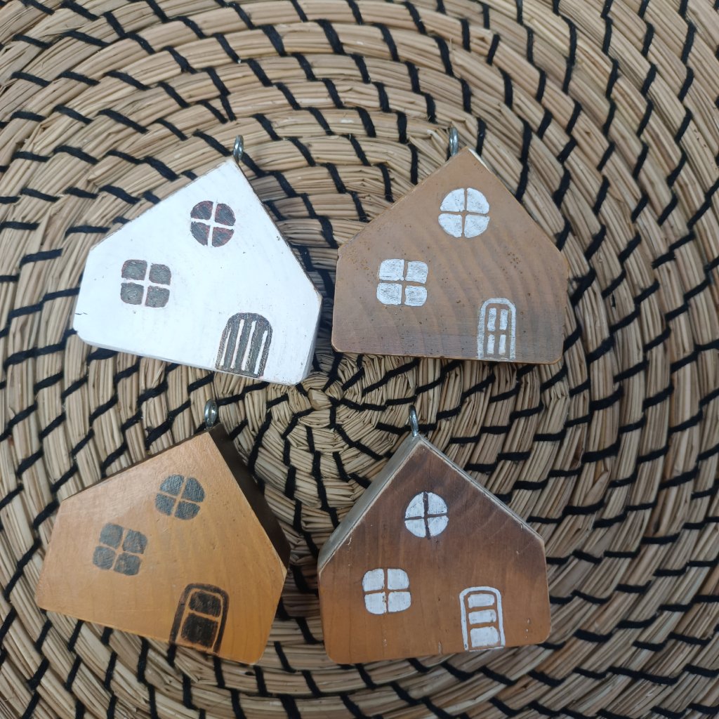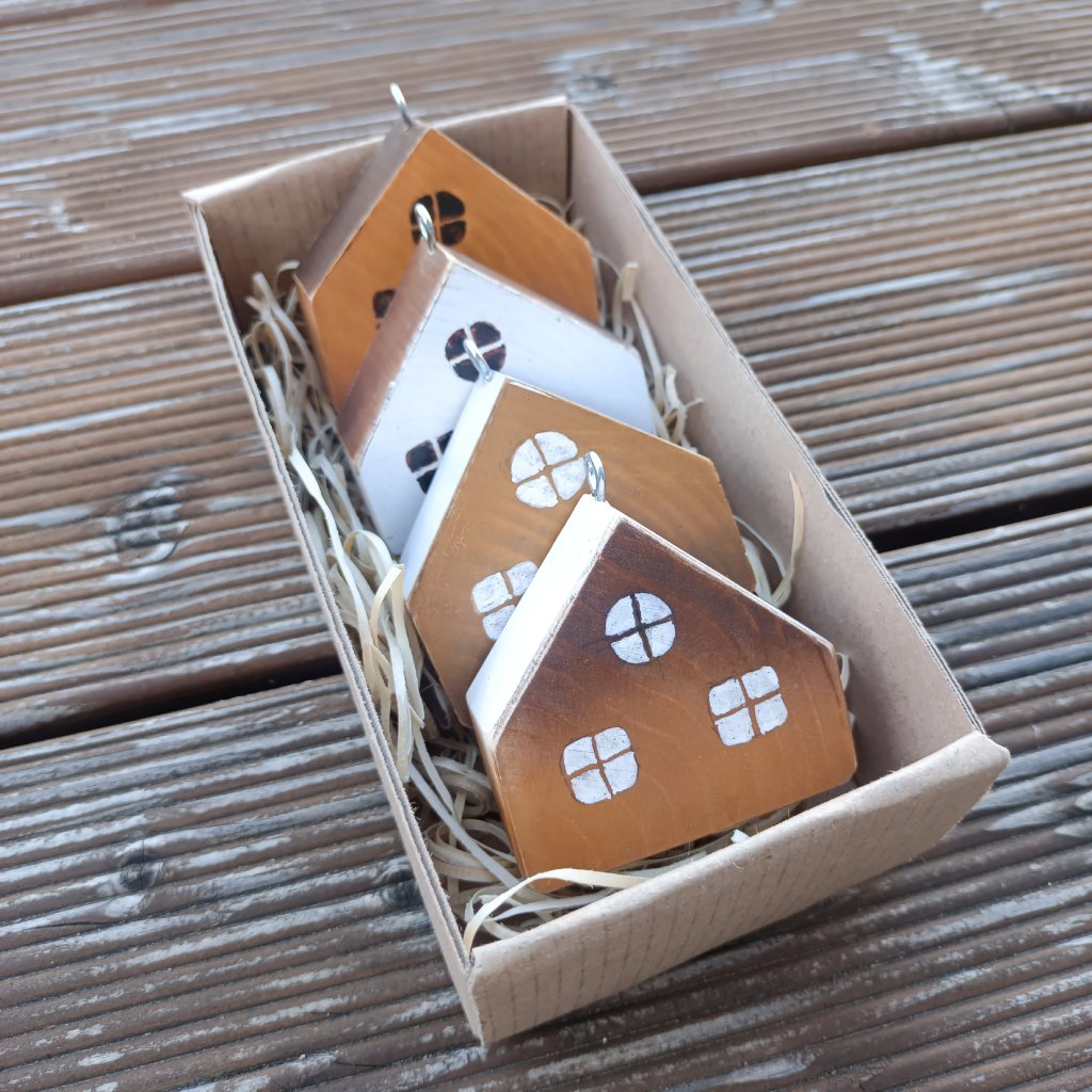 Čtyři smrkové minidomečky s očkem na zavěšení v hnědo-bílých a barevně přecházejících odstínech. Jednoduše zdobené domečky jsou zabalené do přírodní papírové krabičky s výplní z dřevité vaty. Malováno oboustranně akrylem, zalakováno.
