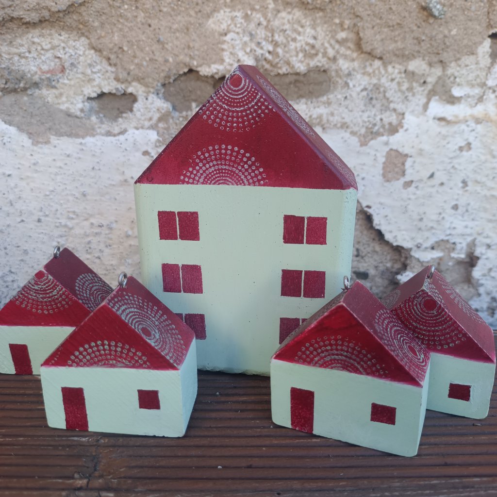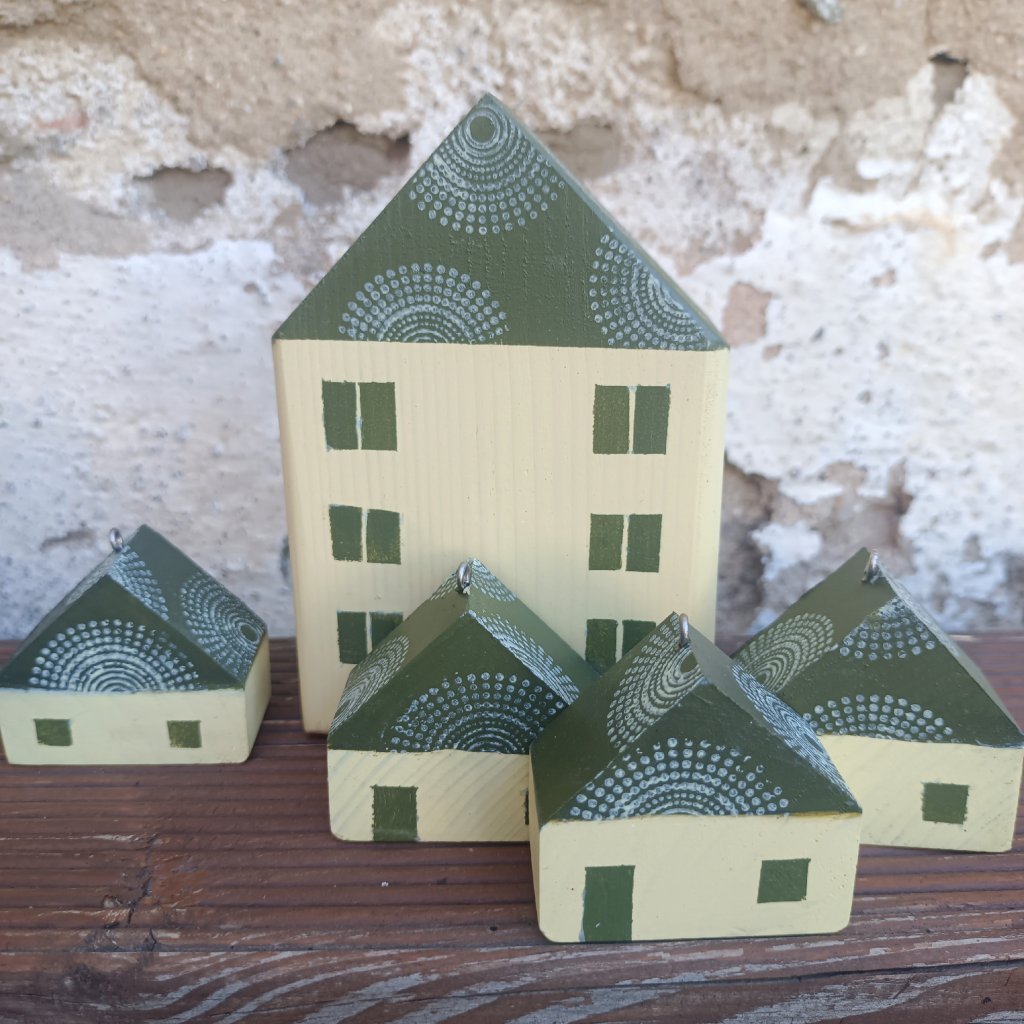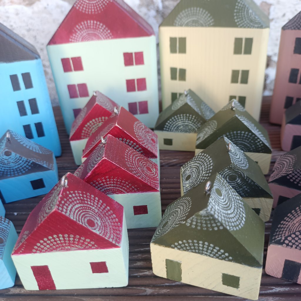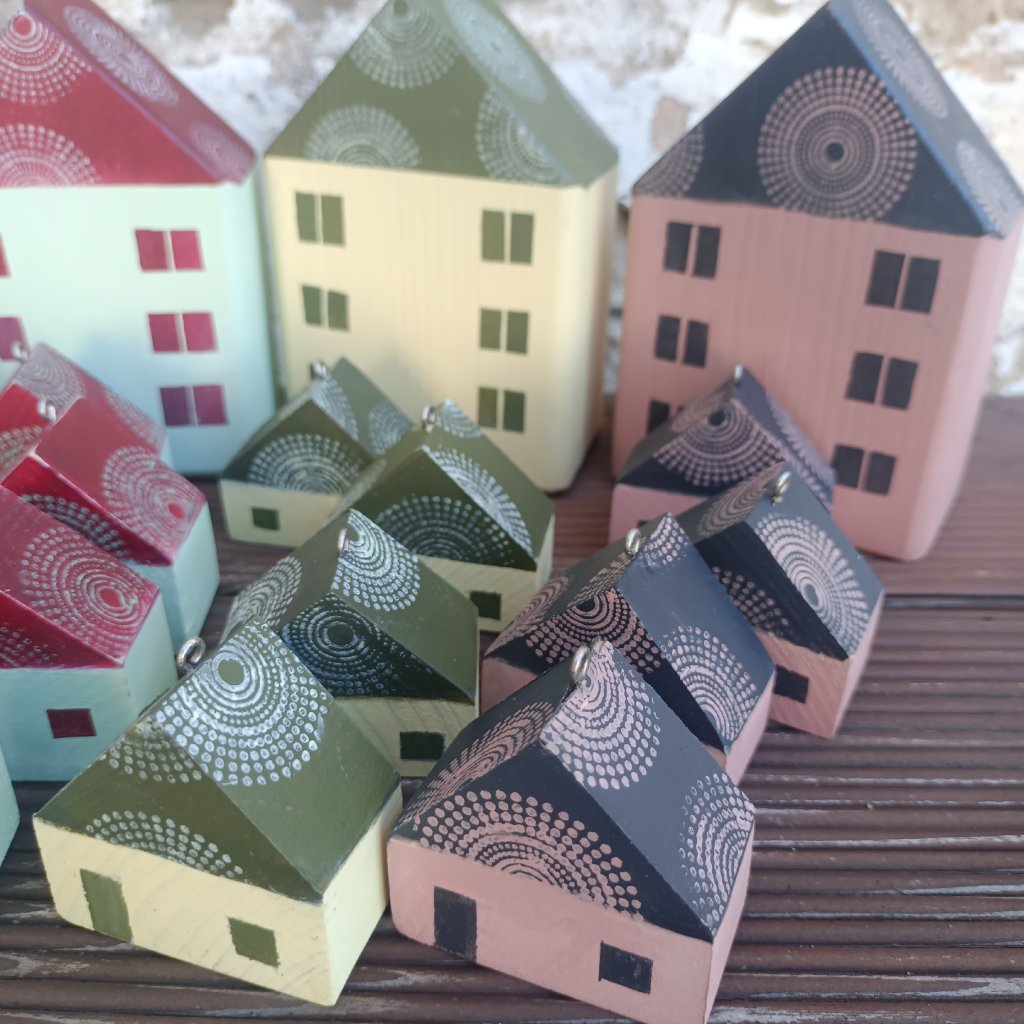 Sada pěti domečků v pastelových barvách s jednoduchými okýnky a střechami doplněnými mandalou v jedné barvě. Čtyři malé domečky s očkem na zavěšení využijete na větvičku nebo vánoční stromeček, pátý velký domeček doladí celou kompozici na polici nebo věnci a získáte tak krásné propojení dekorace. Více barev.