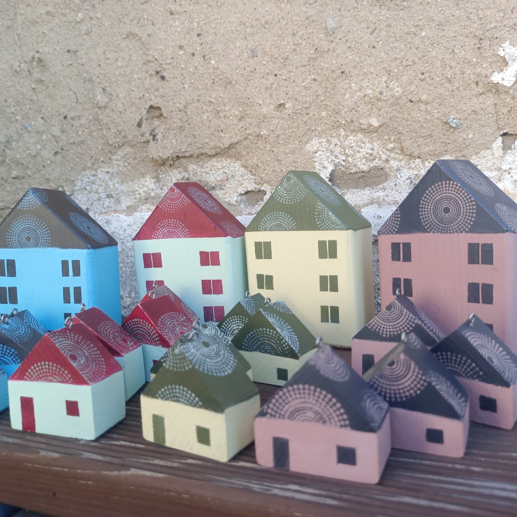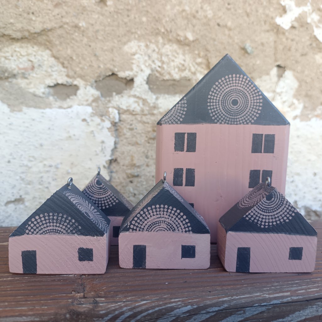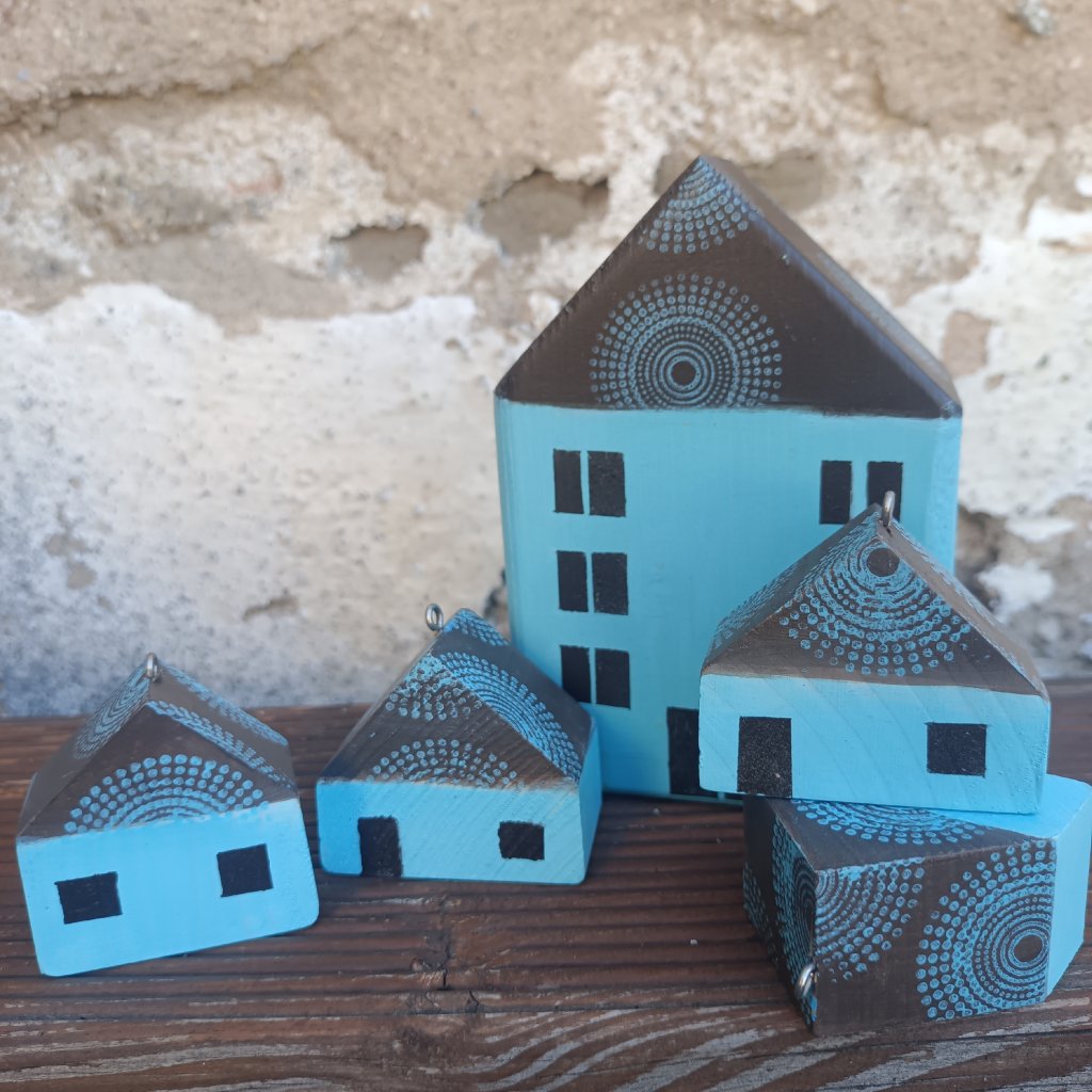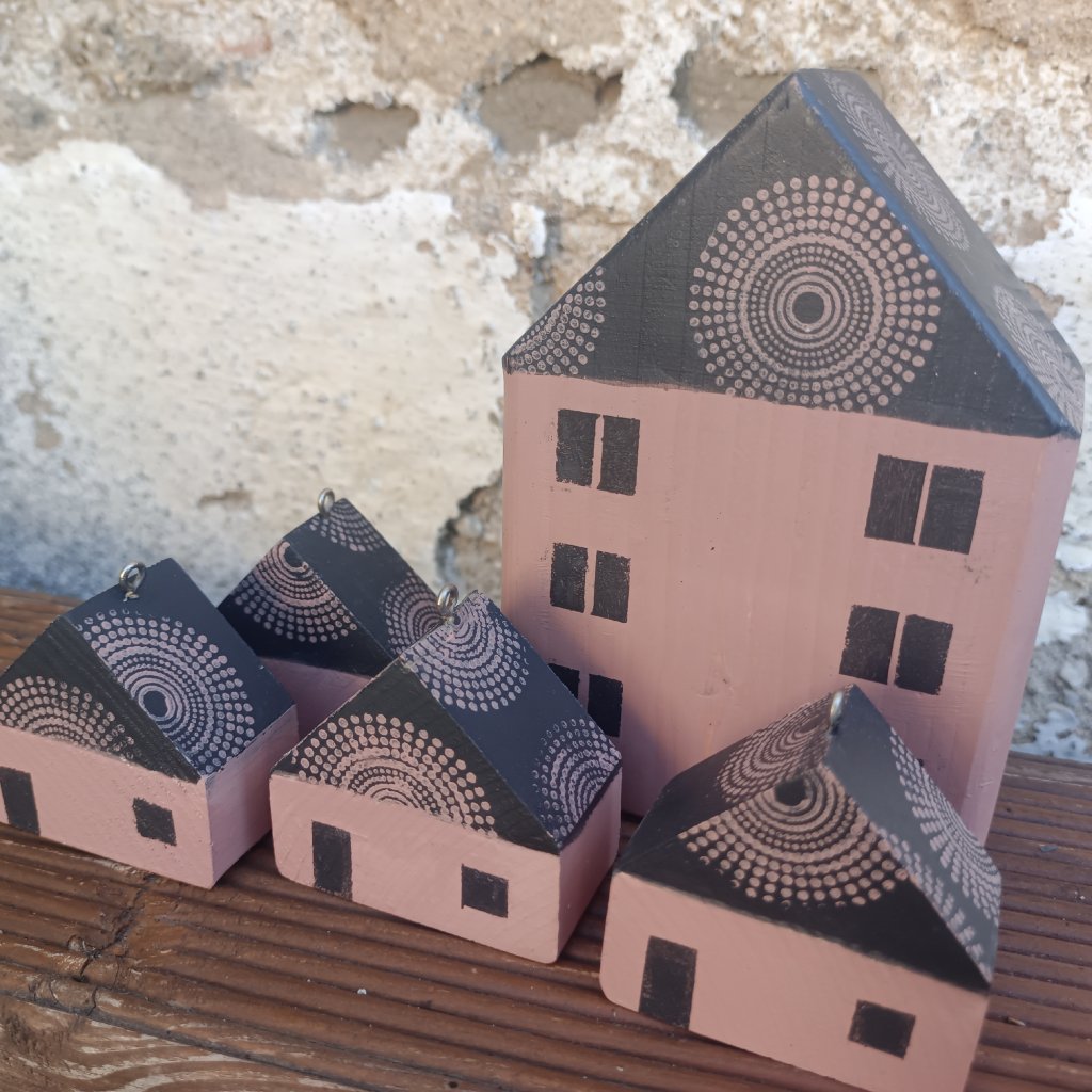 Sada pěti domečků v pastelových barvách s jednoduchými okýnky a střechami doplněnými mandalou v jedné barvě. Čtyři malé domečky s očkem na zavěšení využijete na větvičku nebo vánoční stromeček, pátý velký domeček doladí celou kompozici na polici nebo věnci a získáte tak krásné propojení dekorace. Více barev.