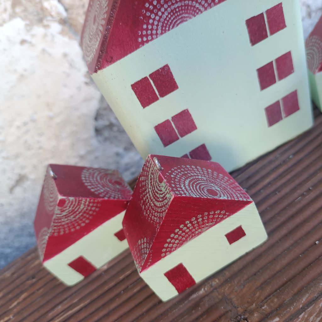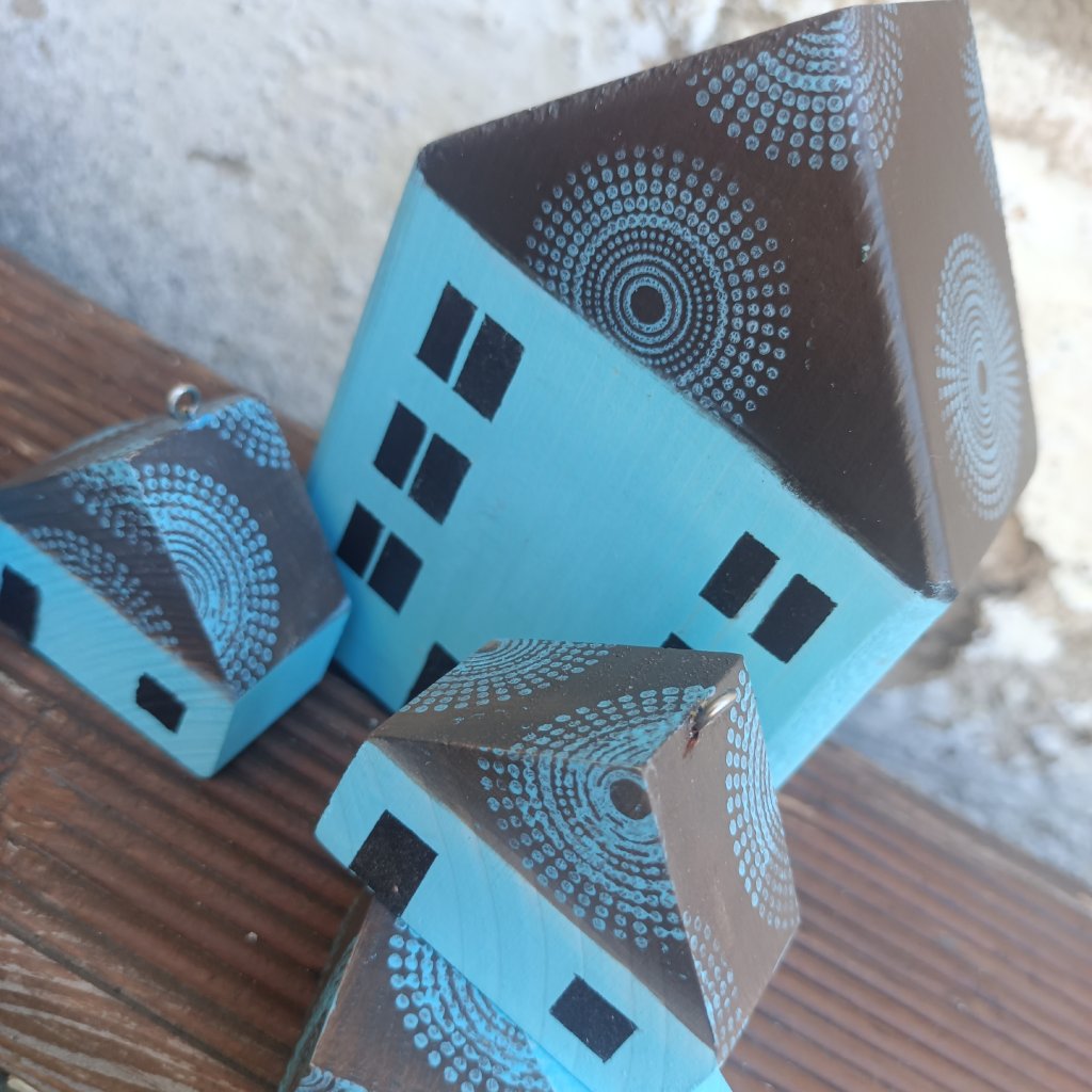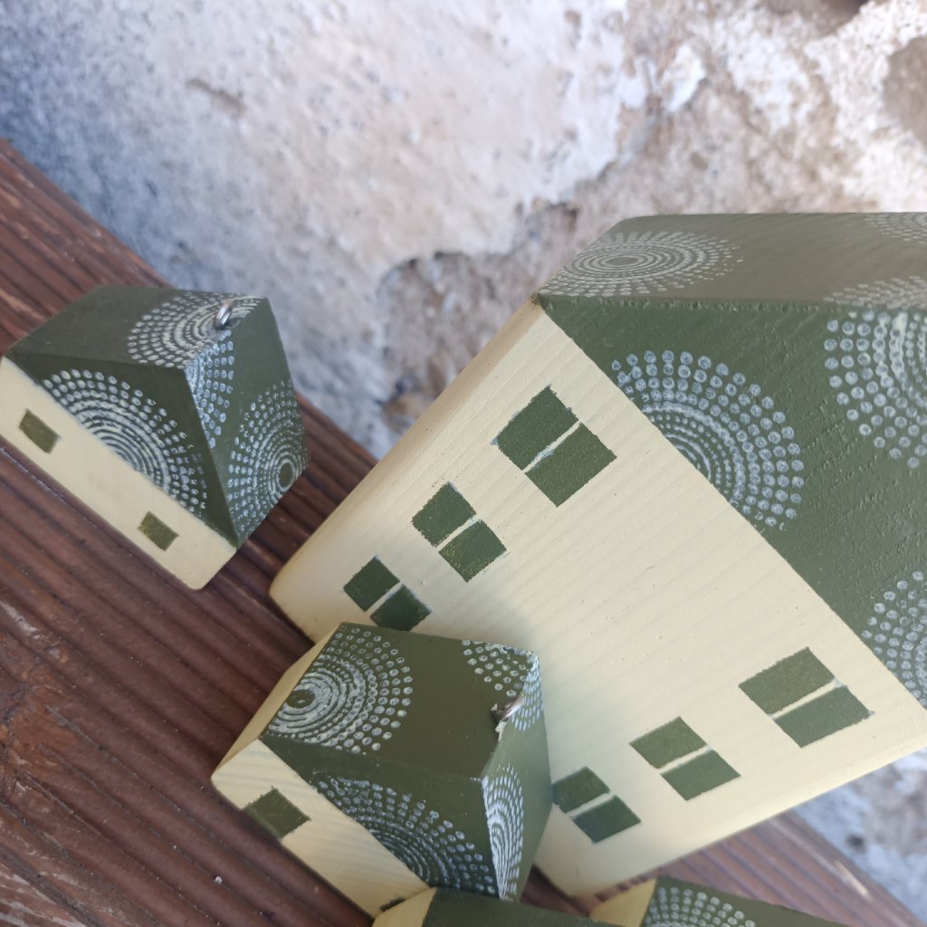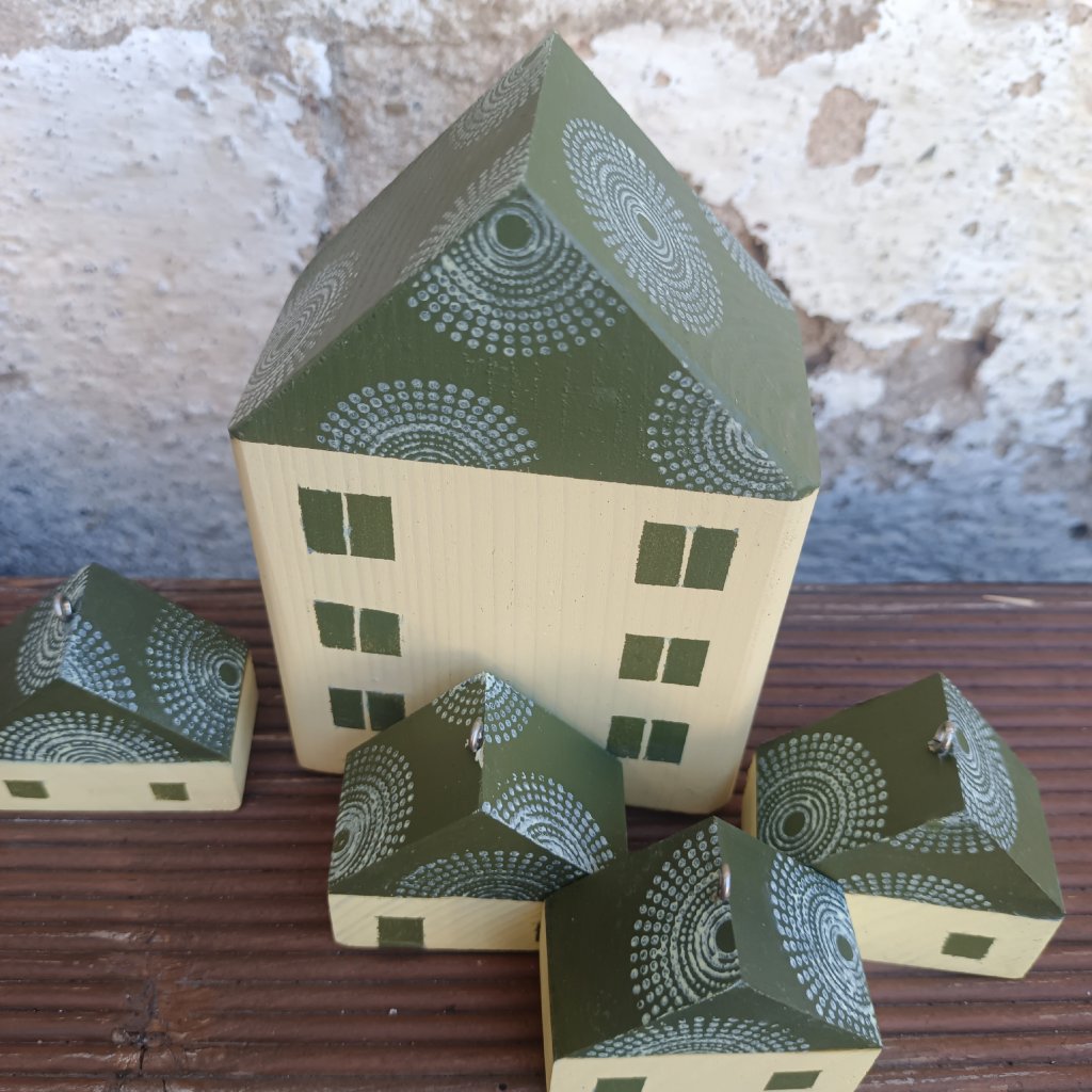 Sada pěti domečků v pastelových barvách s jednoduchými okýnky a střechami doplněnými mandalou v jedné barvě. Čtyři malé domečky s očkem na zavěšení využijete na větvičku nebo vánoční stromeček, pátý velký domeček doladí celou kompozici na polici nebo věnci a získáte tak krásné propojení dekorace. Více barev.