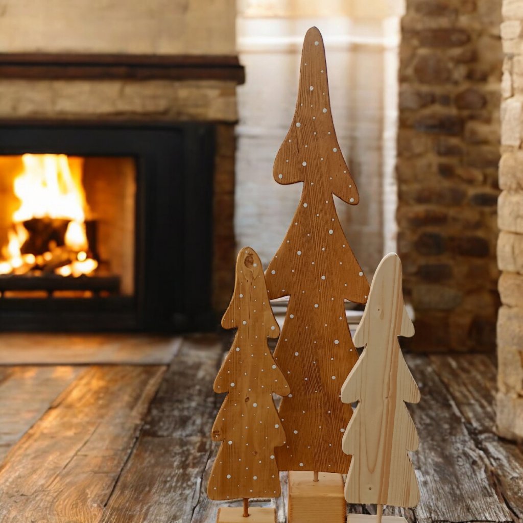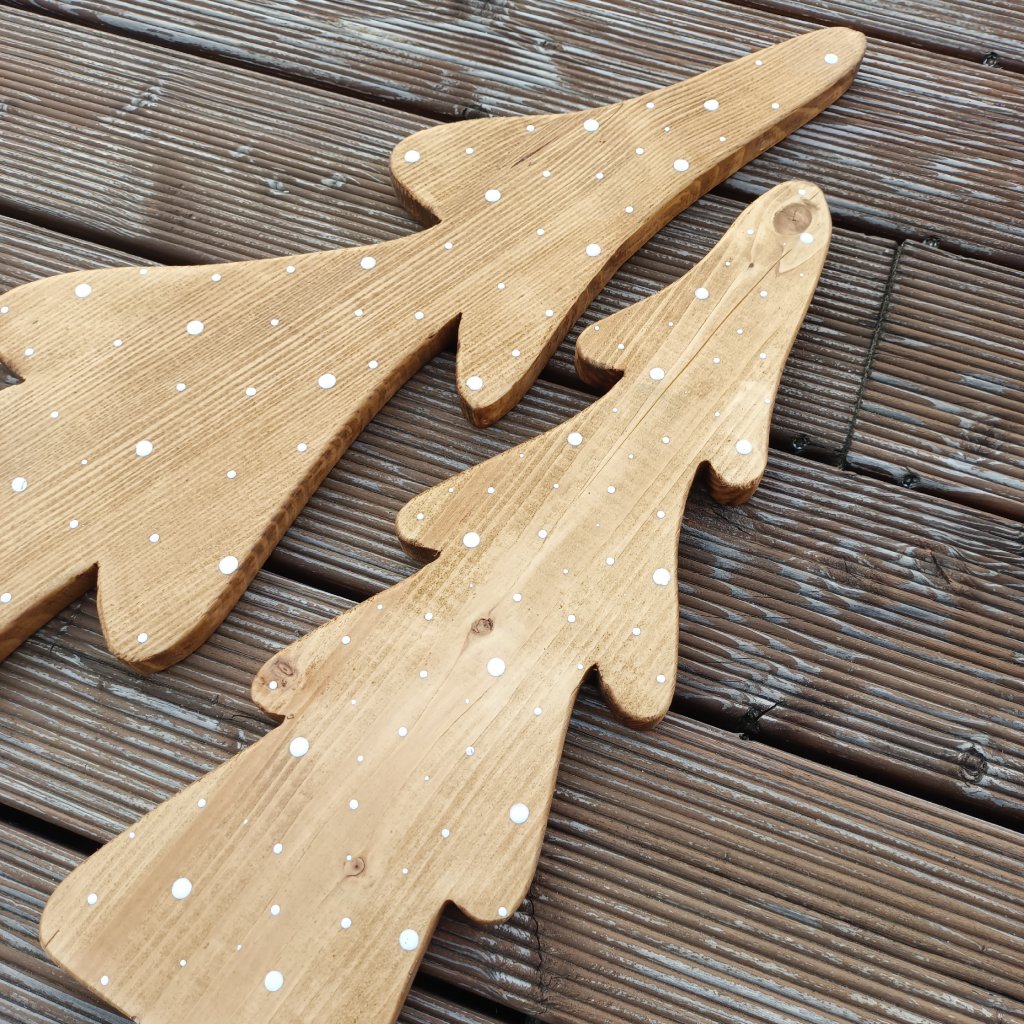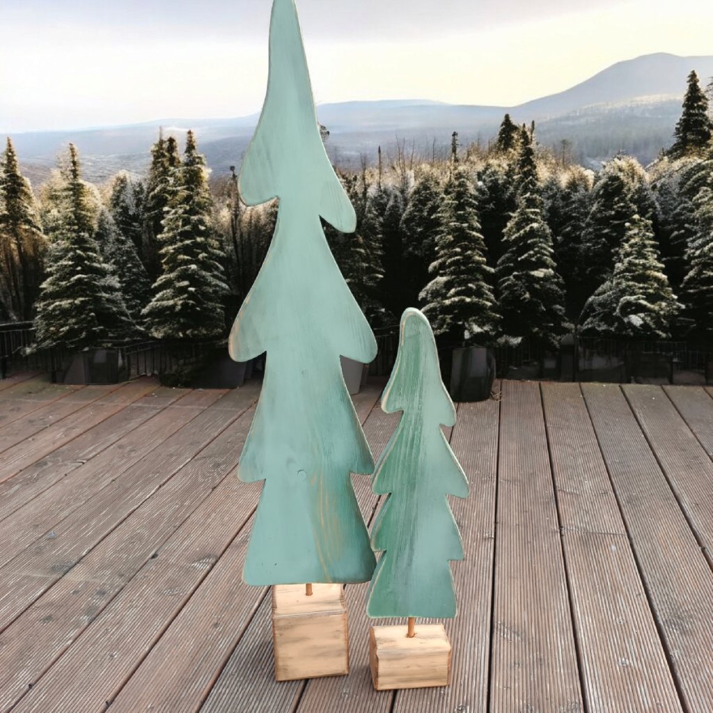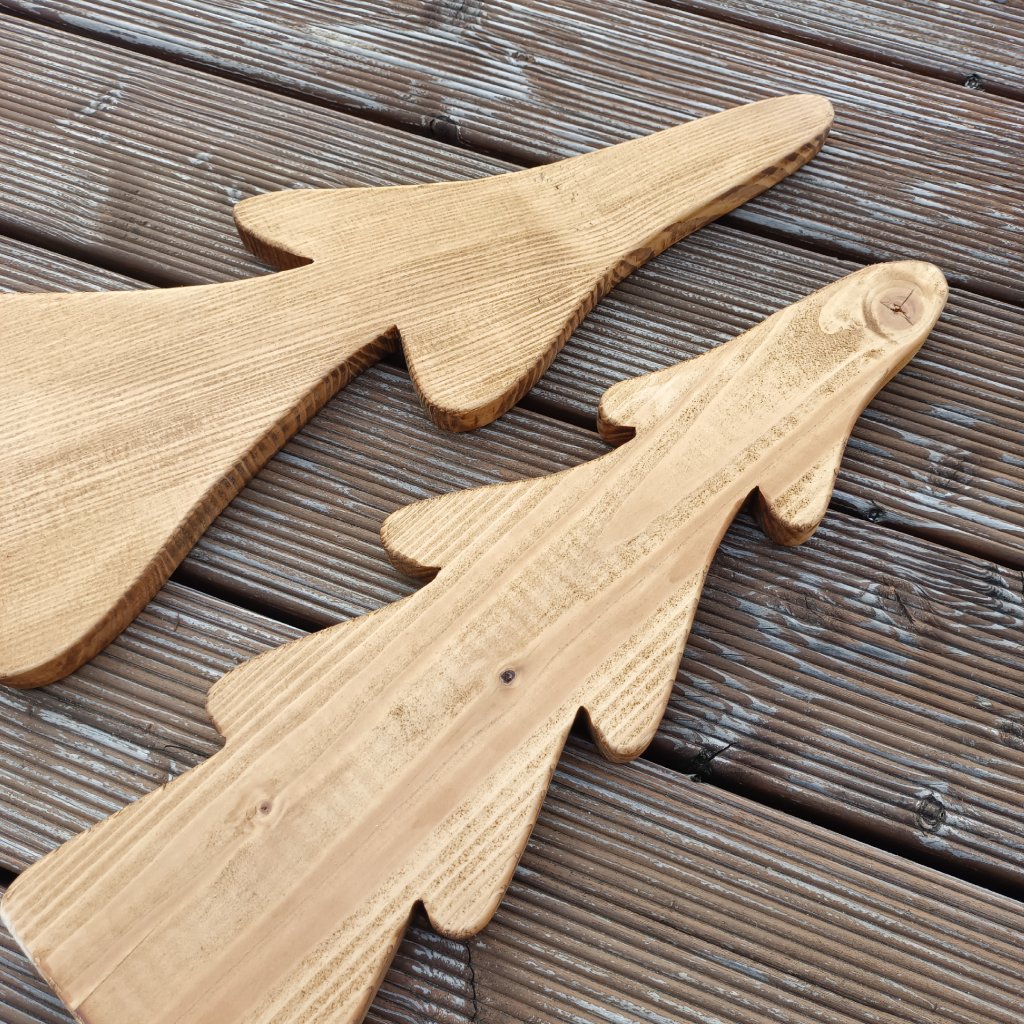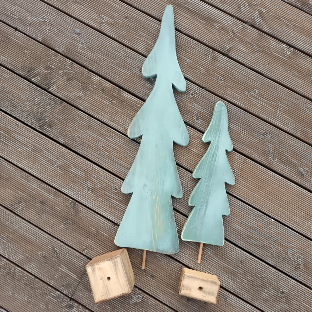 Velký dřevěný stromeček ze smrkového masivu o tloušťce 2cm, umístěný na tyčce a podstavci, ze kterého jej lze vyjmout. Stromeček má nepravidelný tvar větví. Stromečky mají povrchovou úpravu lazurou (hnědé) nebo vícevrstvý nátěr barvou v několika odstínech zelené pro vytvoření patiny (zelený).