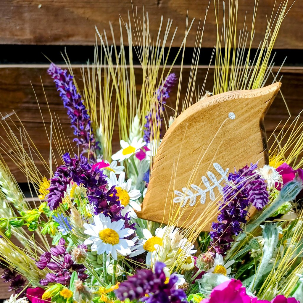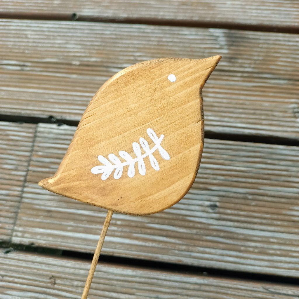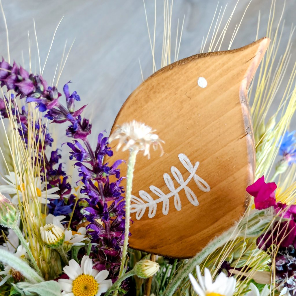 Tento dřevěný ptáček ze smrkového dřeva je ideálním doplňkem pro vaše květinové vazby, věnce nebo jako zápich do truhlíků a květníků. Díky povrchové úpravě lazurou v odstínu "ořech" a květinové aplikaci vytvořené akrylovým fixem podtrhne především květinové vazby ve venkovském stylu a z lučních květin. Pro zvýšení odolnosti je ptáček zalakován.