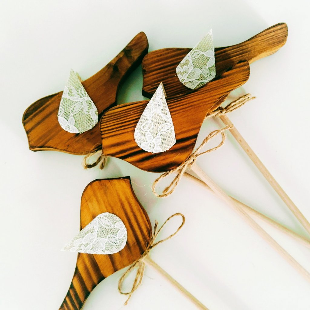 Ptáček je opalovaný a natřený světlým mořidlem barvy kaštan. Dozdobený světlým křidýlkem a malou mašličkou na tyčce. Ptáček je na zápichu. Dekorace je oboustranná.