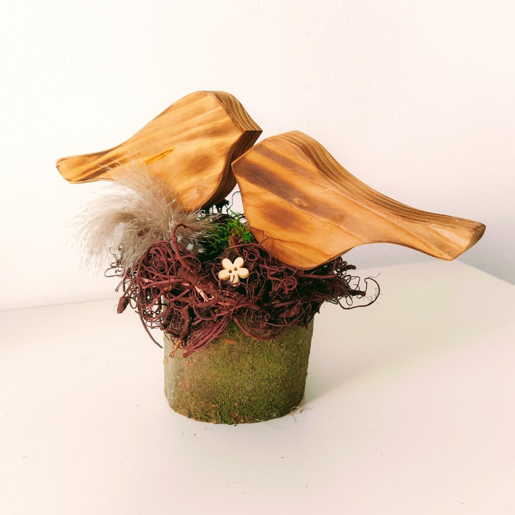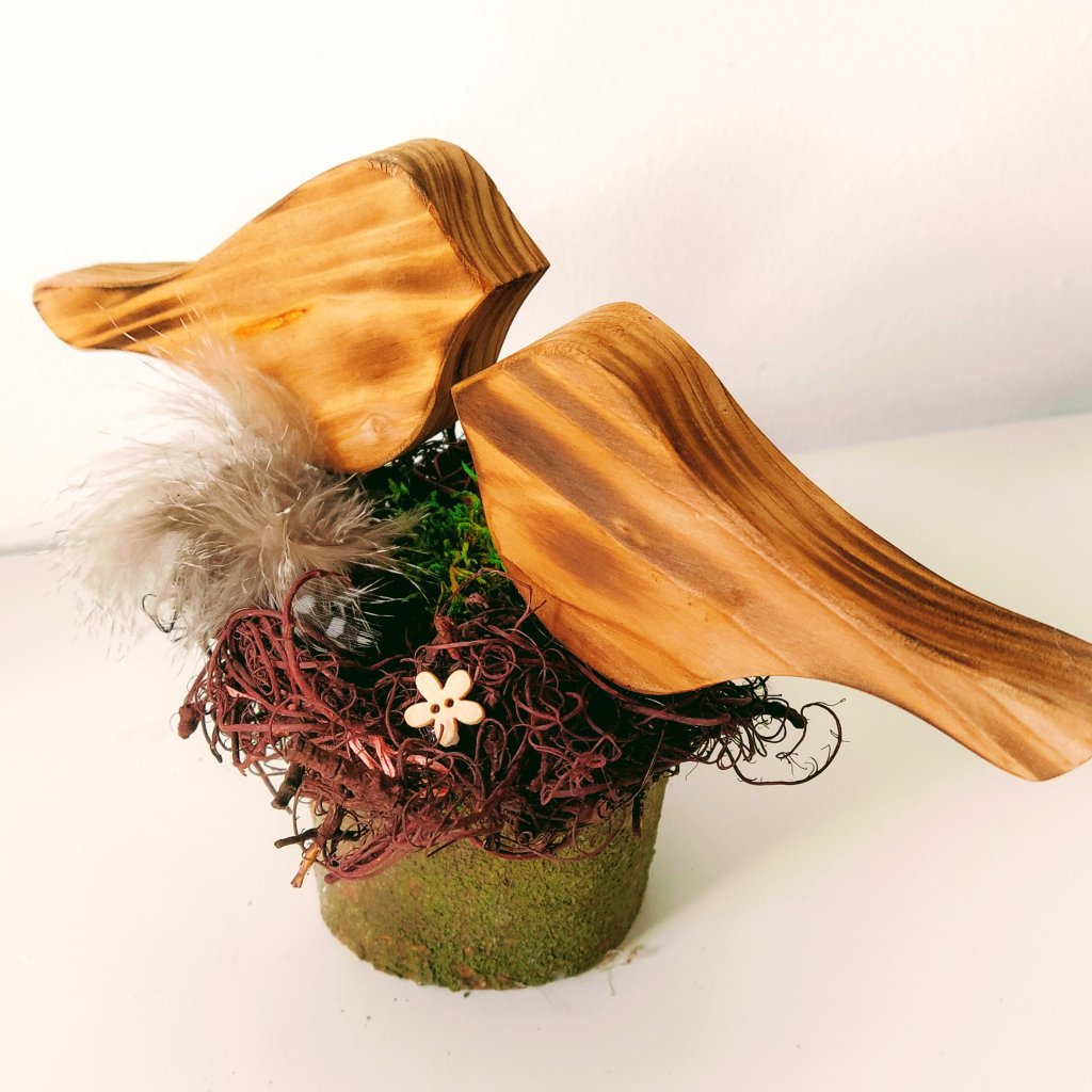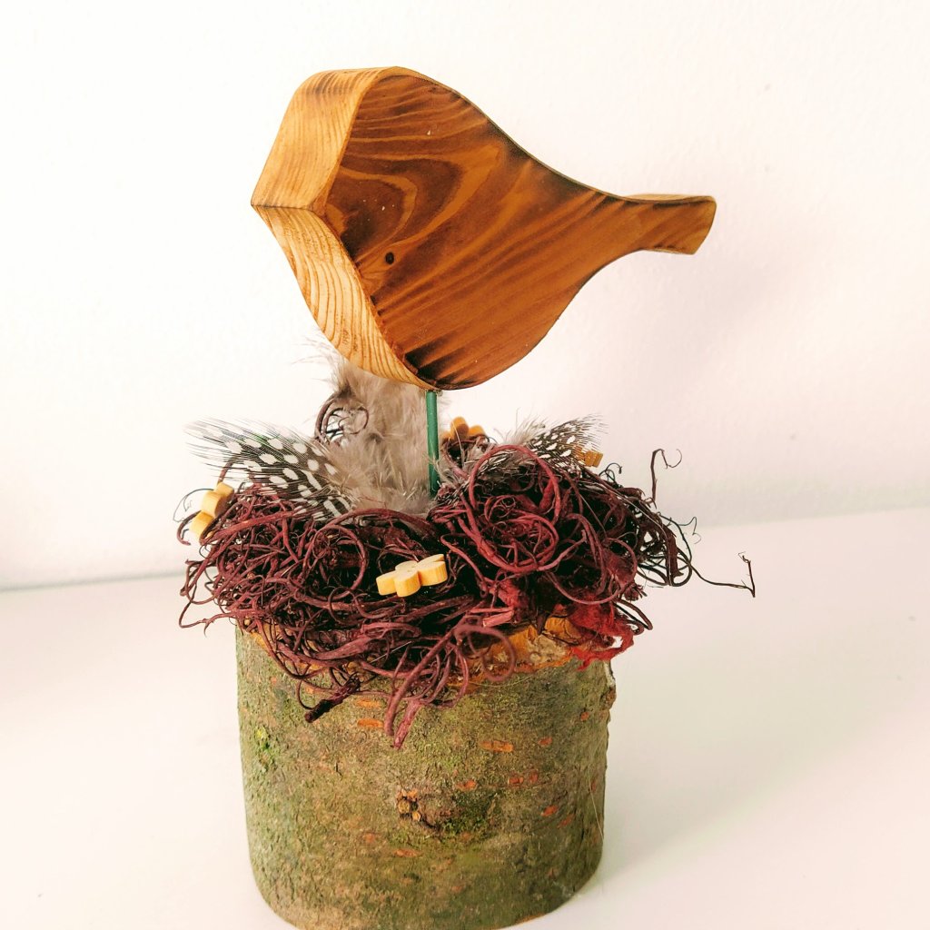 Dřevěná dekorace - ptáček v hnízdě je ručně vytvořena z přírodních materiálů. Ptáček je upraven technikou opalování a moření do přírodních tónů, doplněno dřevěnými doplňky, pírky, stabilizovaným mechem. Vyrobeno ze smrkového dřeva a přírodní kulatiny.