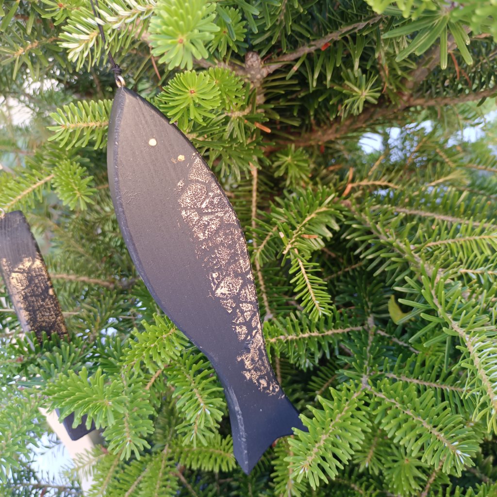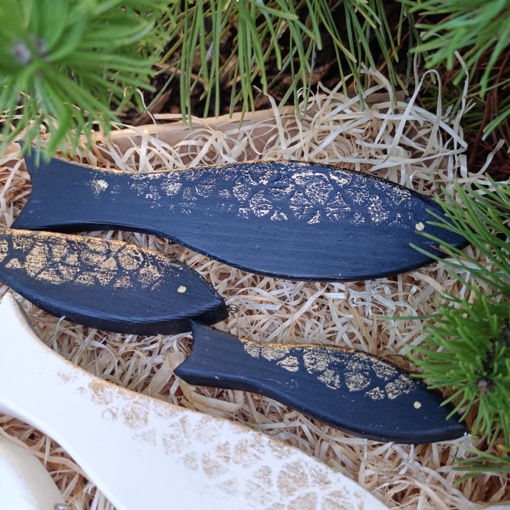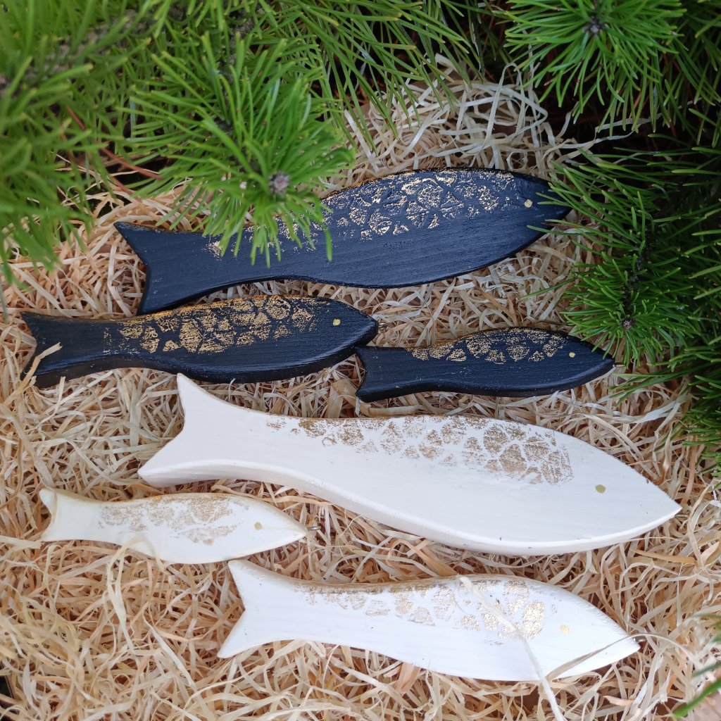 Sardinky ze smrkového dřeva z naší dílny, malované rukou autorky BohuOwlEye do svátečních barev černé a bílé se zlatým potiskem, zalakováno. Dodáváme v sadách podle barev s malým očkem na hlavách rybiček k zavěšení. Balíme do celofánového obalu nebo můžete dokoupit dárkové balení.