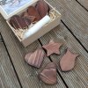 Sada 8 dřevěných perníčků tloušťky 1 cm jsou díky své barvě a lesklému povrchu k nerozeznání od pravých perníčků, které v závěru pečení potřete rozšlehaným vejcem s kakaem.