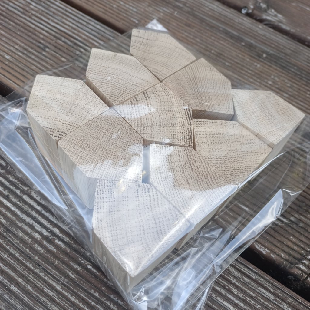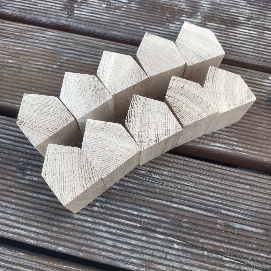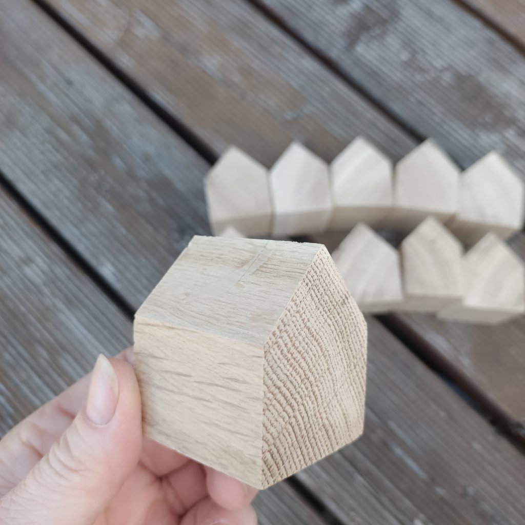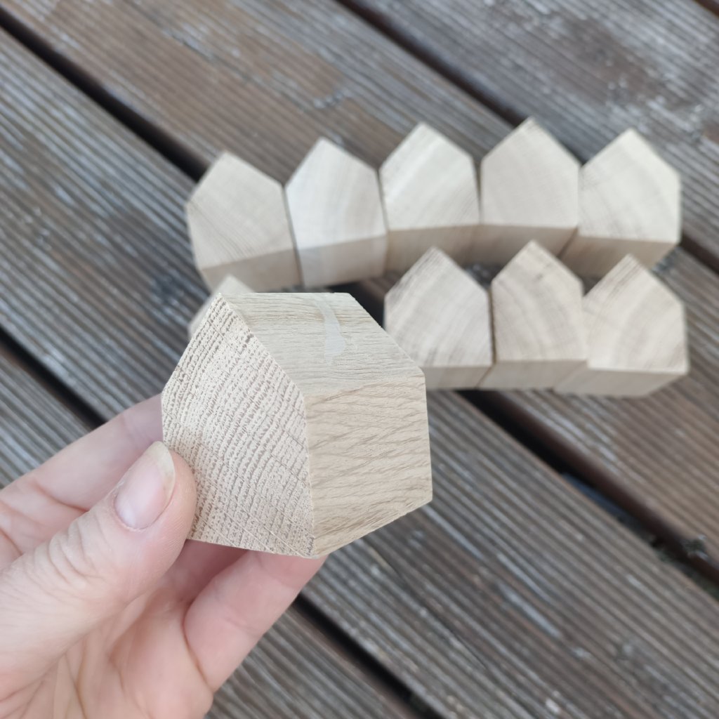 Sada obsahuje 10ks malých dřevěných domečků vyrobených z dubového dřeva. Jednotlivé domečky jsou obroušené ze všech stran včetně čelní řezané. Díky svojí velikosti a hmotnosti jsou vhodné především na zavěšení. K domečkům je možné doobjednat malé zavěšovací očko a kroužek na přívěšek.