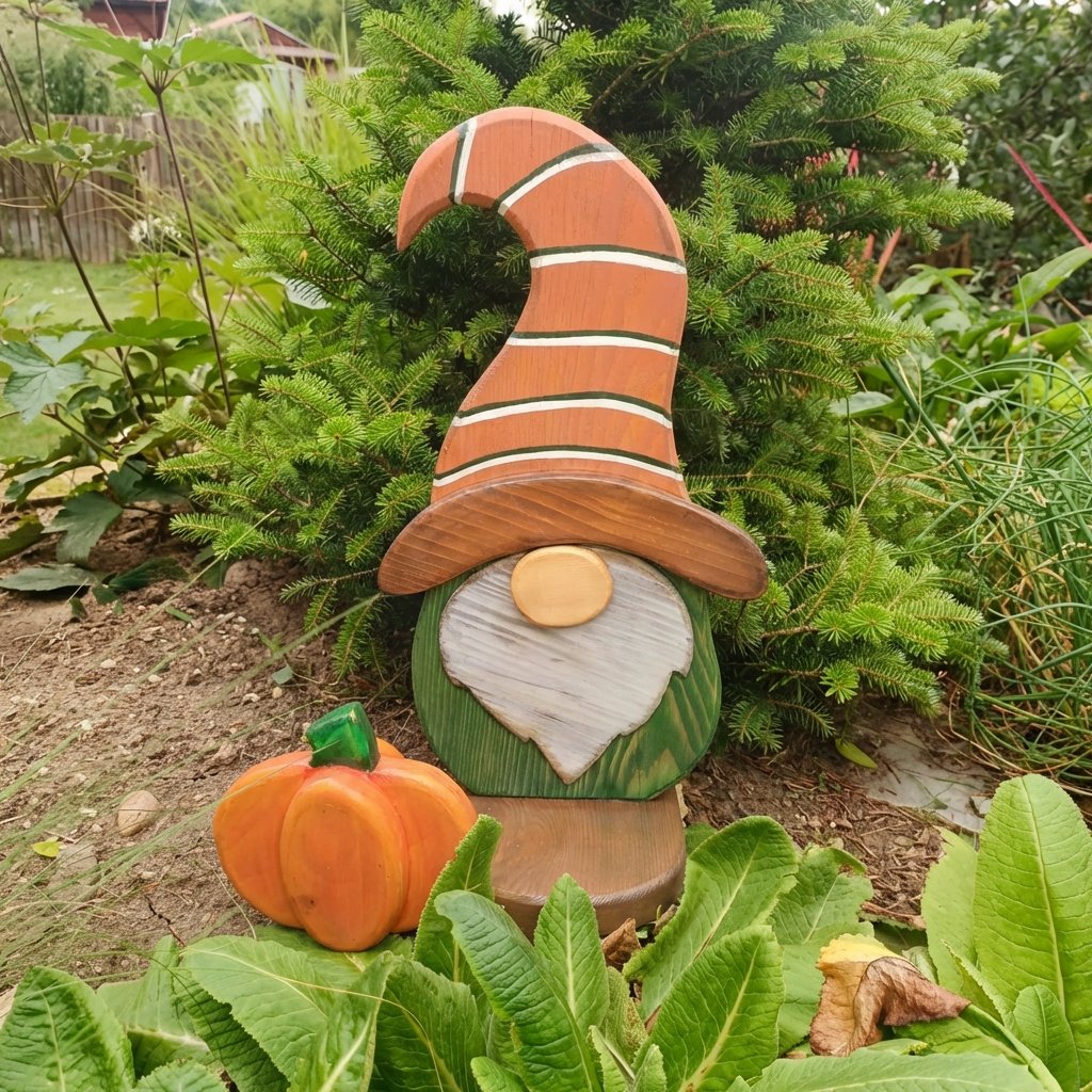 Velká dřevěná figurka trpaslíka/skřítka tvořená vrstvením smrkových výřezů pro plný 3D vzhled. Celková výška dekorace je 40 cm a postavička je složena z 5 dílů. Skřítka posíláme již slepeného, malovaného do podzimních barev a přelakovaného pro odolnost do venkovních podmínek. Používáme vodou ředitelné barvy a laky, které neobtěžují v interiéru žádnou chemickou vůní. Dřevěná postavička je tak připravena k okamžitému vystavení doma, na terase nebo před vchodové dveře. Hodí se jako originální podzimní dekorace i dárek.