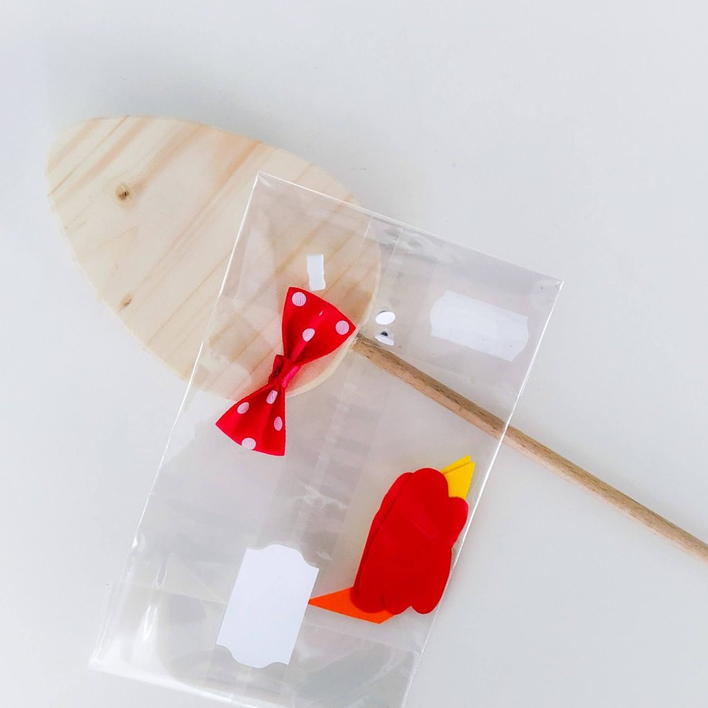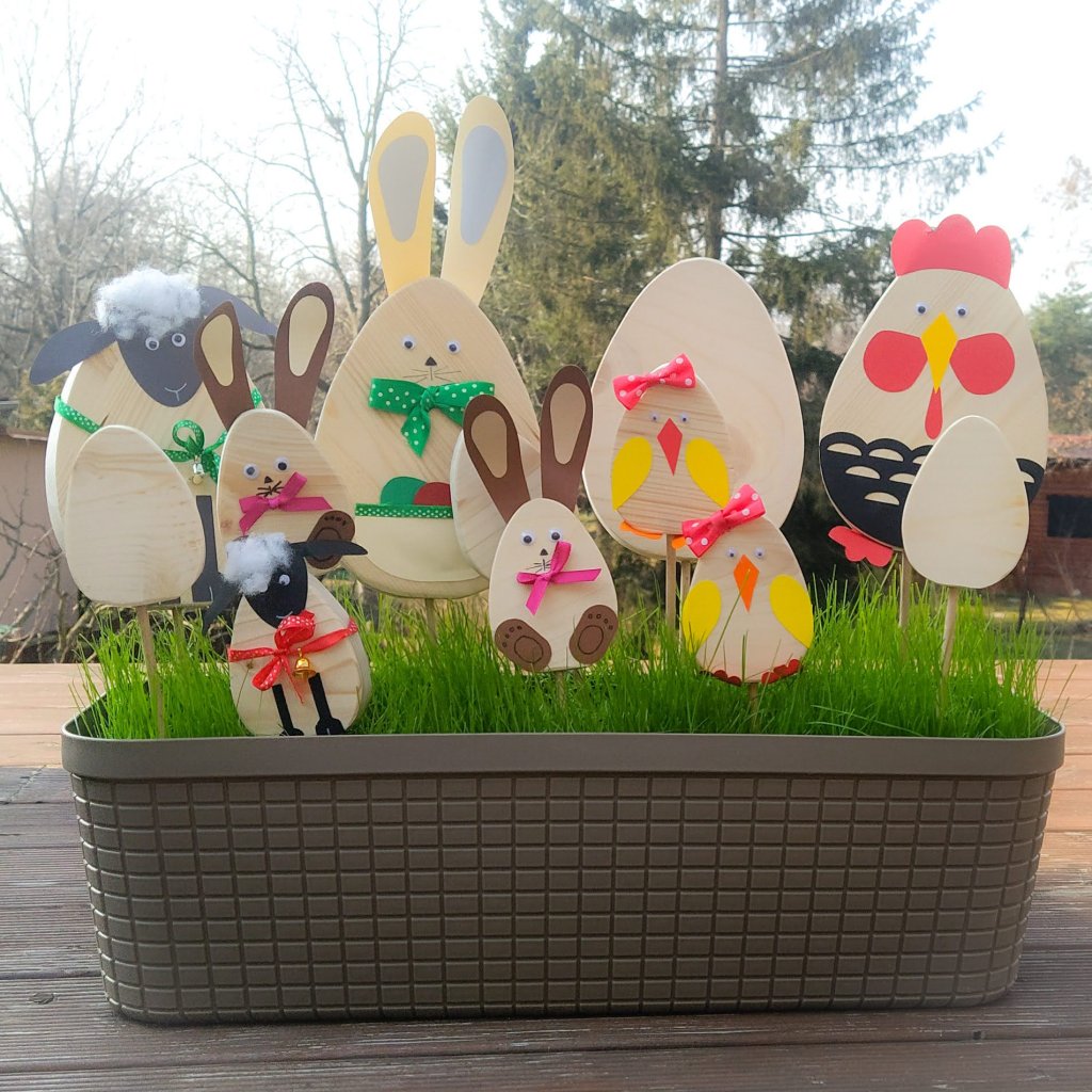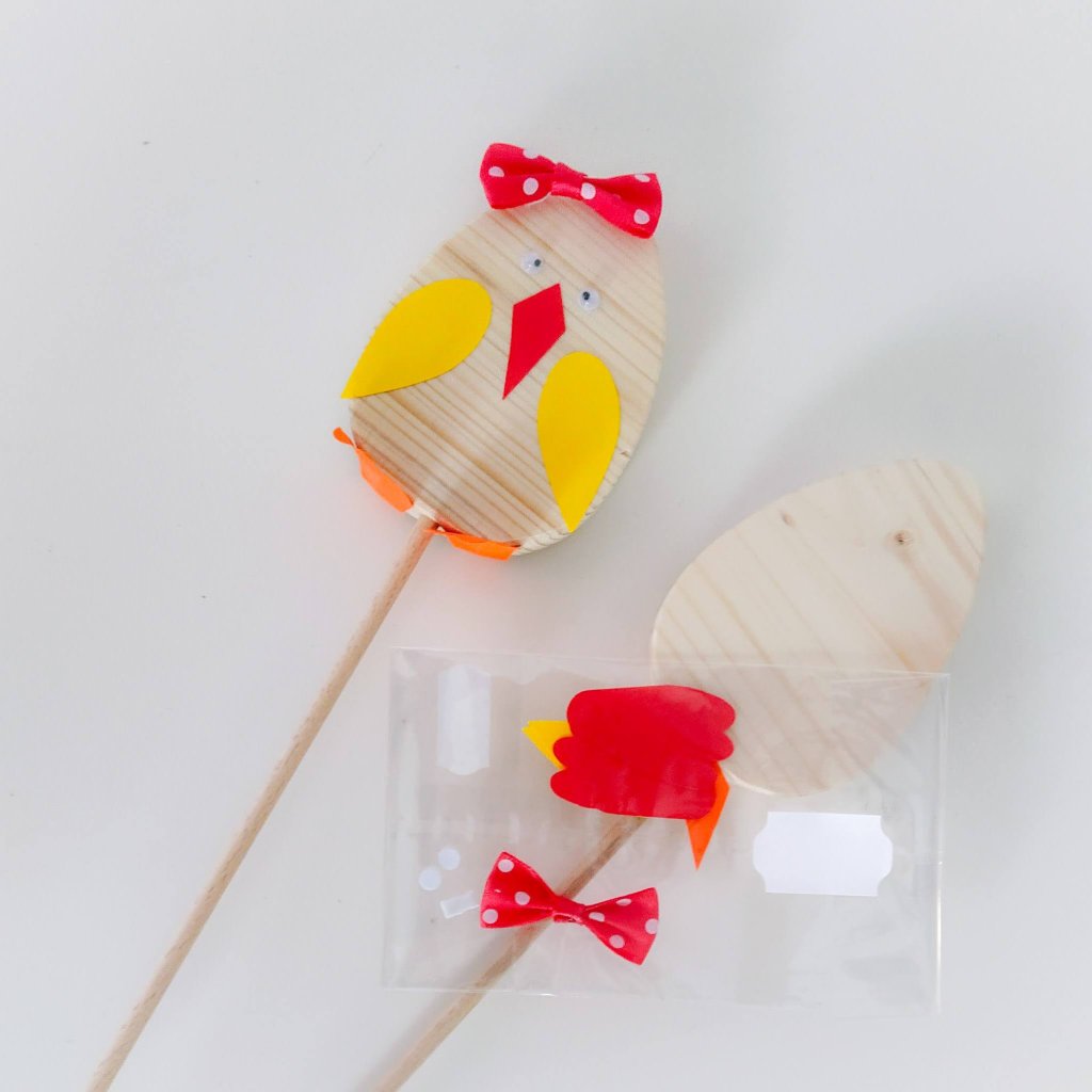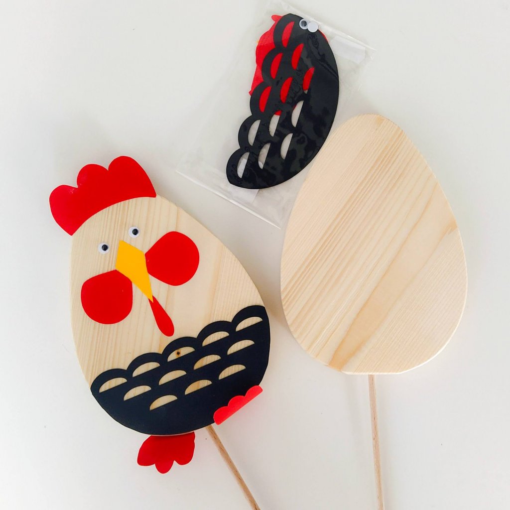 Sada se skládá z dřevěného výrobku včetně dřevěného zápichu a ze sáčku s komponenty - očička, zobáček, mašlička, nohy popř.sukýnku u slepice.