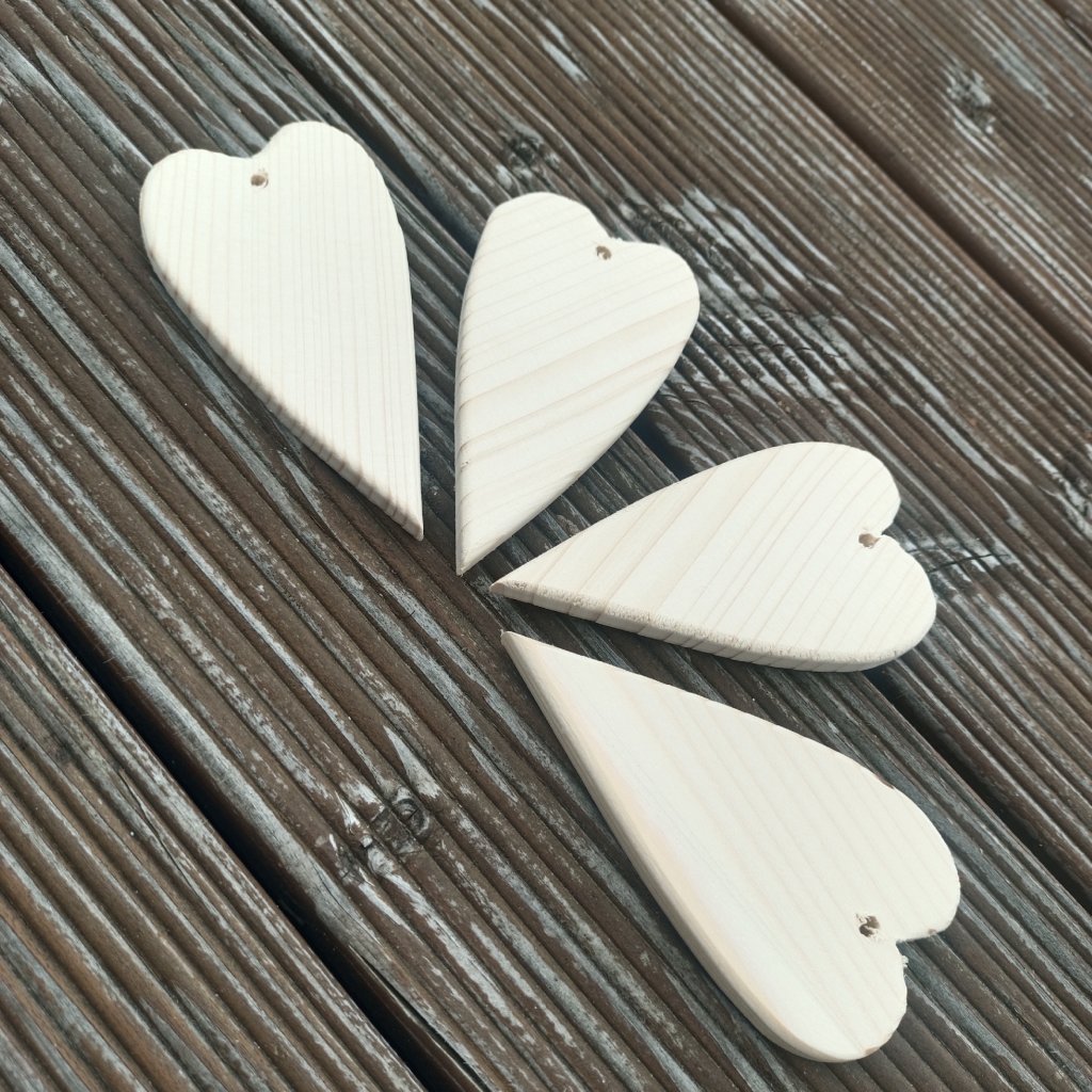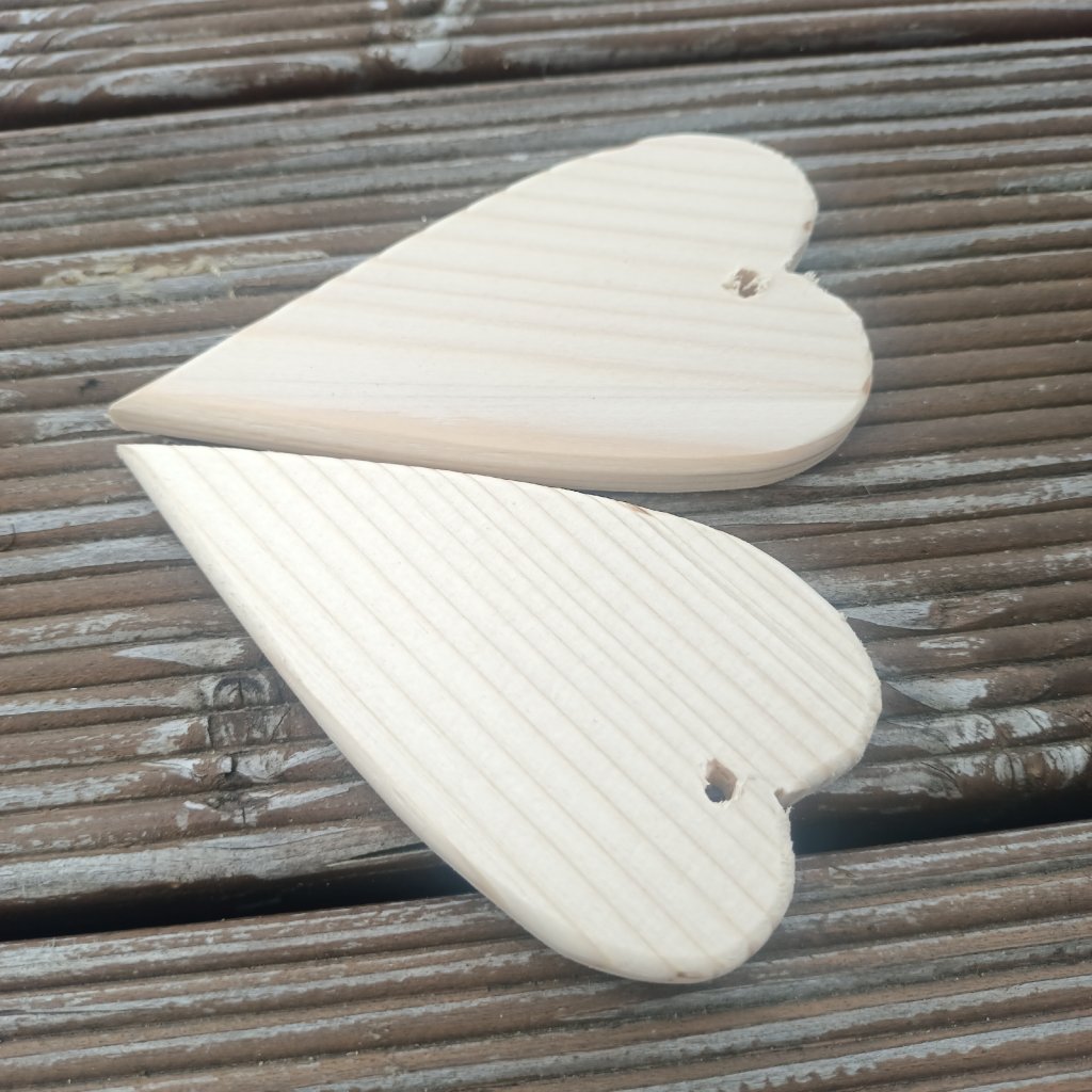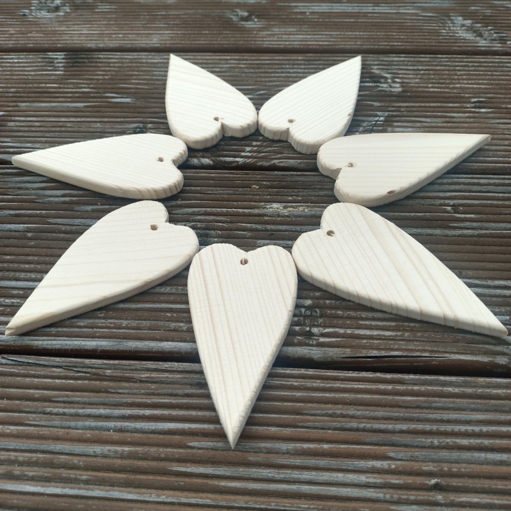 Srdíčko z čistého dřeva je tvarem užší a delší. Hodí se především k dekoraci věnců, stromečku, nebo výrobě zvonkohry. Srdce je s průvlekem pro navlečení provázku nebo drátku k zavěšení.
