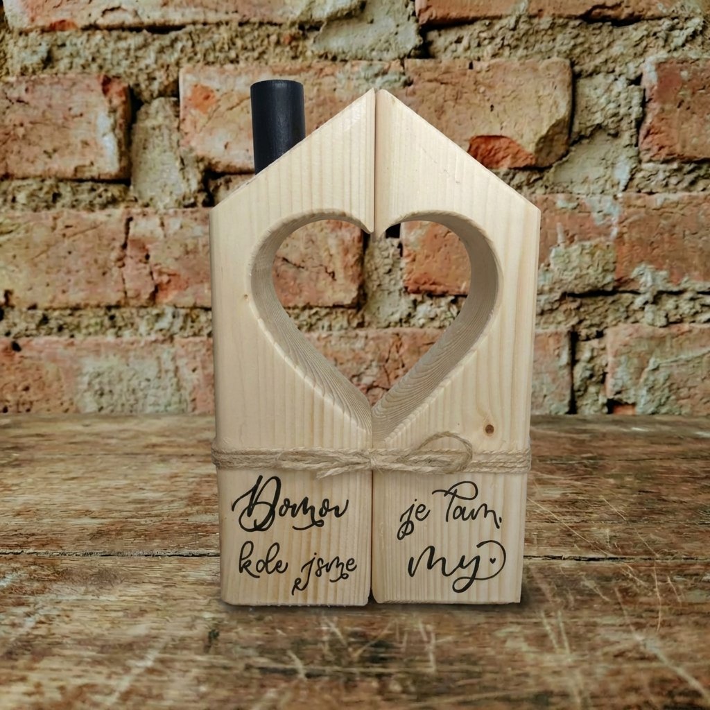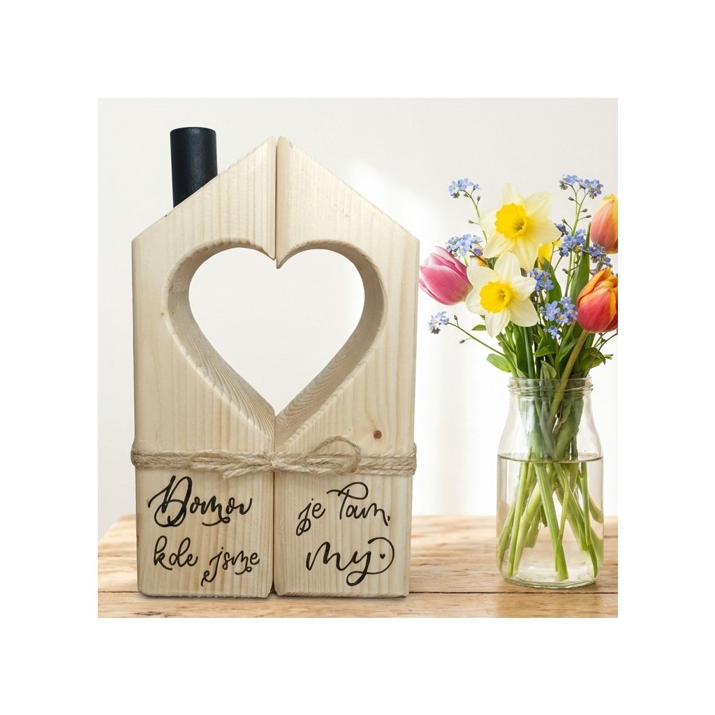 Náš svícen ze smrkového dřeva s výřezem srdce a měděným, černě barveným komínkem inspiroval autorku z dílny Krasopis a plánování. Ponechala domeček v přírodním provedení a ručně dopsala text "Domov je tam, kde jsme my". Může se tak stát krásným osobním dárkem. Vhodný po jednu vysokou svíčku o průměru 2 cm. Dodáváme převázaný provázkem.