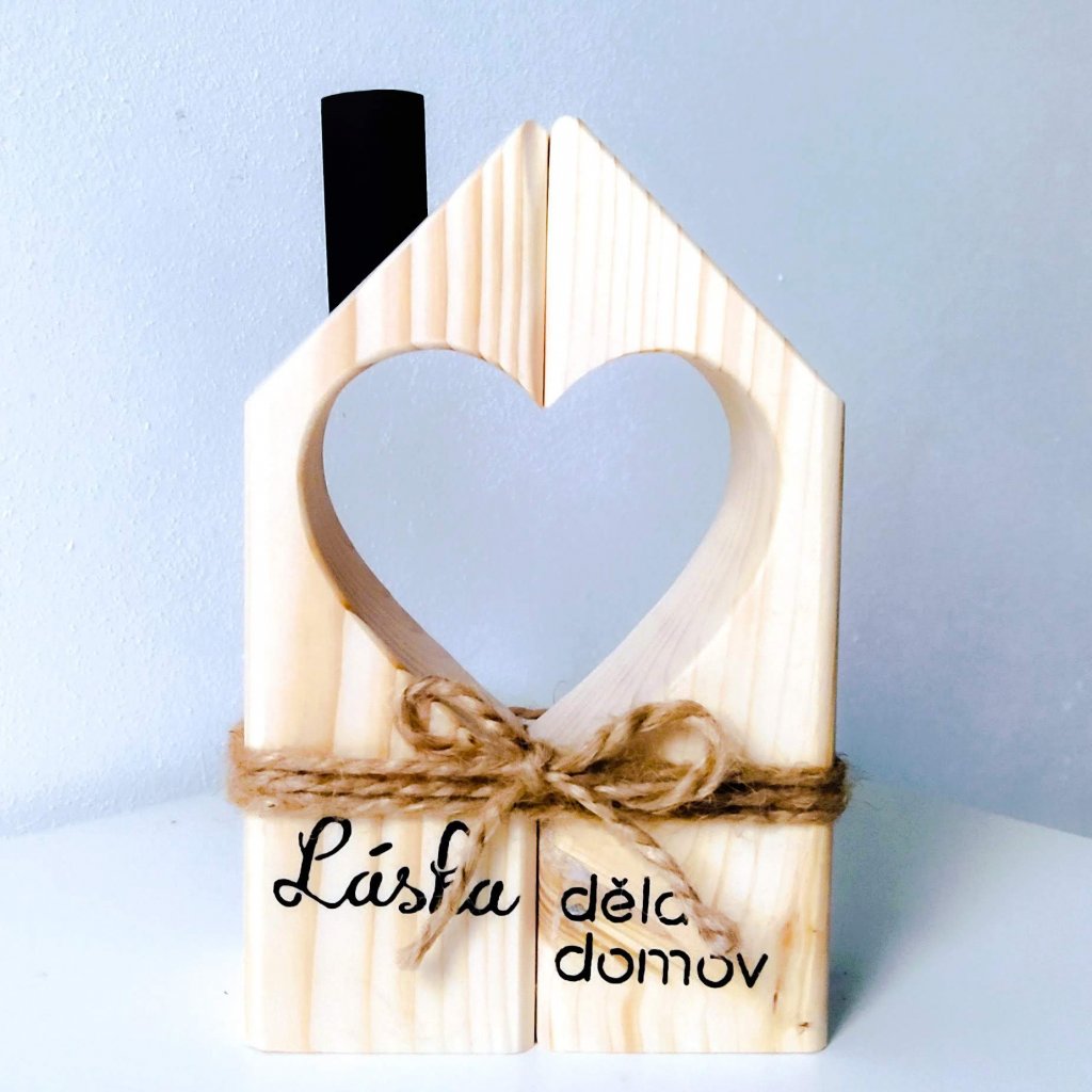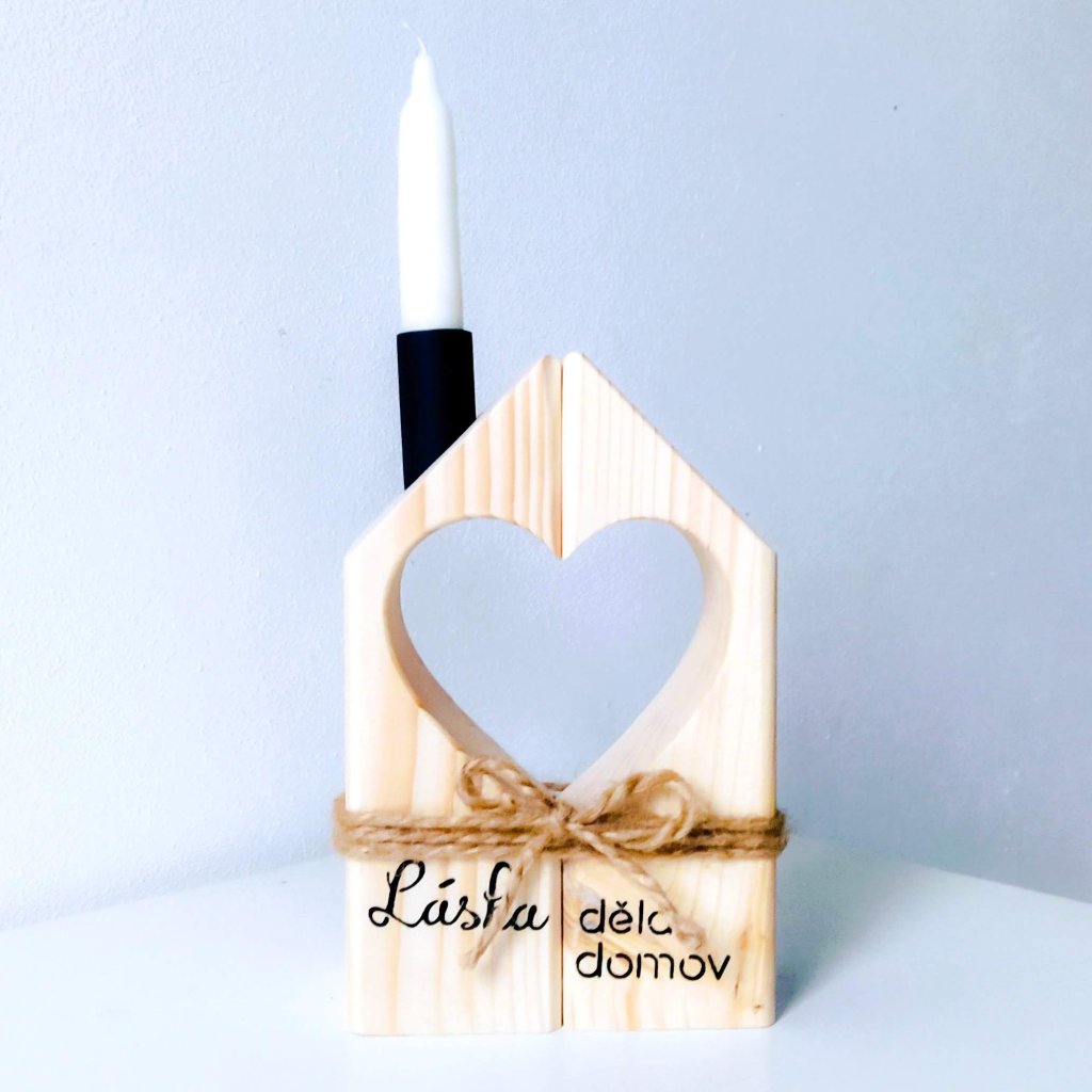 Svícínek je složený ze dvou domečků, které dohromady spojují vyřezané srdce, jako symbol domova, rodiny a lásky.