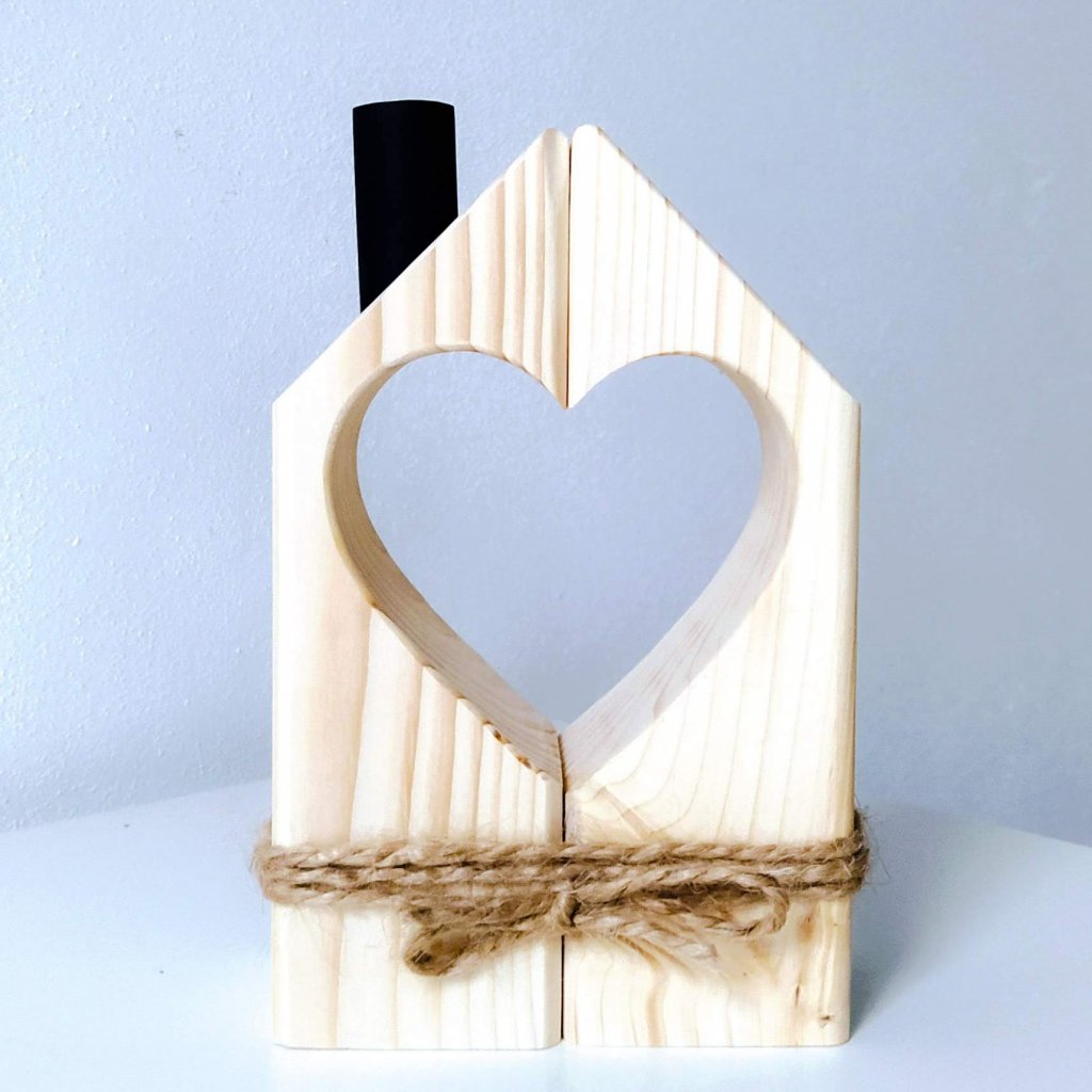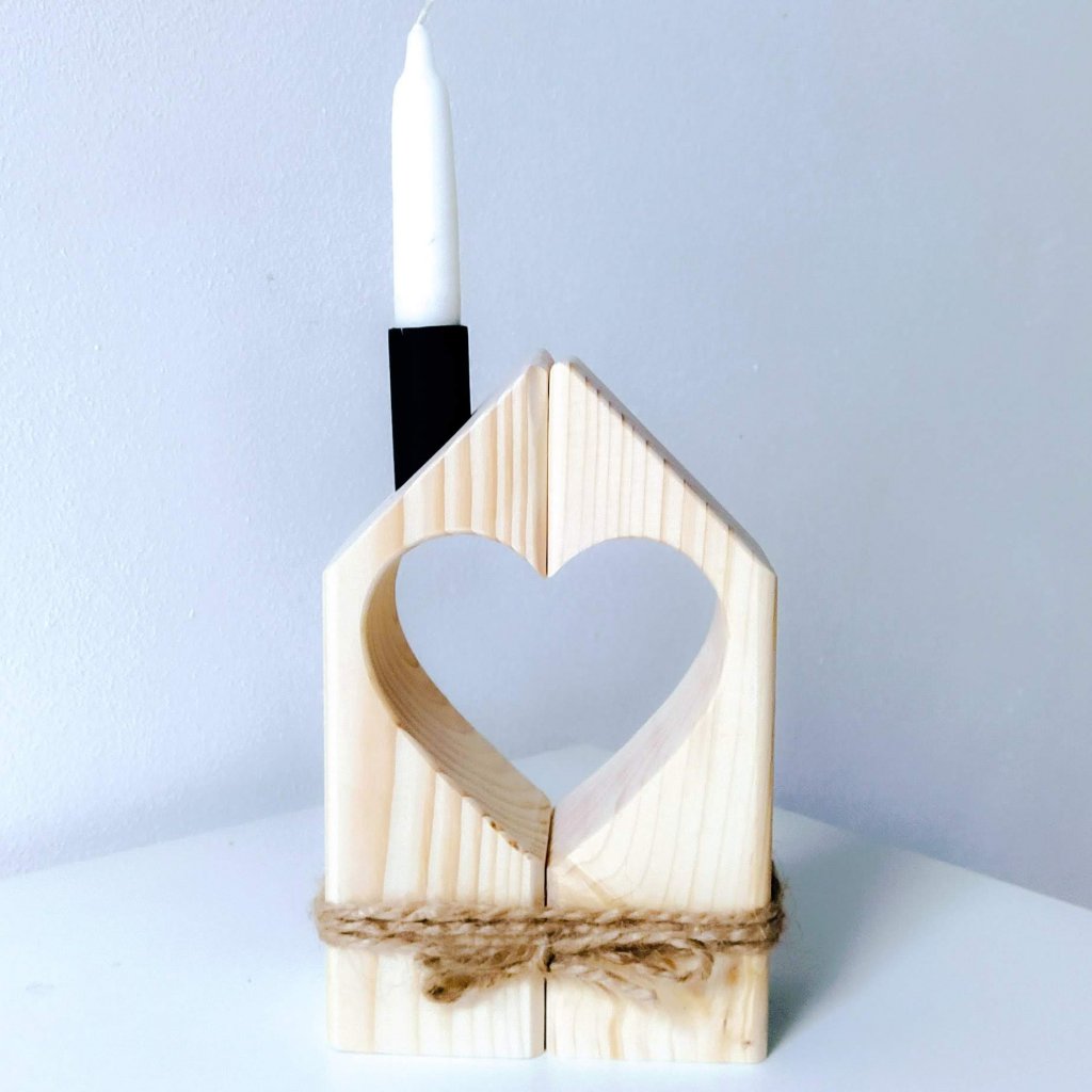 Svícínek je složený ze dvou domečků, které dohromady spojují vyřezané srdce, jako symbol domova, rodiny a lásky.