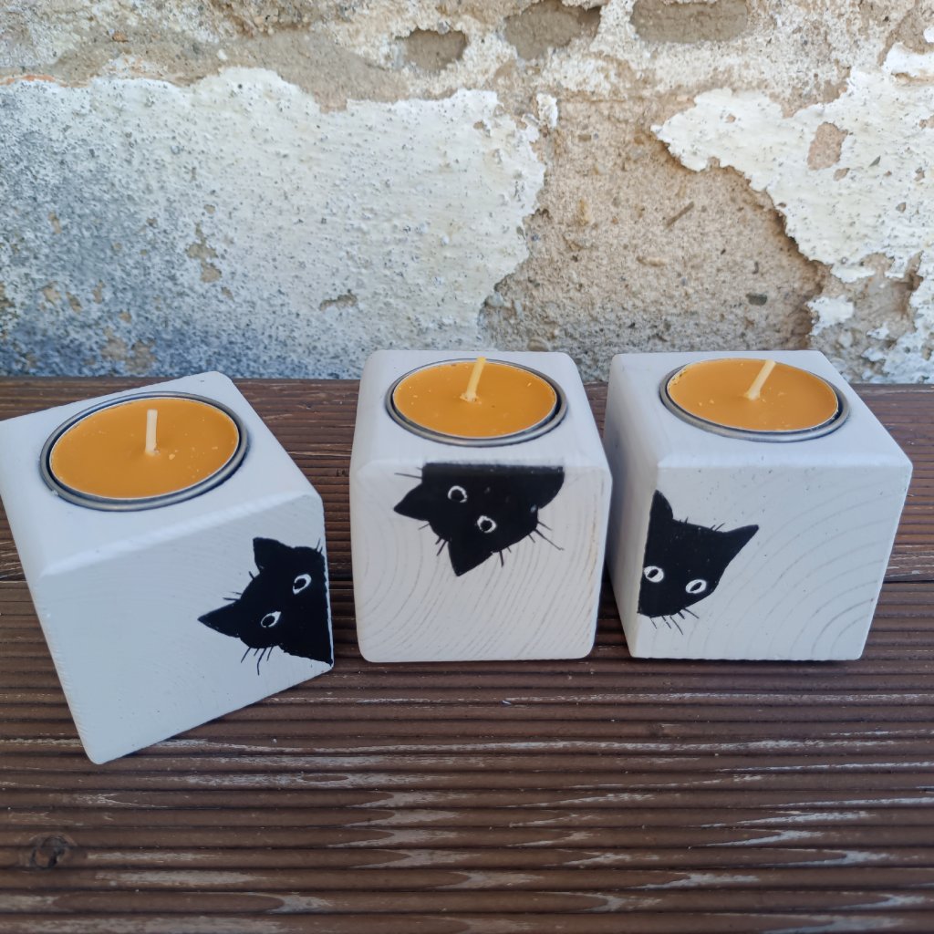 Dřevěné svícny ze smrkového dřeva z dílny oživdomov.cz malované rukou autorky BohuOwlEye černými kočičkami na světlounce šedém podkladu ve dvojím provedení. Kočky jsou na každé kostce vždy ze dvou stran proti sobě, zepředu a zezadu. V horizontálním provedení se dívají kočičky shora a zespodu, ve vertikálním z pravé a levé strany. Hodí se pro milovníky koček jako malá světelná dekorace nebo v sestavě dvojice, trojice a více svícnů.