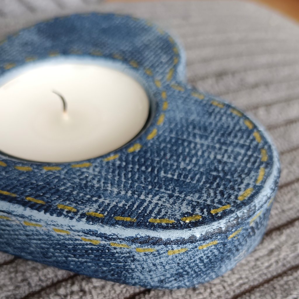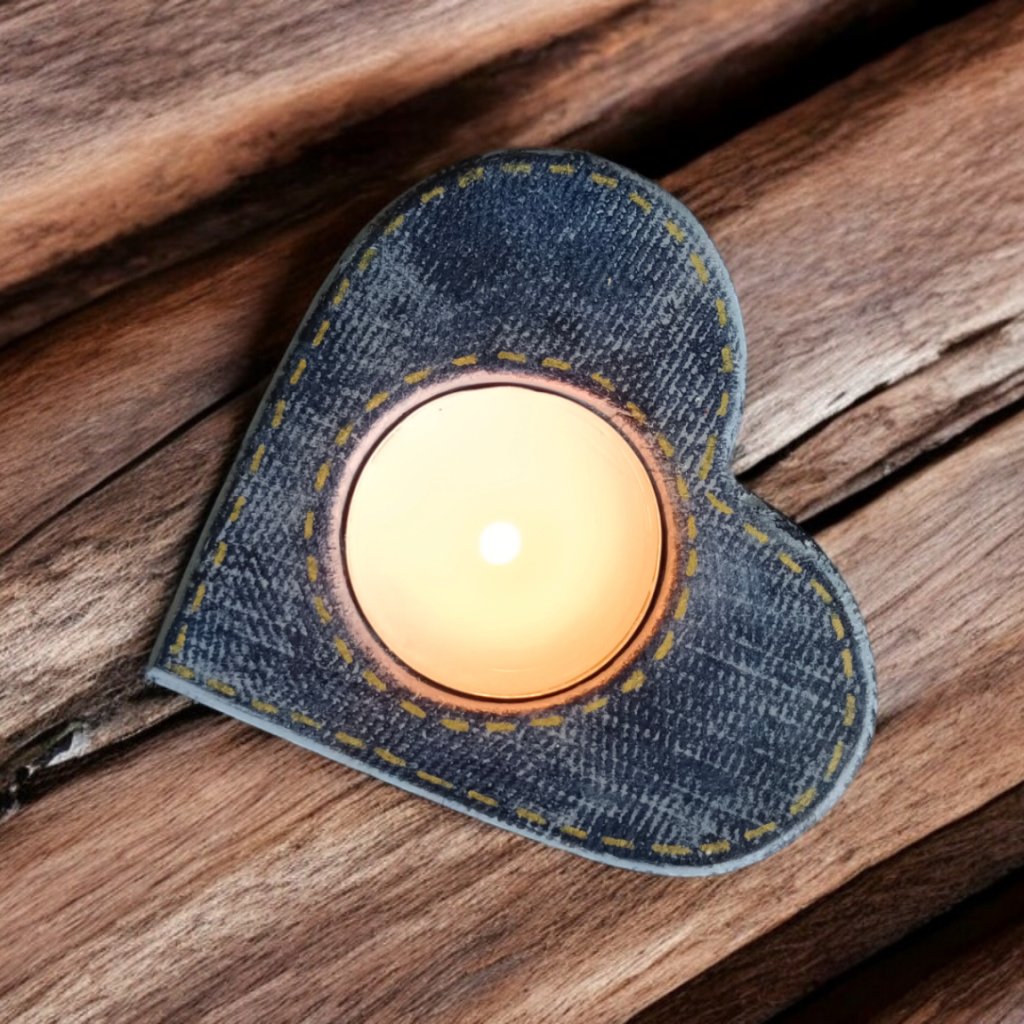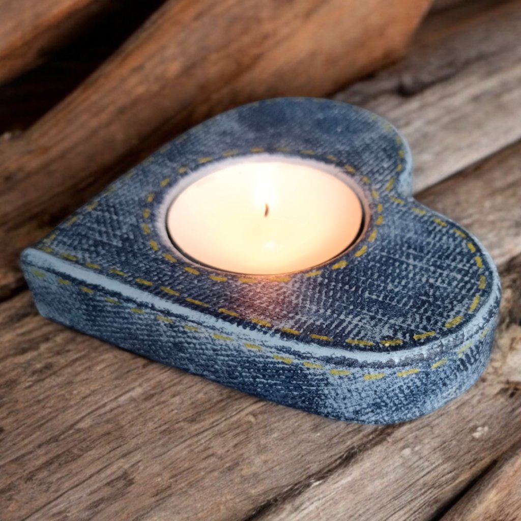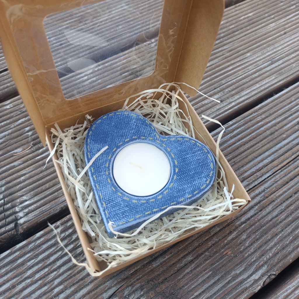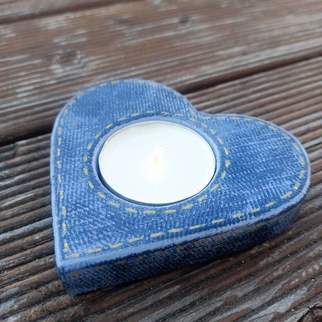 Ručně vyrobený dřevěný svícen Srdce "Džínová láska". Smrkové dřevo a speciální technika s denimovým efektem. Na čajovou svíčku (40mm). Dodáváno v kraftové krabičce s průhledem a výplní z dřevité vlny.