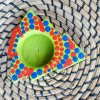 Ruční tečkování v různých barvách na smrkovém dřevě o tloušťce 2 cm. Zalakováno.