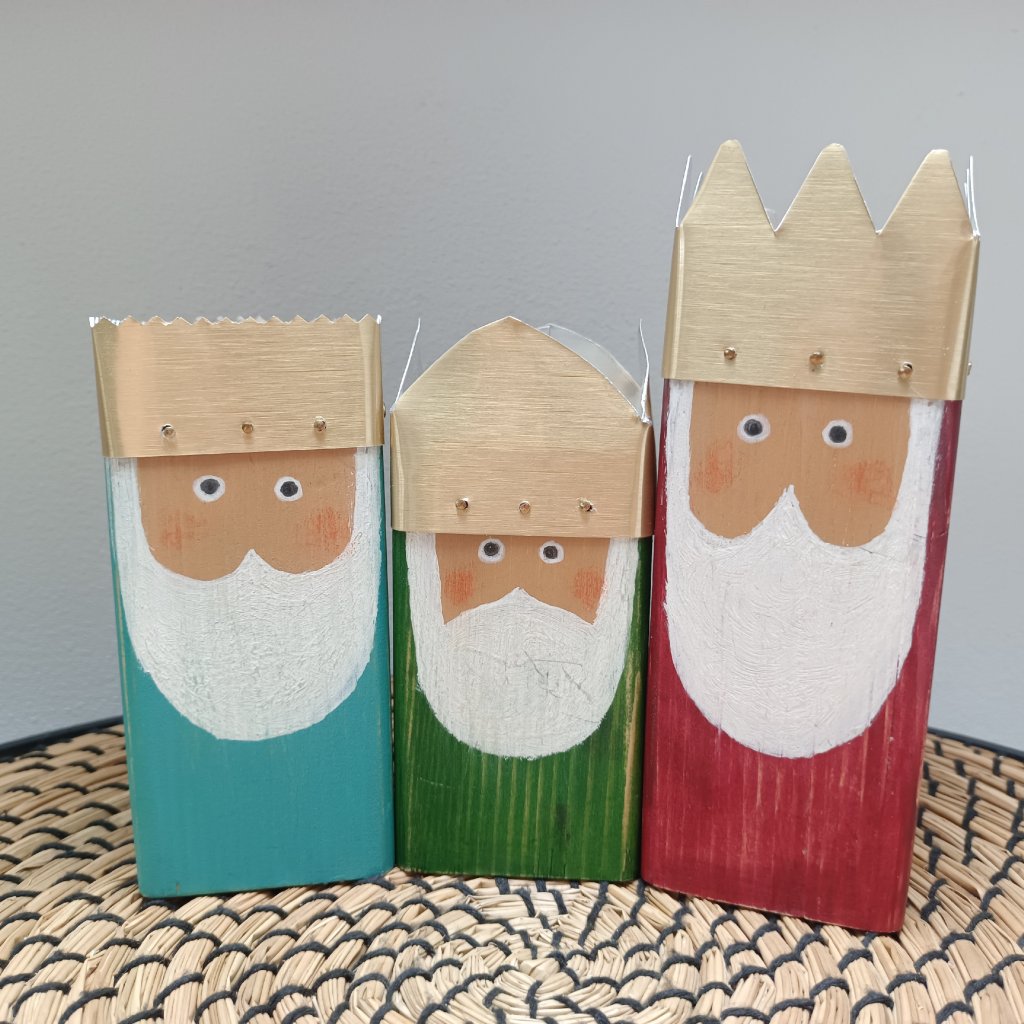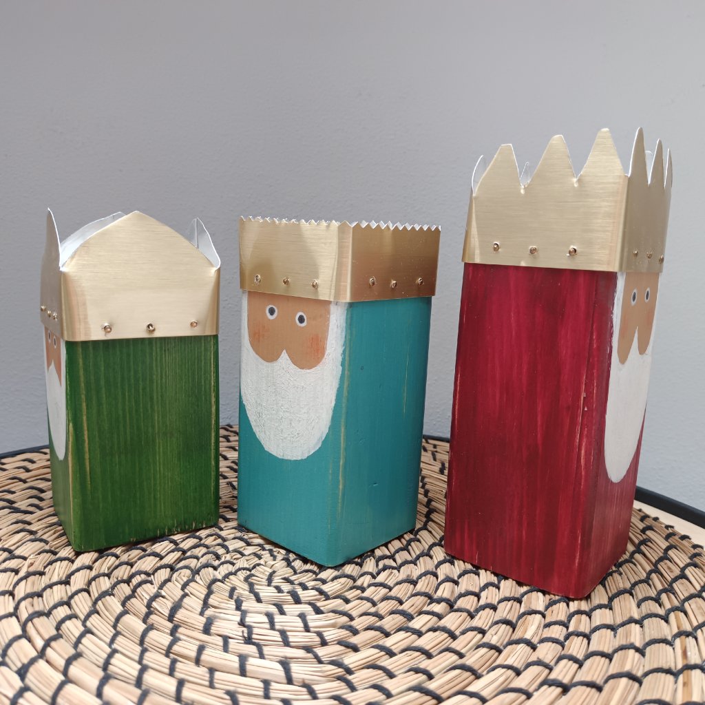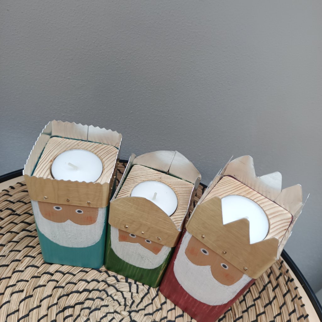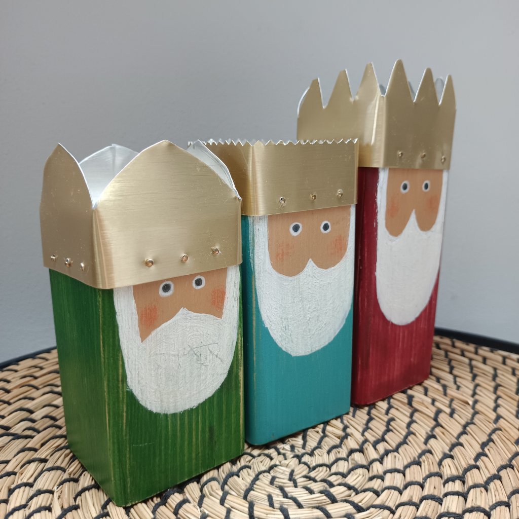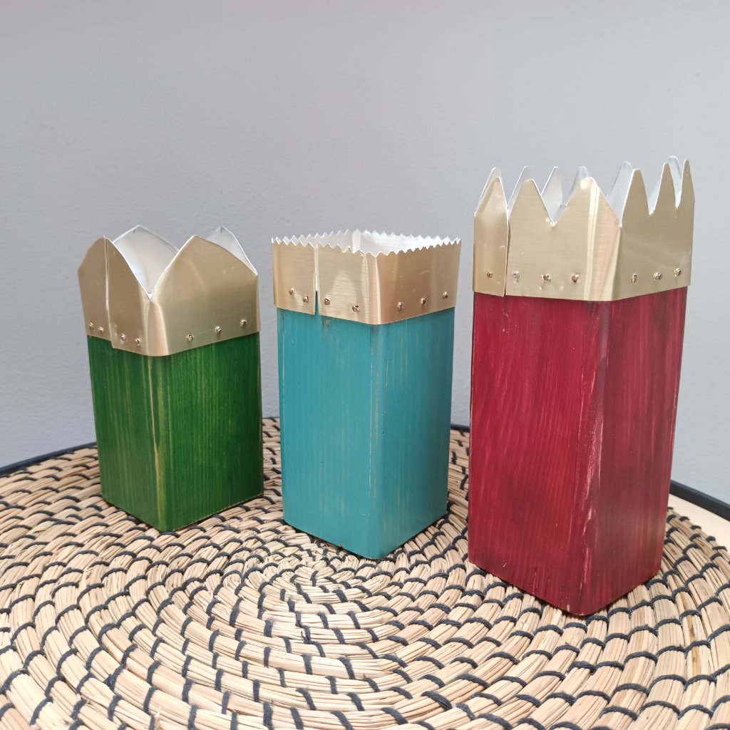Ručně malovaný svícen s kovovými prvky. Jedná se o autorskou tvorbu a každý kus je originál. Je tvořen třemi samostatnými kusy, které si rozestavíte podle potřeby. Postavy tří králů s korunou vyrobenou z plechu se zlatým efektem.