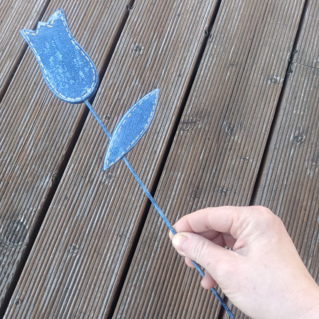 Ručně malovaný tulipán na dřevěné tyčce ladí do kolekce výrobků "Džínová láska". Smrkové dřevo a speciální technika s denimovým efektem.
