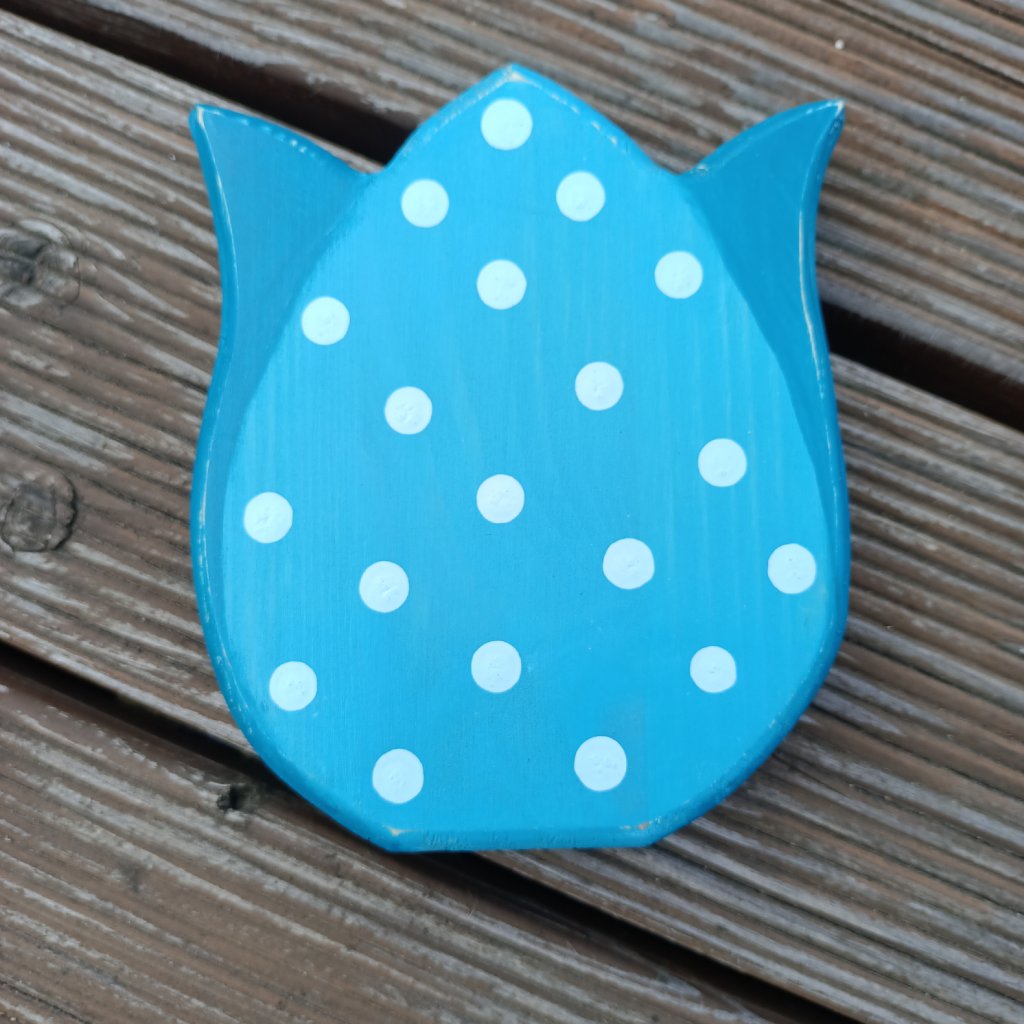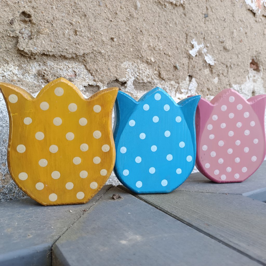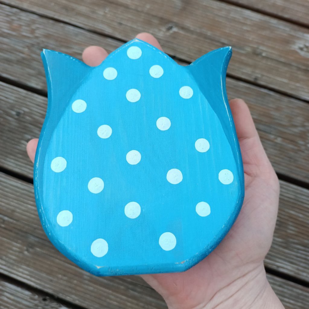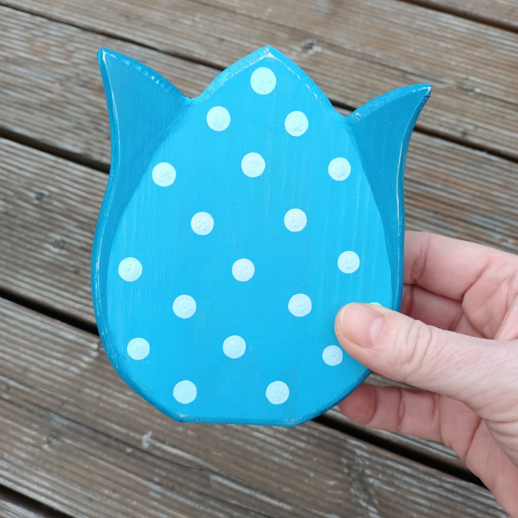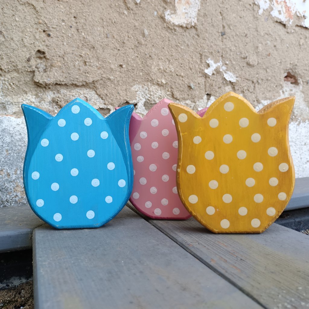 Dřevěný tulipán s květem doslova o velikosti dlaně. Díky svojí větší tloušťce může stát jako samostatná dekorace. Vyrobeno z borovicového dřeva a ručně malováno akrylovými barvami. Zalakováno. Vynikne na poličce i stole samostatně i ve skupině.