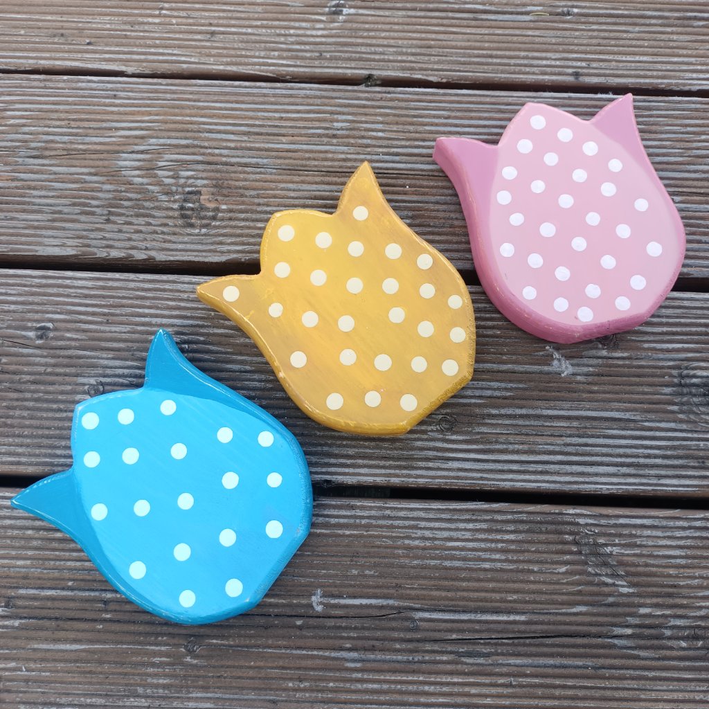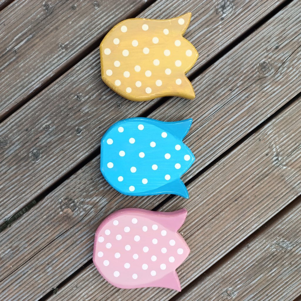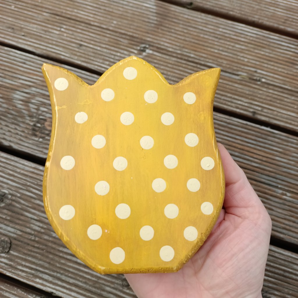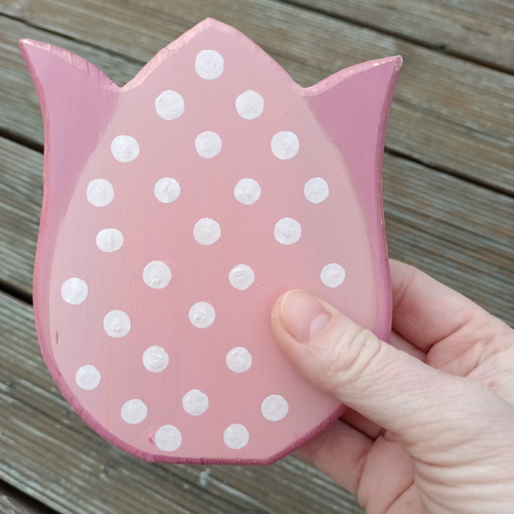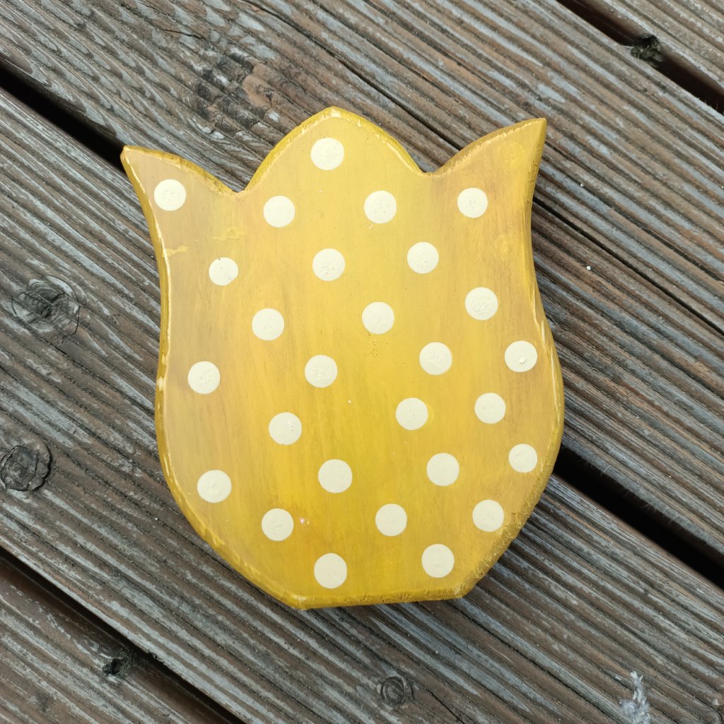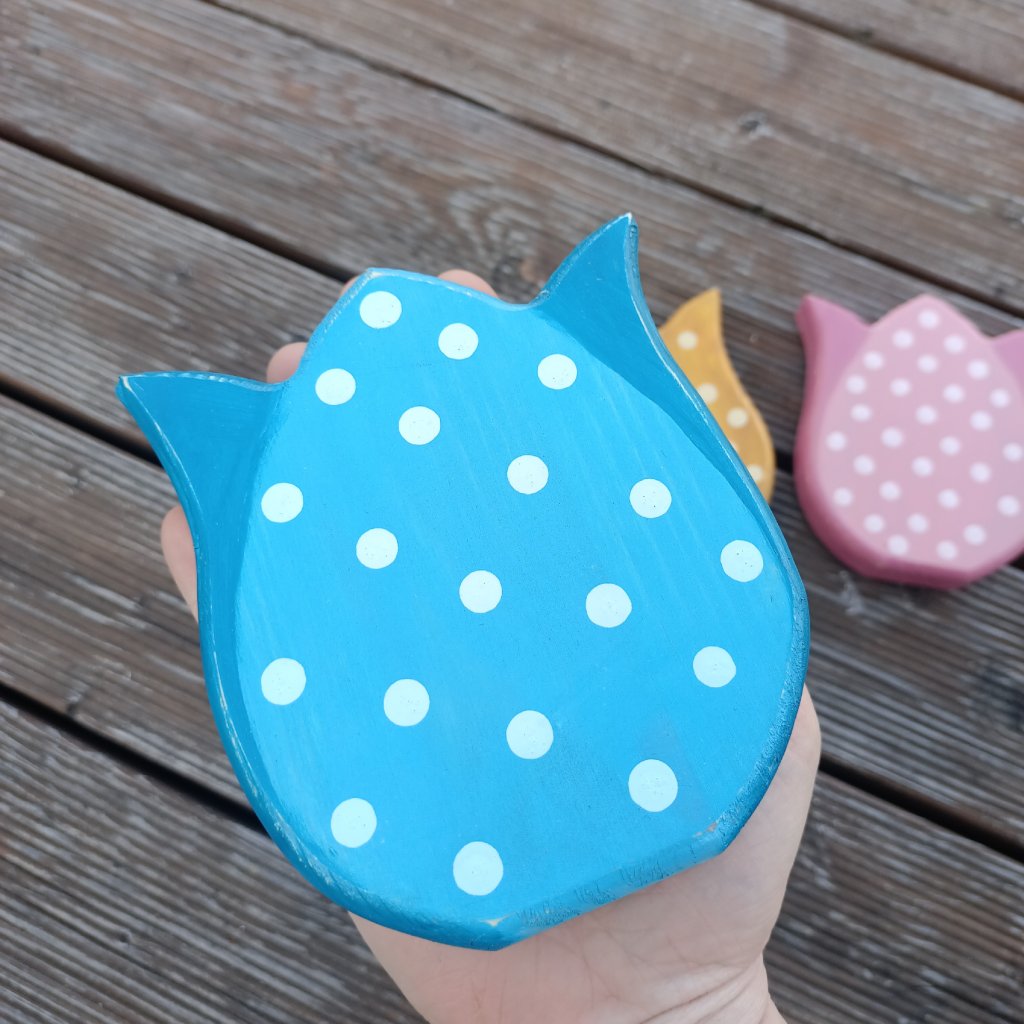 Dřevěný tulipán s květem doslova o velikosti dlaně. Díky svojí větší tloušťce může stát jako samostatná dekorace. Vyrobeno z borovicového dřeva a ručně malováno akrylovými barvami. Zalakováno. Vynikne na poličce i stole samostatně i ve skupině.