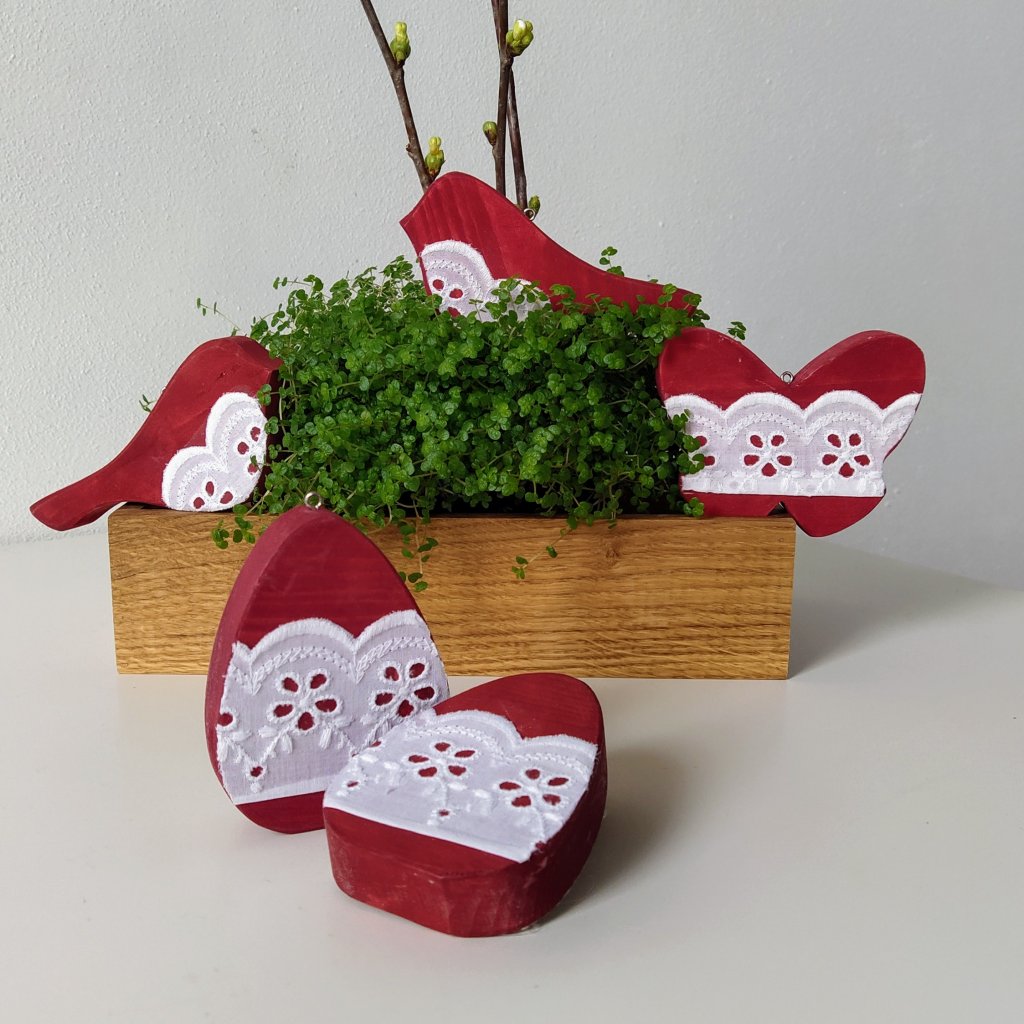 Sada 5 kusů jarních dekorací k zavěšení. Dekorace je v červené barvě s krajkovými doplňky. Krajka je aplikována z obou stran. okraj je bez krajky.