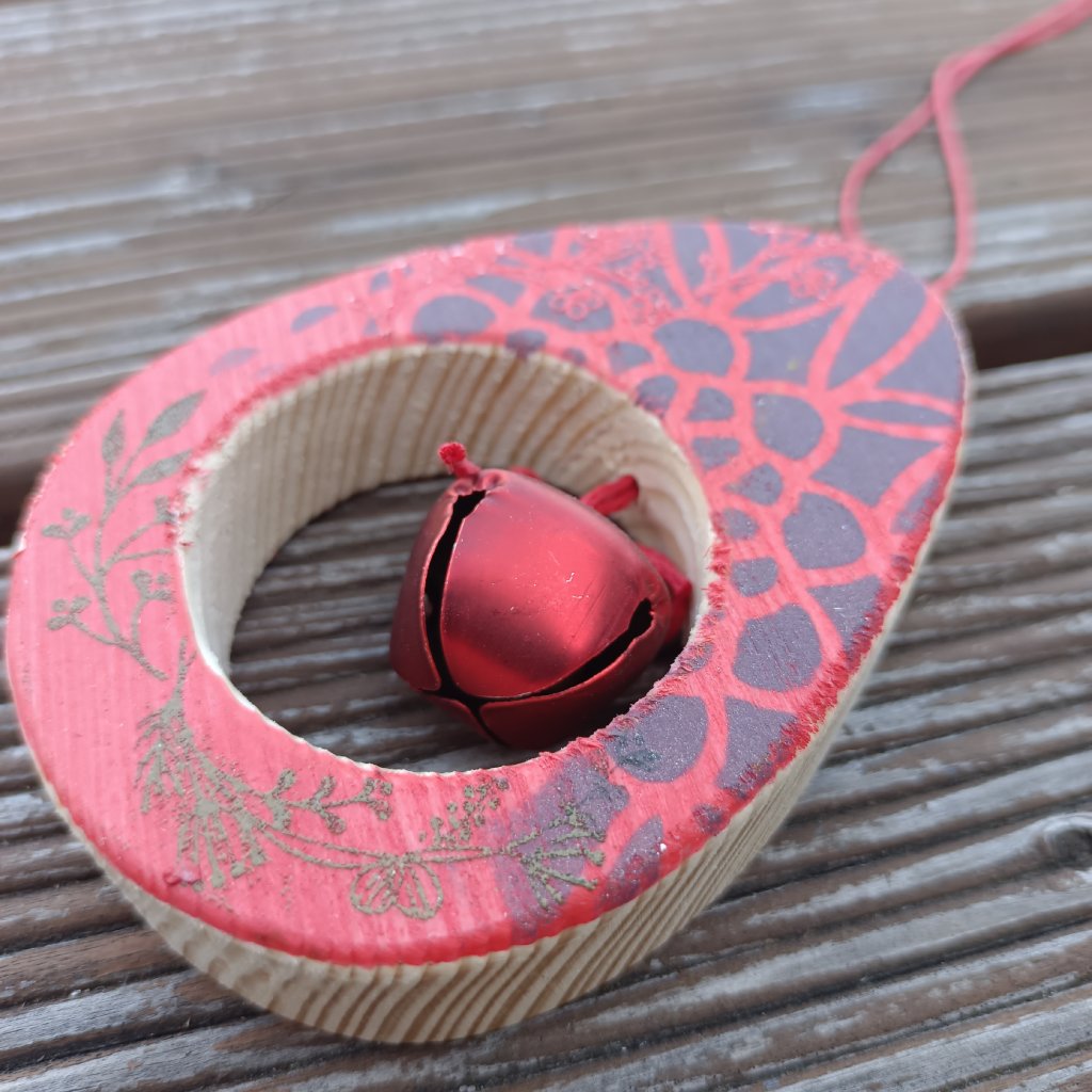 Zavěšeno na červeném provázku s červenou rolničkou. Dekorace je oboustranná. Ruční výroba.
